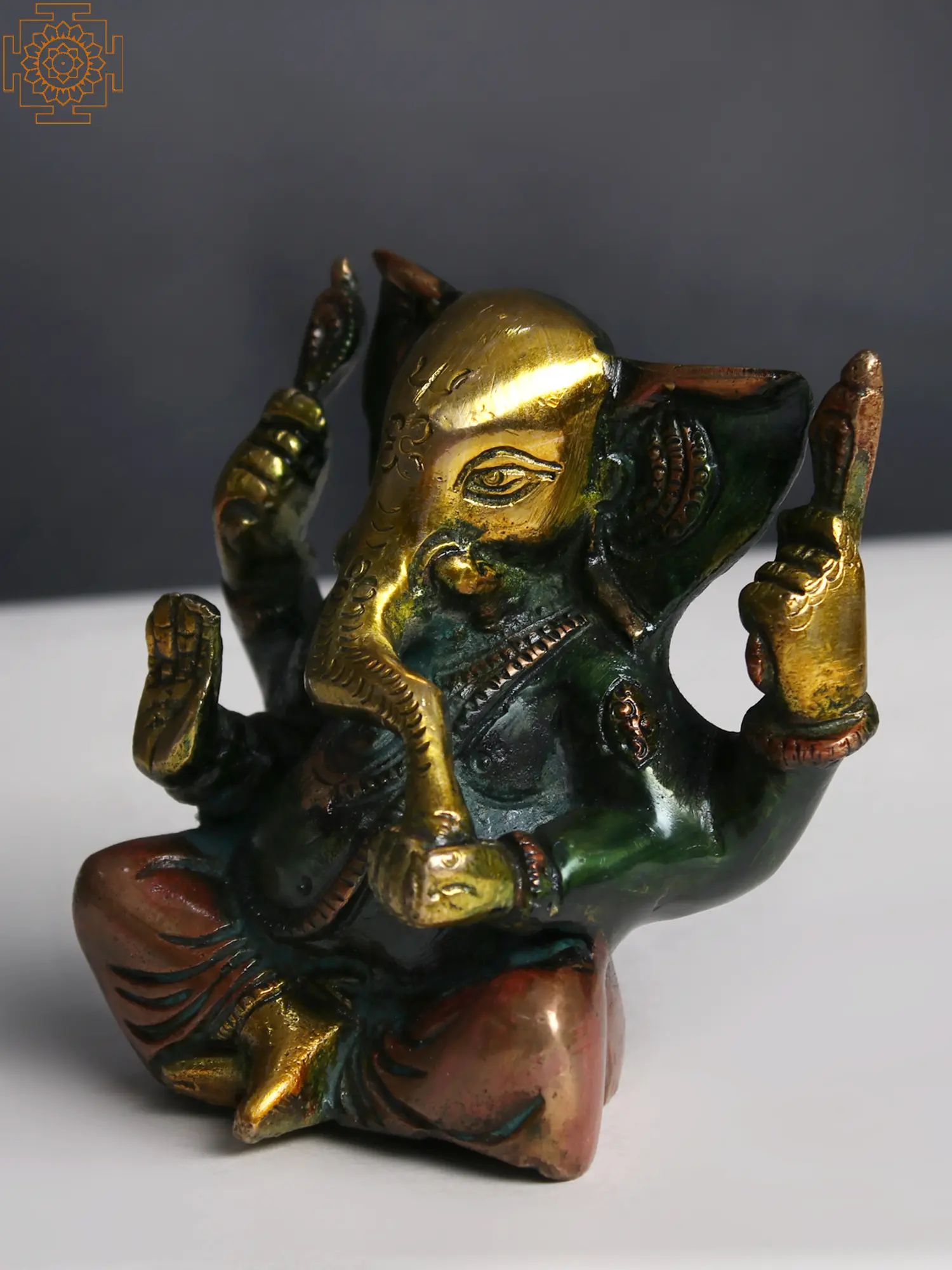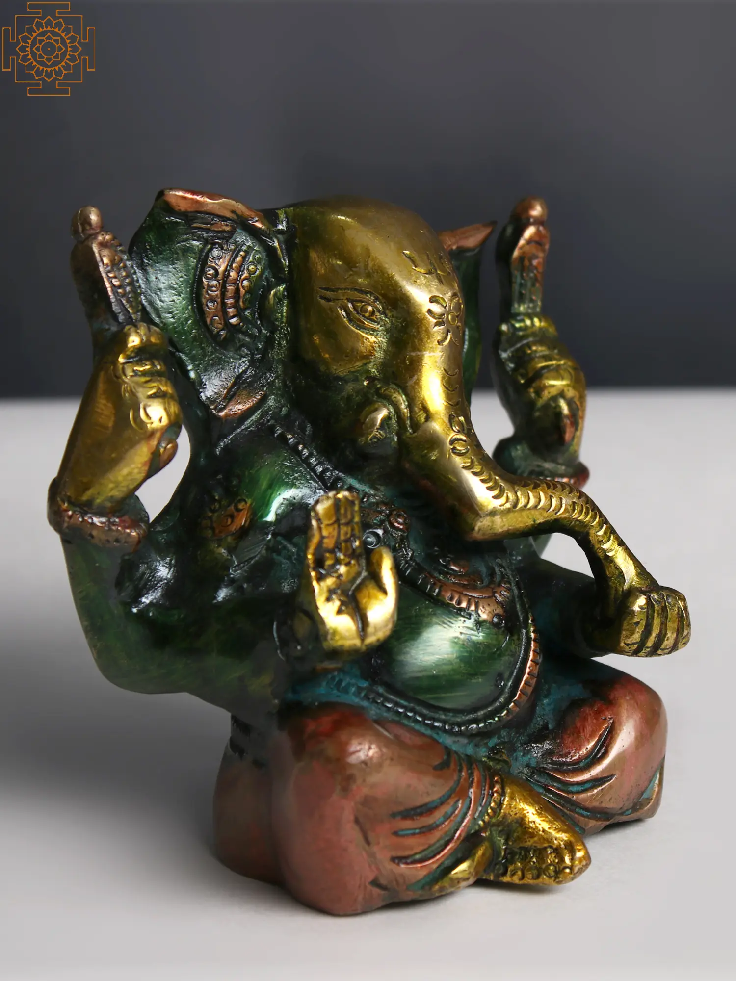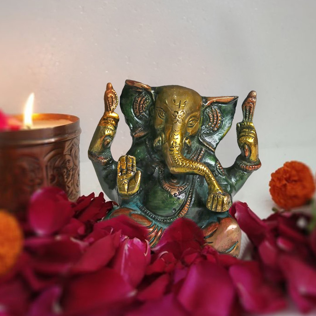 Infuse your surroundings with the vibrant charm of this Brass Ganesha - a magnificent creation that radiates positivity. This captivating sculpture is adorned with a rich palette of enchanting colors, adding a touch of elegance to your space.