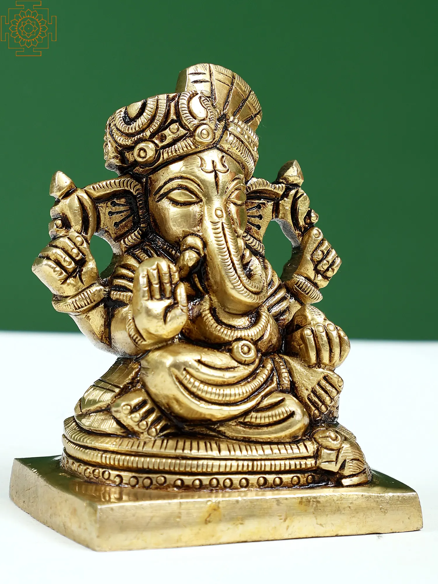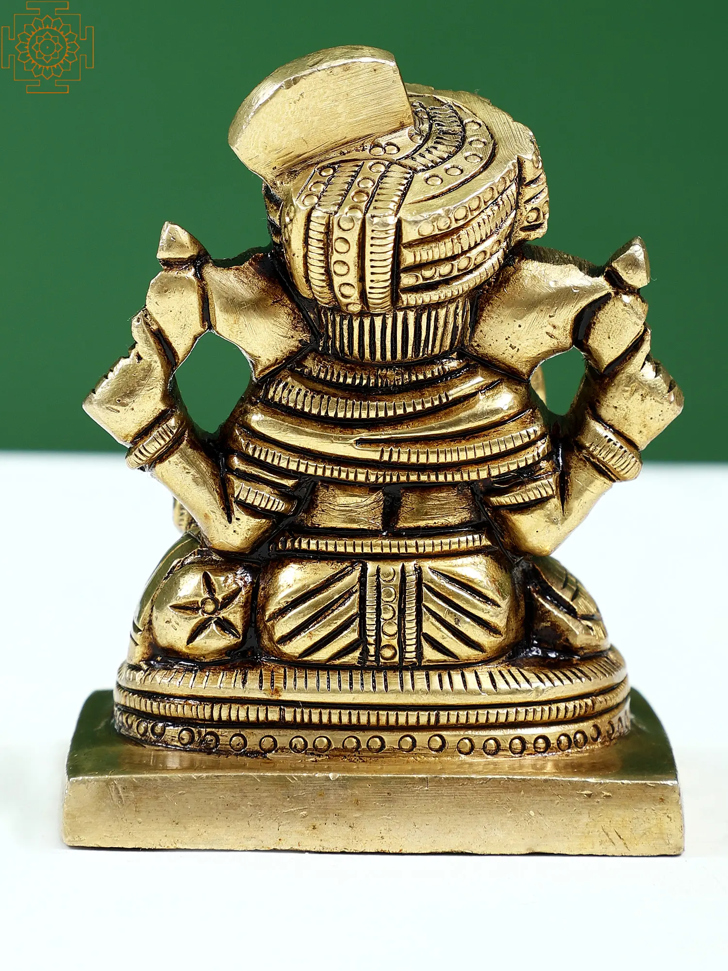 The exquisite small Brass Raja Ganapathy sculpture radiates Ganapathy's royal aura. Seated in a regal posture, he signifies wisdom and auspiciousness. His large ears signify keen perception, and the lotus symbolizes purity. Holding a modak, he blesses with the sweetness of rewards. The conch shell reflects his power to call upon divine energies. As the remover of obstacles, Ganapathy's blessings are sought before new beginnings. This artwork captures his majesty and benevolence, a gentle reminder that with his grace, life's hurdles dissolve, making way for fresh journeys.