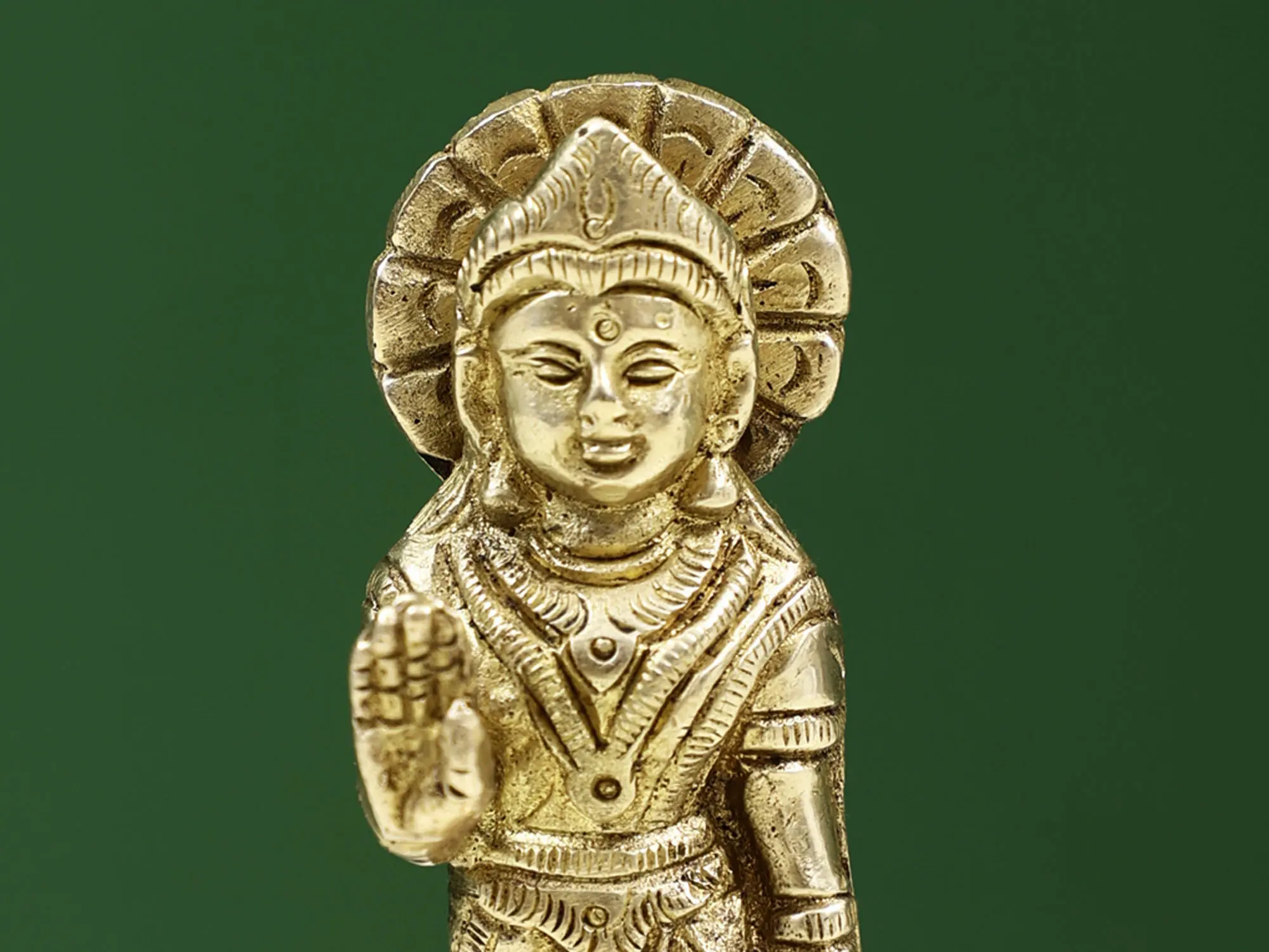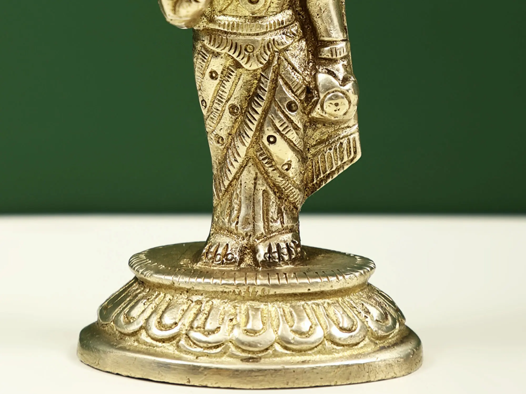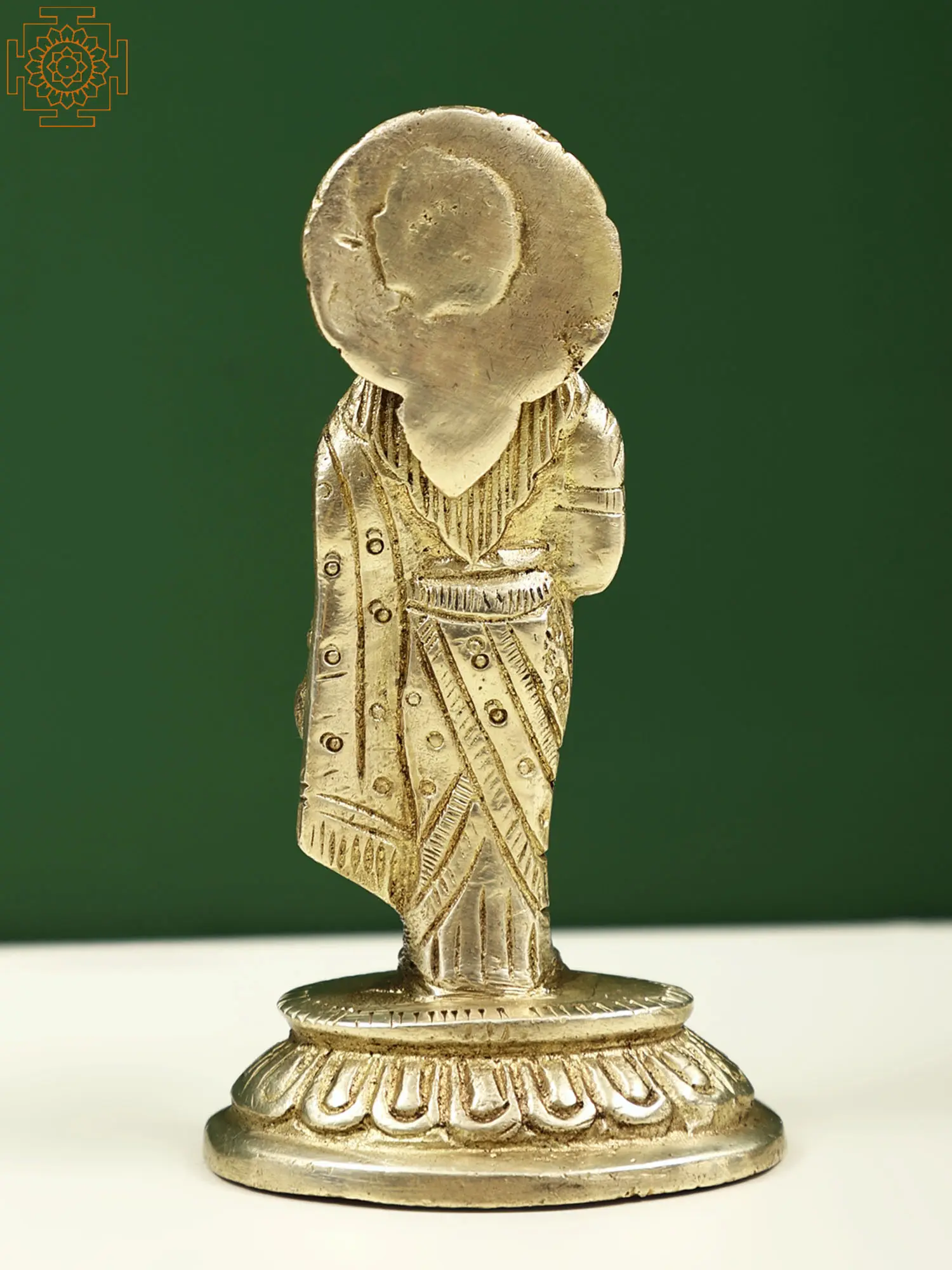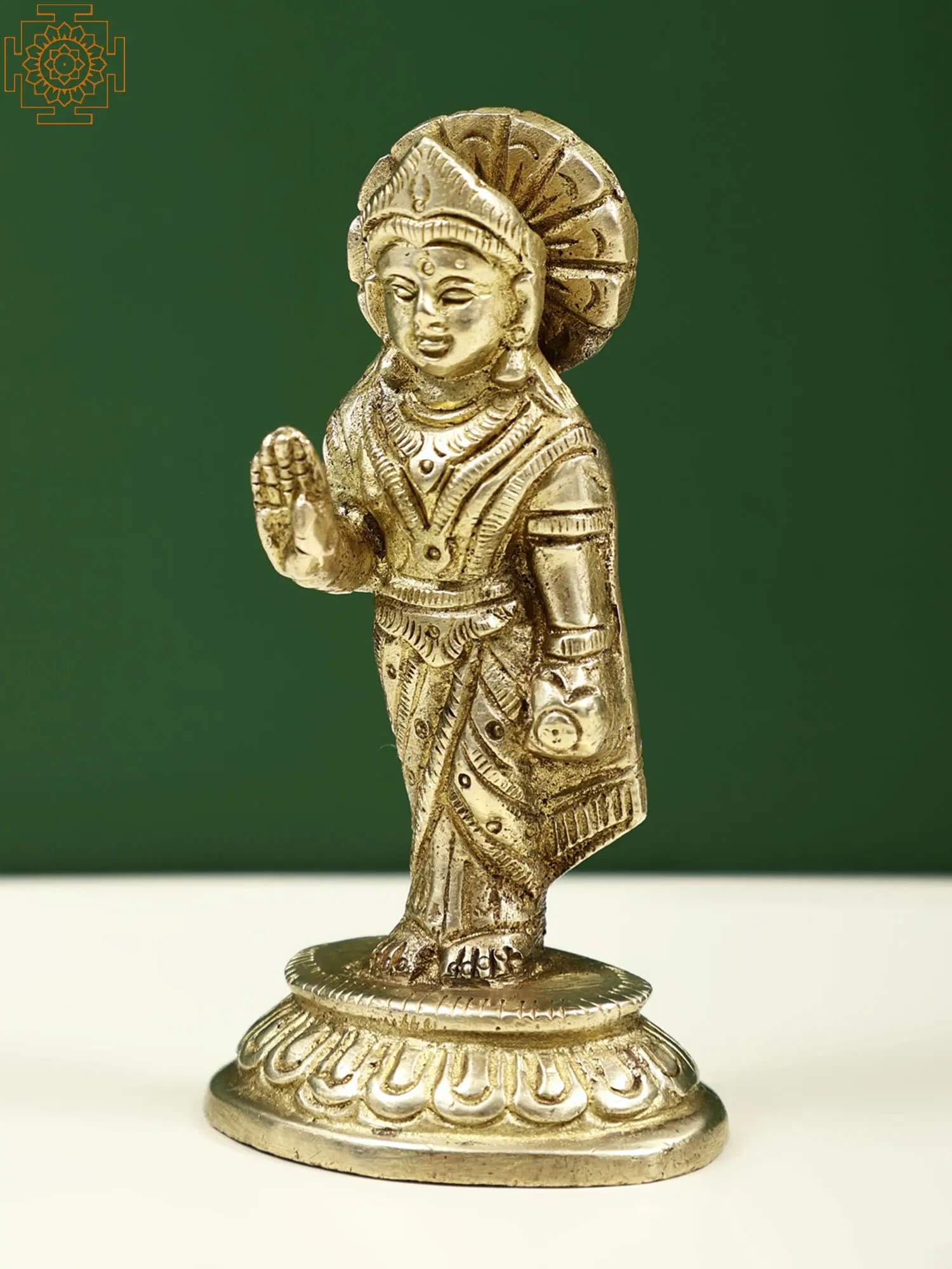 Maa Lakshmi in this brass murti is standing on a padmapeetha (lotus-shaped platform), wearing an appealing saree, adorned with beautiful jewelry. On her head is a queenly tiara-like crown and in her hand is the lotus flower, an auspicious element in Hindu culture. Goddess Lakshmi has her right hand raised in the gesture of fearlessness, in this compact brass idol, excellent for keeping in your place of work to receive constant benedictions of Mata Lakshmi.