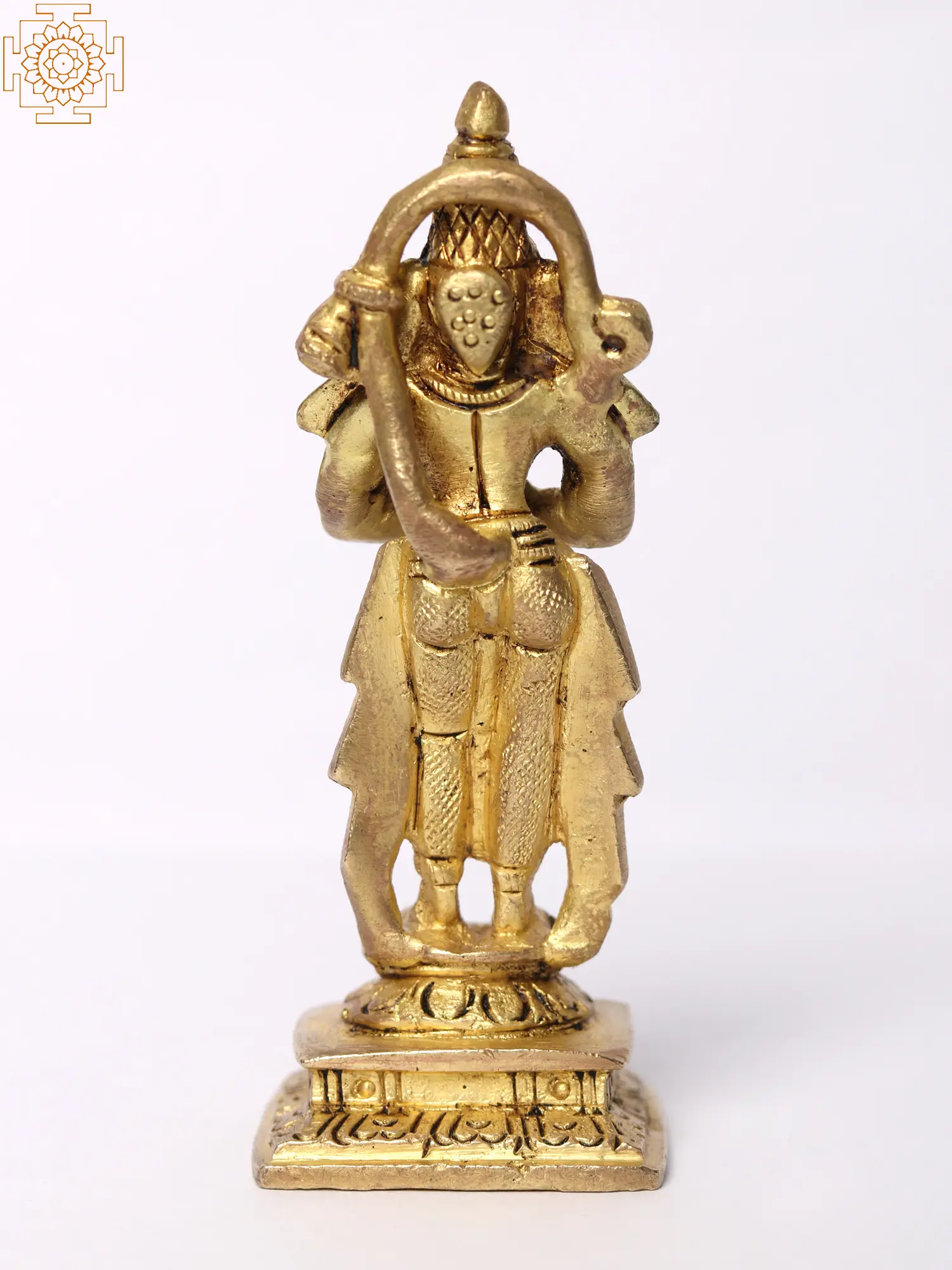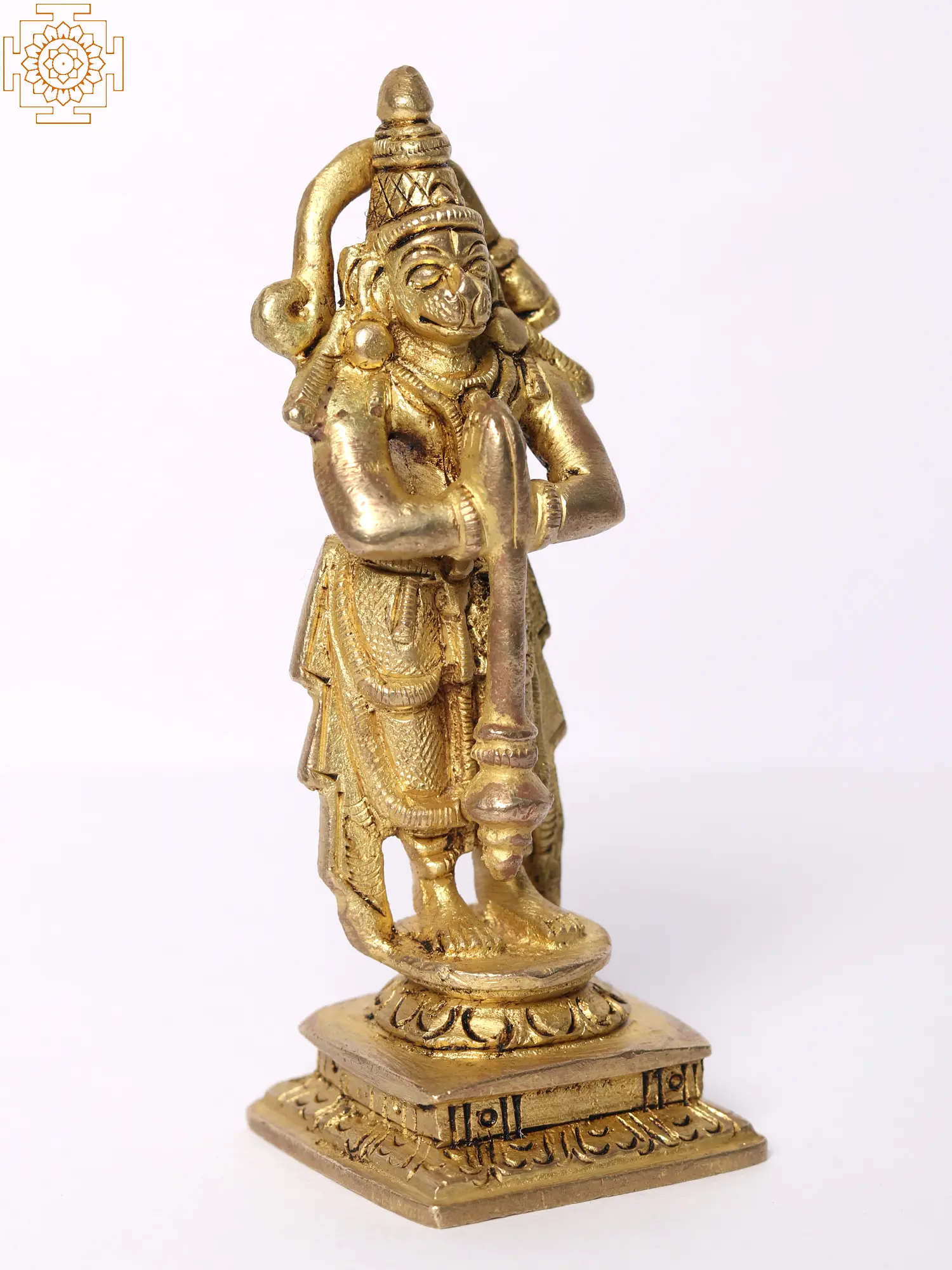 Crafted with reverence, this small brass sculpture captures the essence of Lord Hanuman's divine form. The lustrous brass surface, polished to perfection, radiates a warm golden glow, inviting you to embark on a transformative journey of self-discovery and spiritual growth. In Hanuman's hands, he gently assumes the Anjali Mudra, the gesture of salutation and reverence. This mudra symbolizes the unity of the individual soul with the divine, expressing humility, respect, and devotion- conveying him as RamDuta. Additionally, Hanuman holds his mighty Gada, a symbol of strength, power, and protection. The Gada represents Hanuman's formidable abilities and his unwavering commitment to upholding righteousness. It reminds us that strength is not merely physical but also encompasses moral fortitude, resilience, and the determination to stand up for what is right.