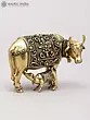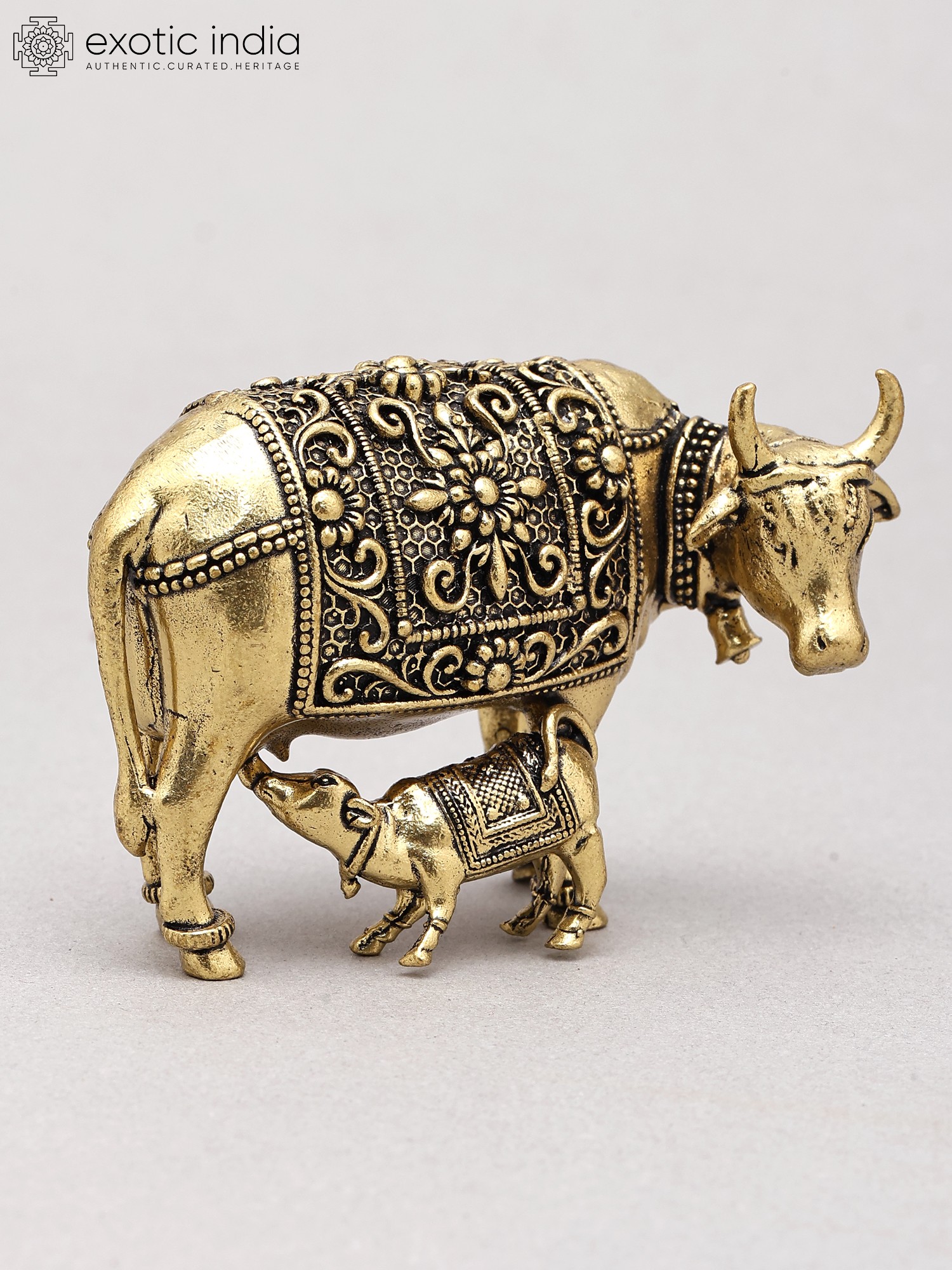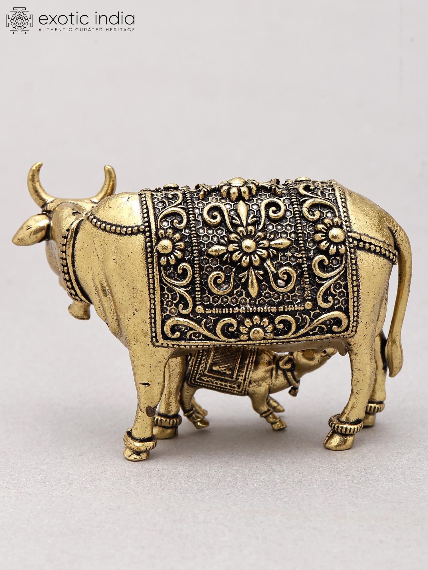 6" Superfine Brass Cow and Calf Statue with Lakshmi & Ganesha Carving