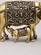 Brass Kamdhenu Cow and Calf Figurine with Engraved Gods and Goddesses