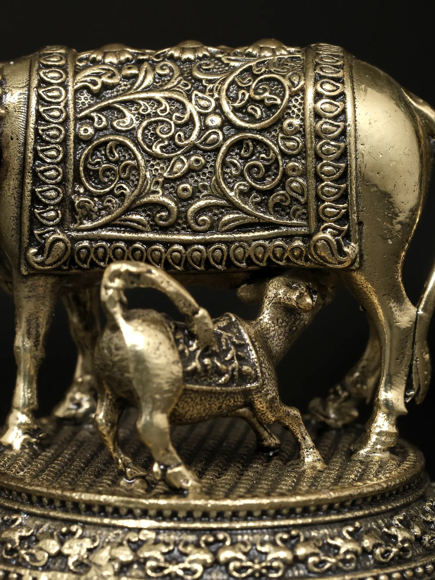 7" Superfine Divine Cow and Calf with Lakshmi Ganesha Engraving | Brass Statue