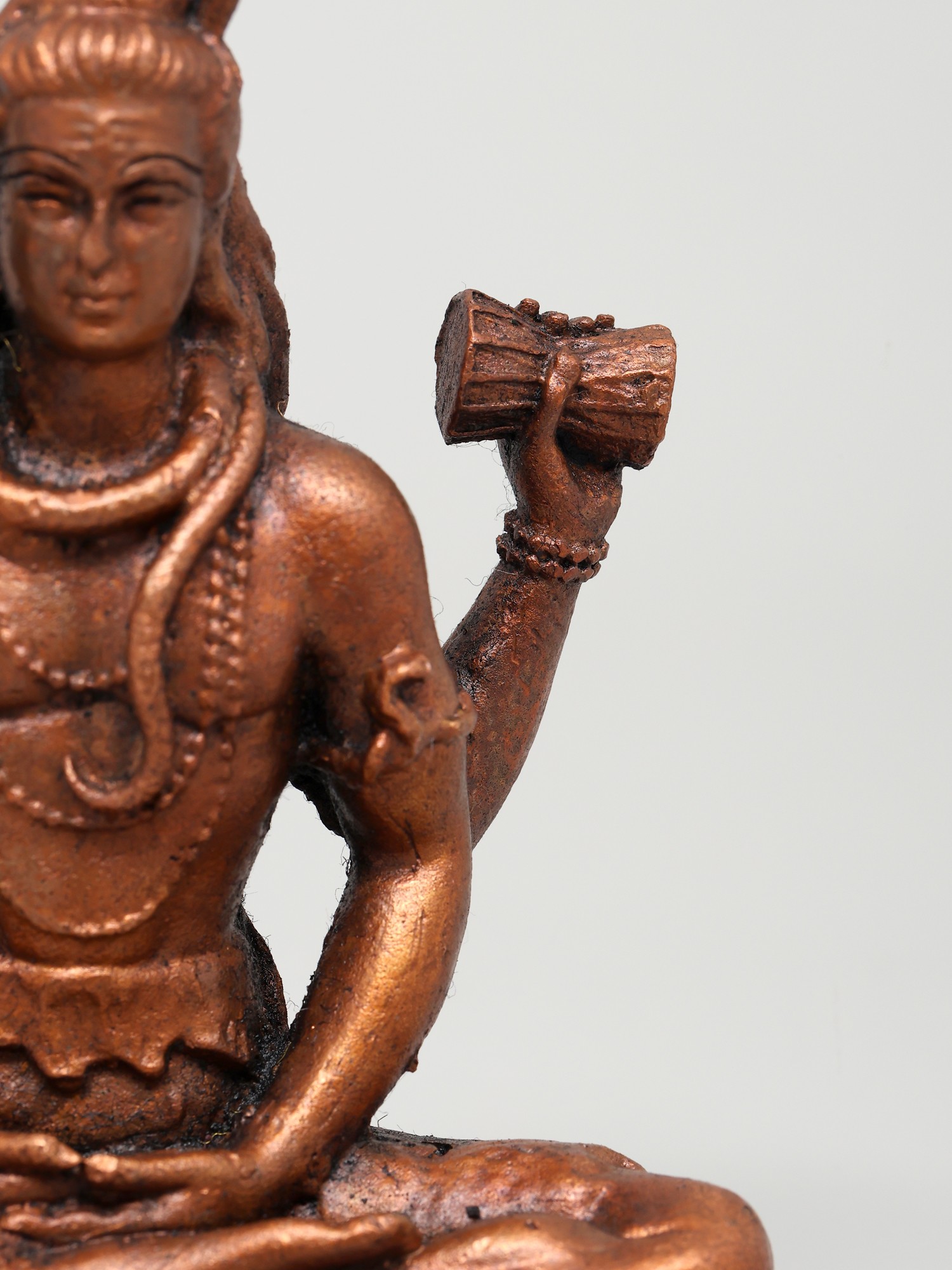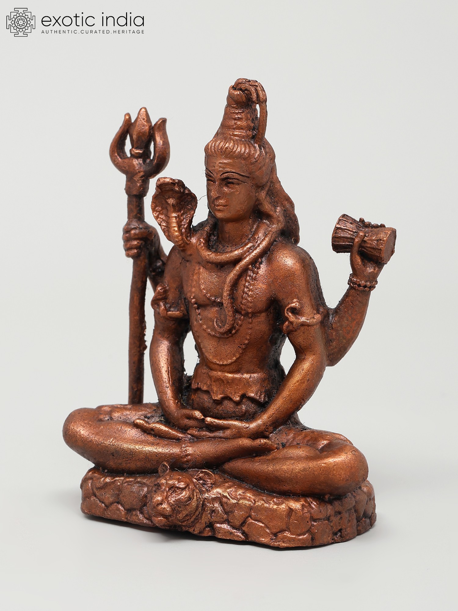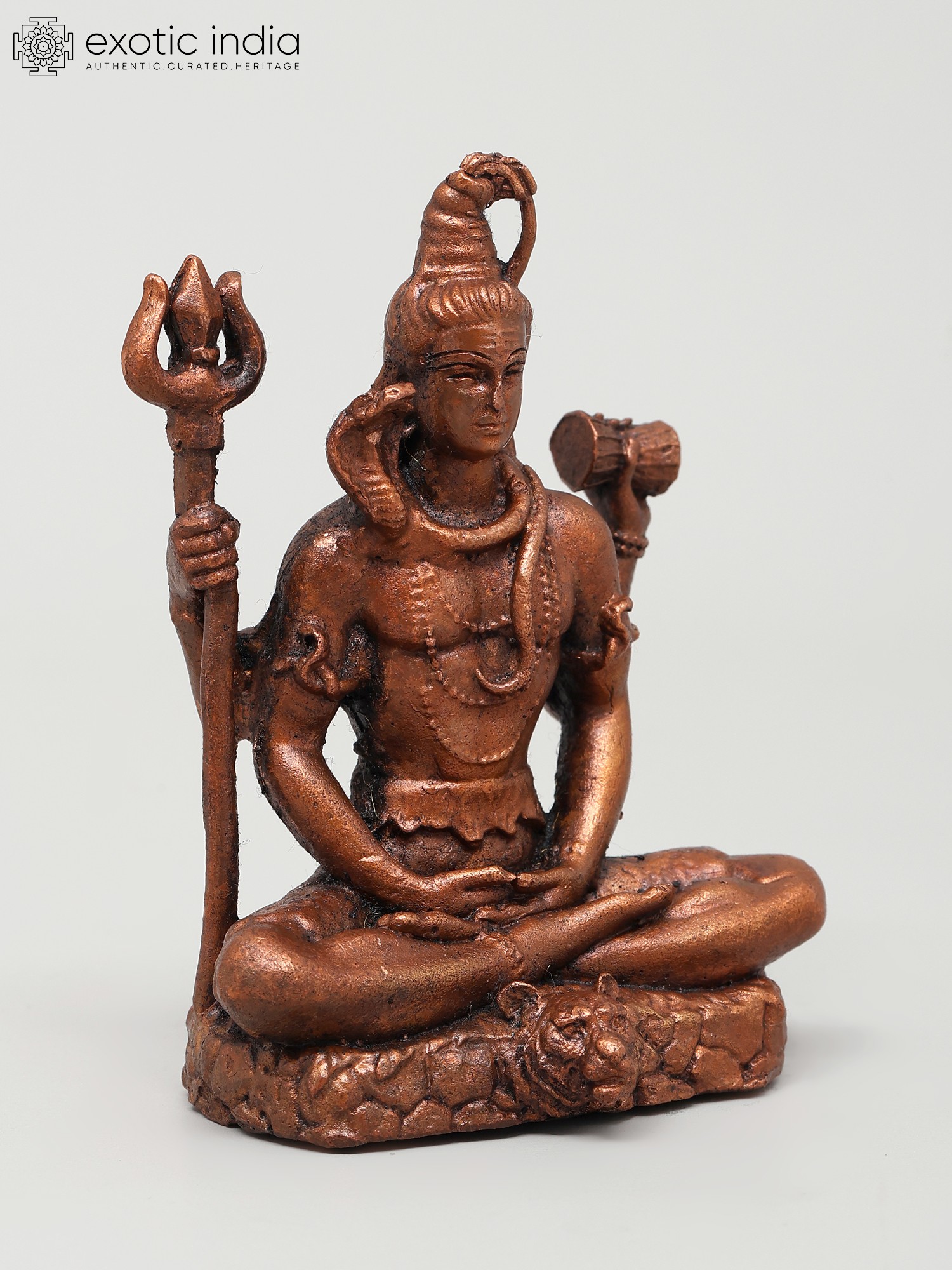 Adiyogi- the primordial ascetic and follower of the divine path of Yoga, Lord Shiva is an omnipresent deity in Hinduism, revered by all beings. In this small copper statue, Lord Shiva is presented in his characteristic yogic pose, sitting on a Baaghacharma (tiger hide). The meditative aura of Shiva has been meticulously infused in the icon, which brims with heavenly tranquility. Shiva wears a tiger hide garment, serpent ornaments, and necklaces of Rudrakasha. Holding Trishula (a weapon of annihilation) and Damru (drum, which is the origin of the primordial sound from which the Universe sprouted), Shiva embodies a state of supreme wisdom, of calmness in life and death, in this statue which is perfect for your Puja ghar or study table, to attain the blessings of Shiva.