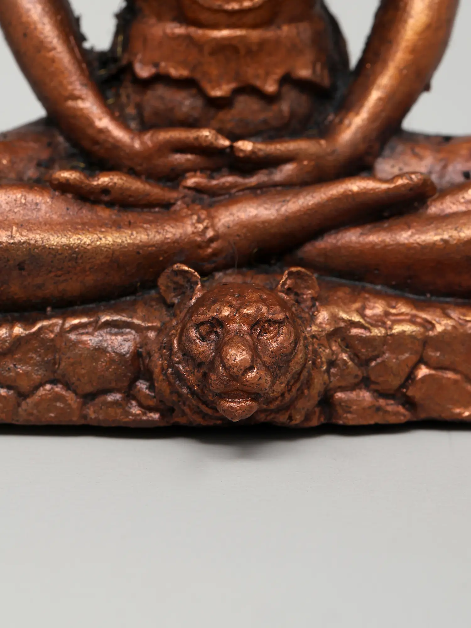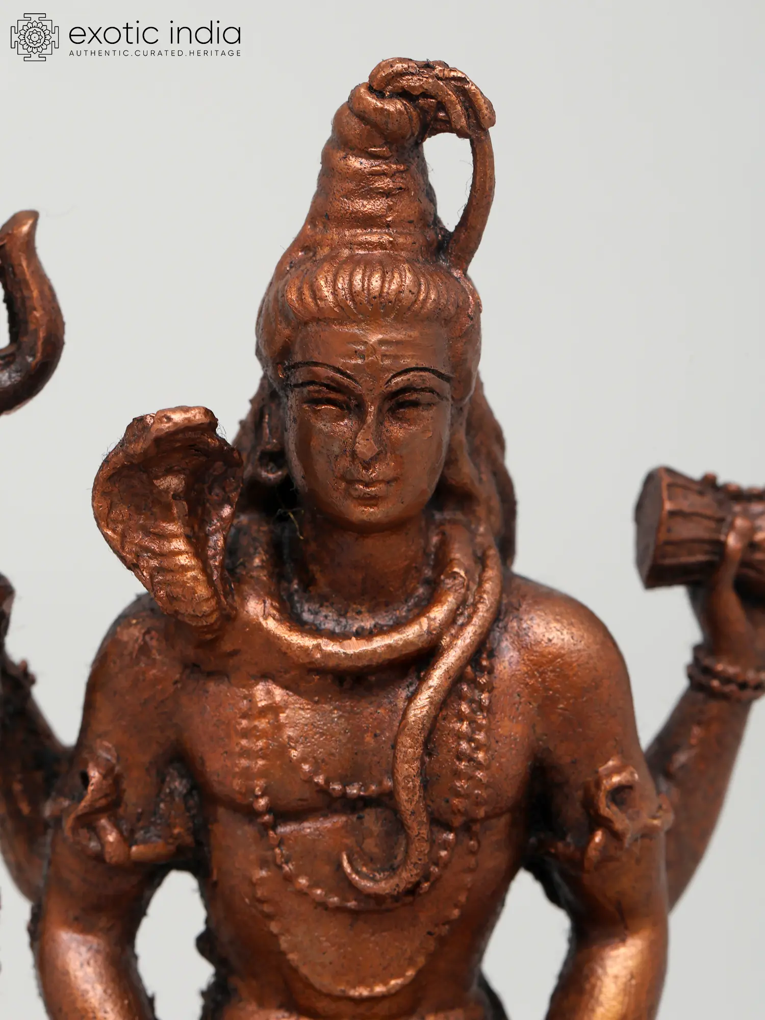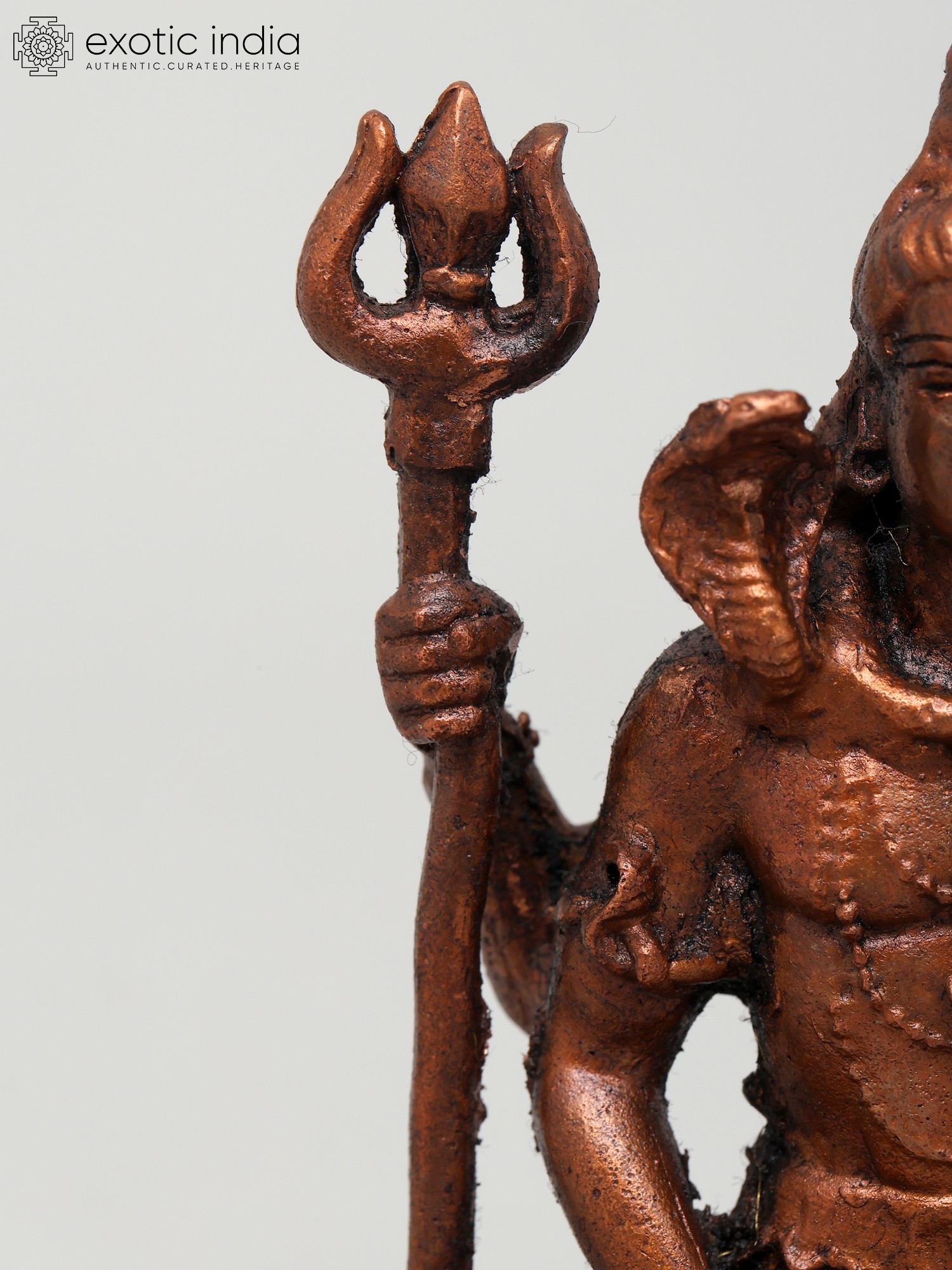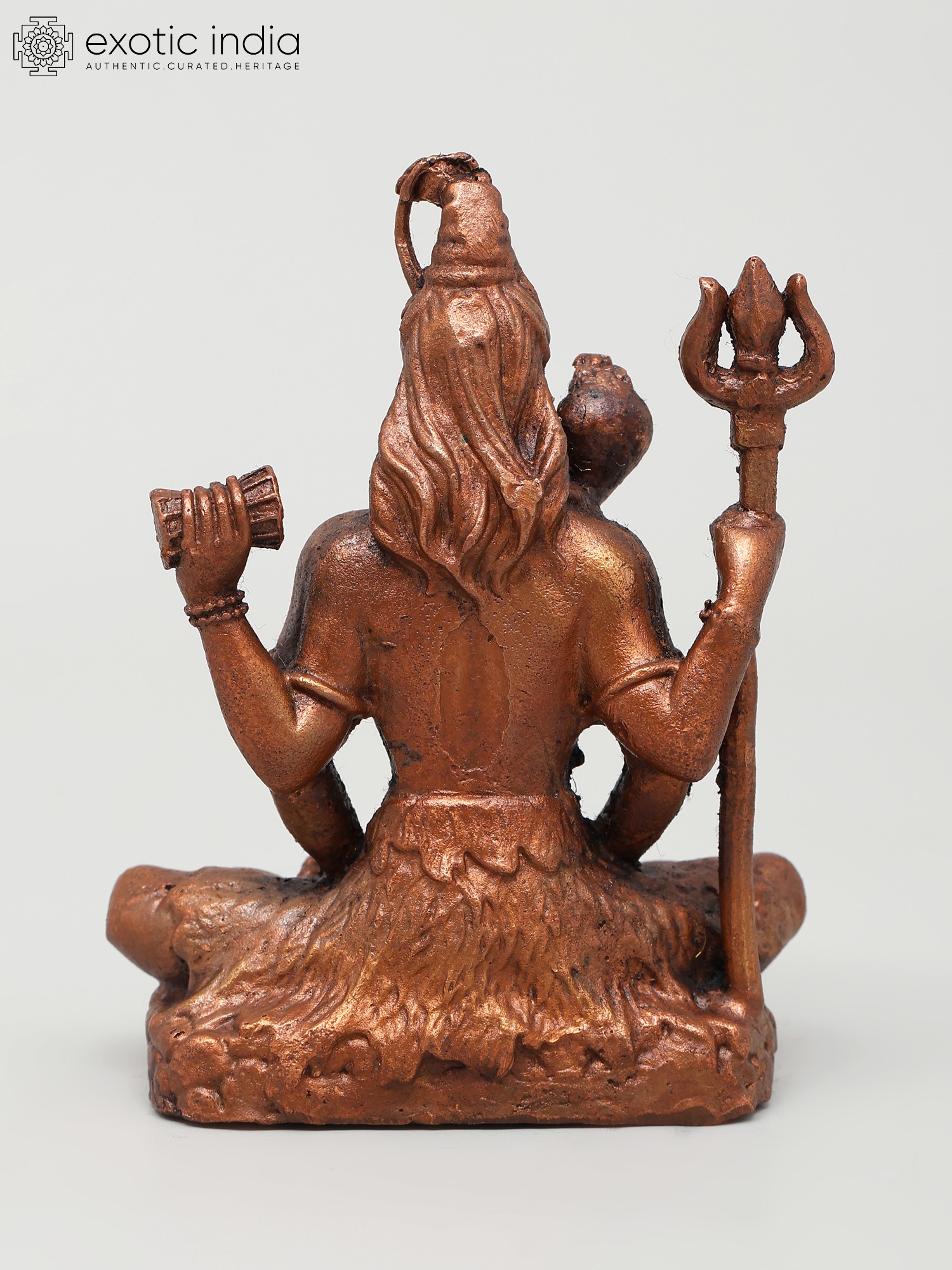 Adiyogi- the primordial ascetic and follower of the divine path of Yoga, Lord Shiva is an omnipresent deity in Hinduism, revered by all beings. In this small copper statue, Lord Shiva is presented in his characteristic yogic pose, sitting on a Baaghacharma (tiger hide). The meditative aura of Shiva has been meticulously infused in the icon, which brims with heavenly tranquility. Shiva wears a tiger hide garment, serpent ornaments, and necklaces of Rudrakasha. Holding Trishula (a weapon of annihilation) and Damru (drum, which is the origin of the primordial sound from which the Universe sprouted), Shiva embodies a state of supreme wisdom, of calmness in life and death, in this statue which is perfect for your Puja ghar or study table, to attain the blessings of Shiva.