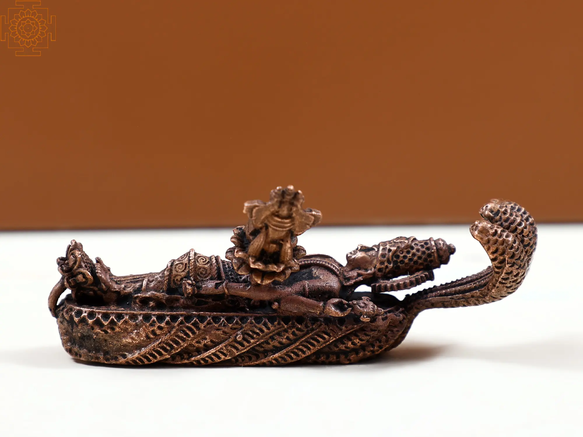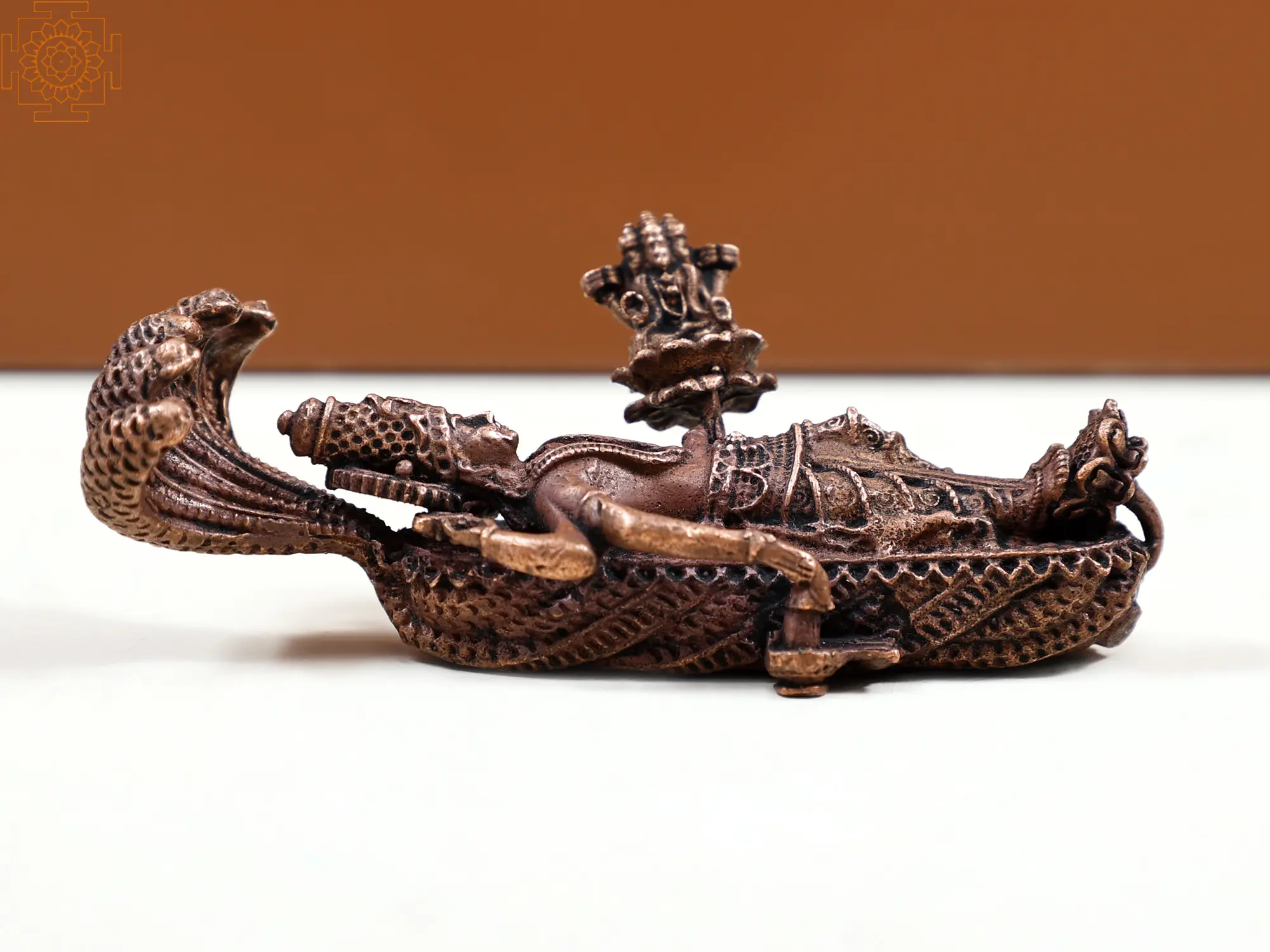 Crafted from pure copper, a metal revered for its purity and auspiciousness in many traditions, this statue is more than just an object; it is a vessel of devotion. The rich, warm patina of the copper lends an ancient aura to the piece, suggesting its timeless significance. Each detail, from the textured scales of Adishesha to the serene countenance and adorned limbs of Lord Vishnu, speaks of dedicated artistry. The small size makes it an ideal accent for home altars, meditation spaces, desks, or shelves, allowing the divine presence to be a constant companion. The tactile quality of the metal invites a sense of grounding and connection, encouraging moments of contemplation and prayer. This piece serves as a beautiful reminder of the eternal truths and the divine grace that pervades existence.