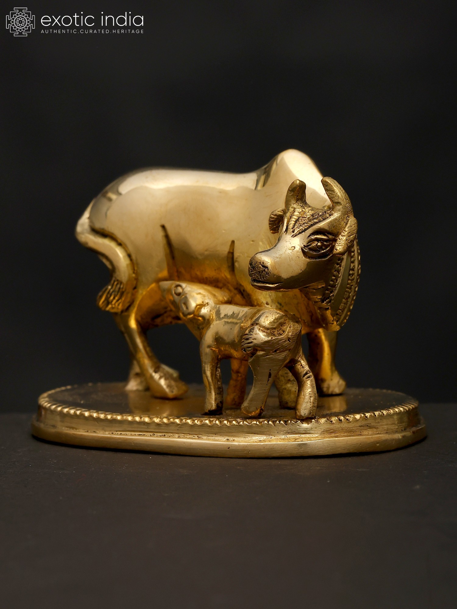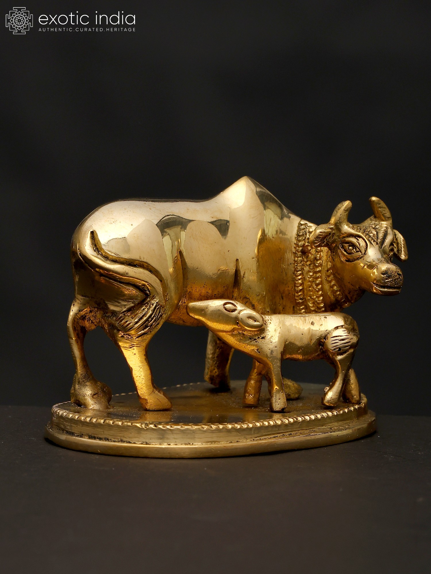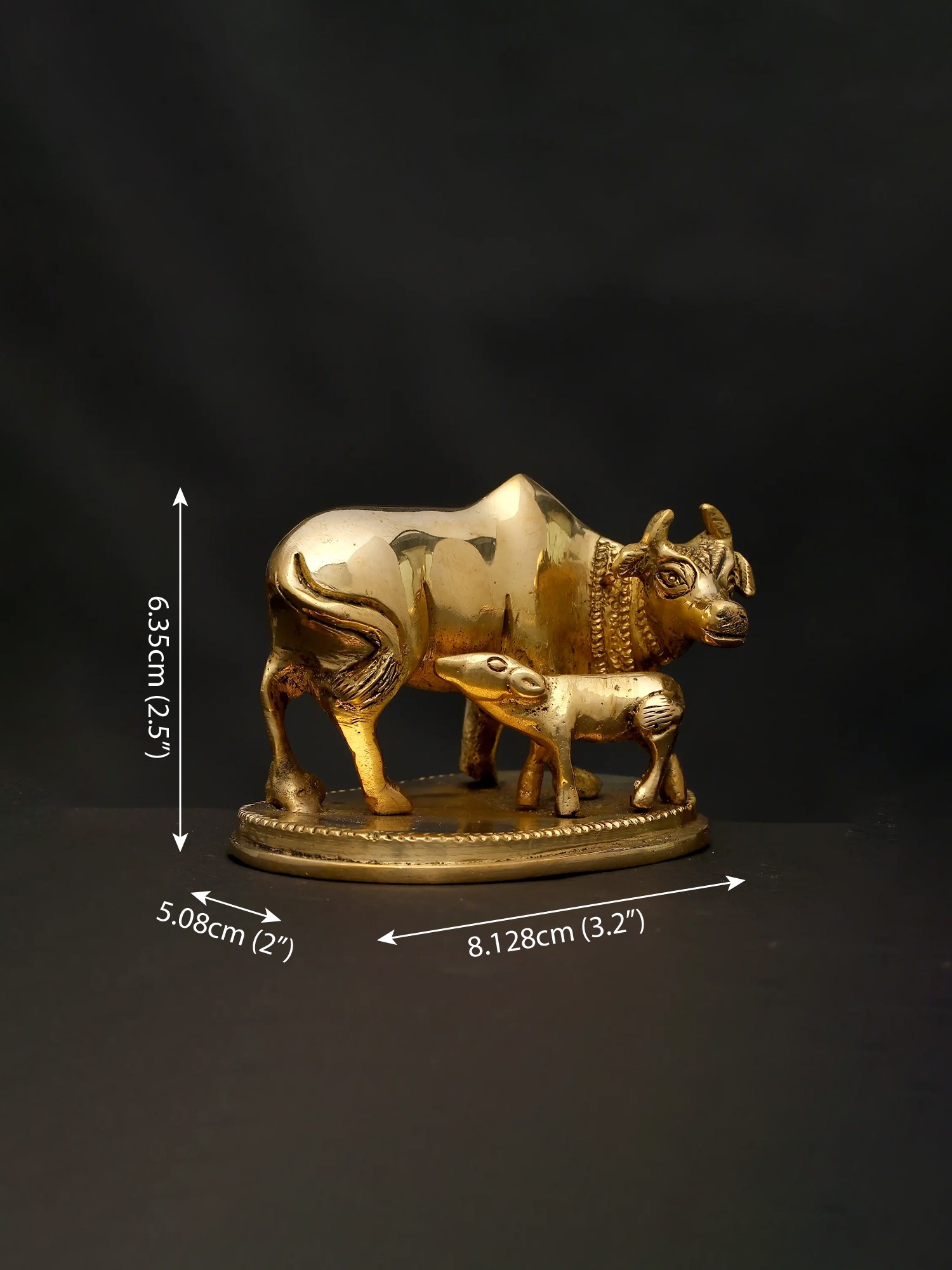 4" Small Superfine Cow and Calf Brass Statue with Lakshmi and Ganesha Carving