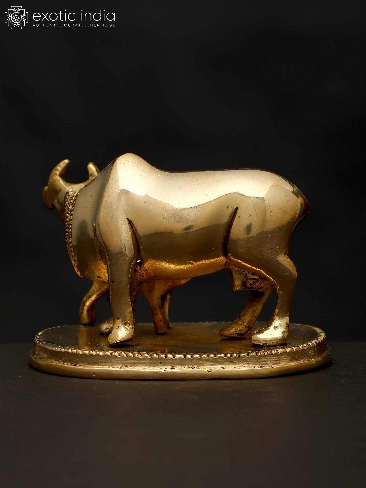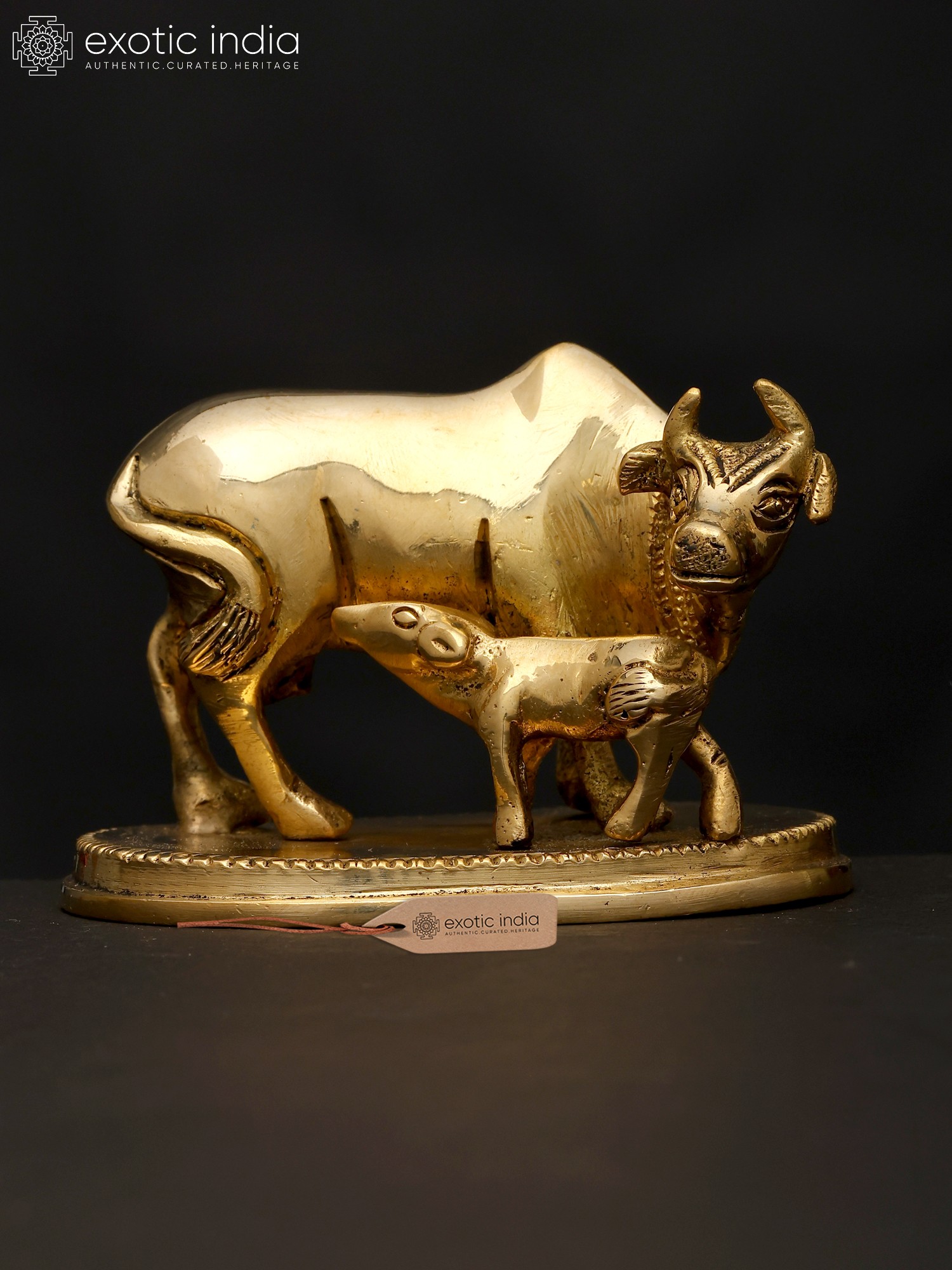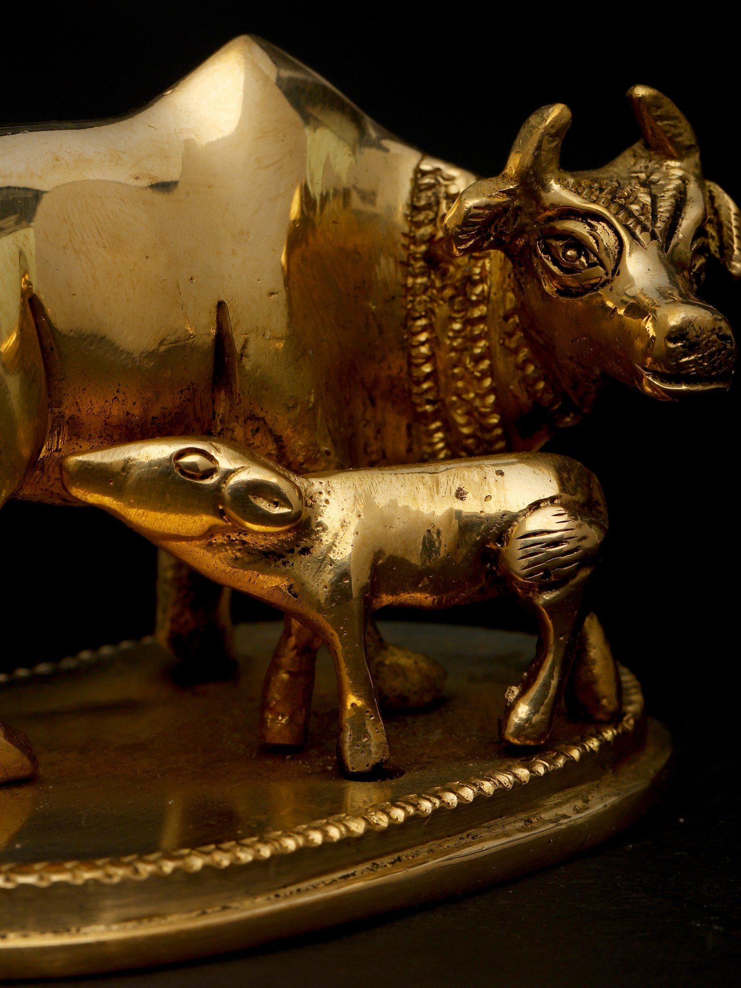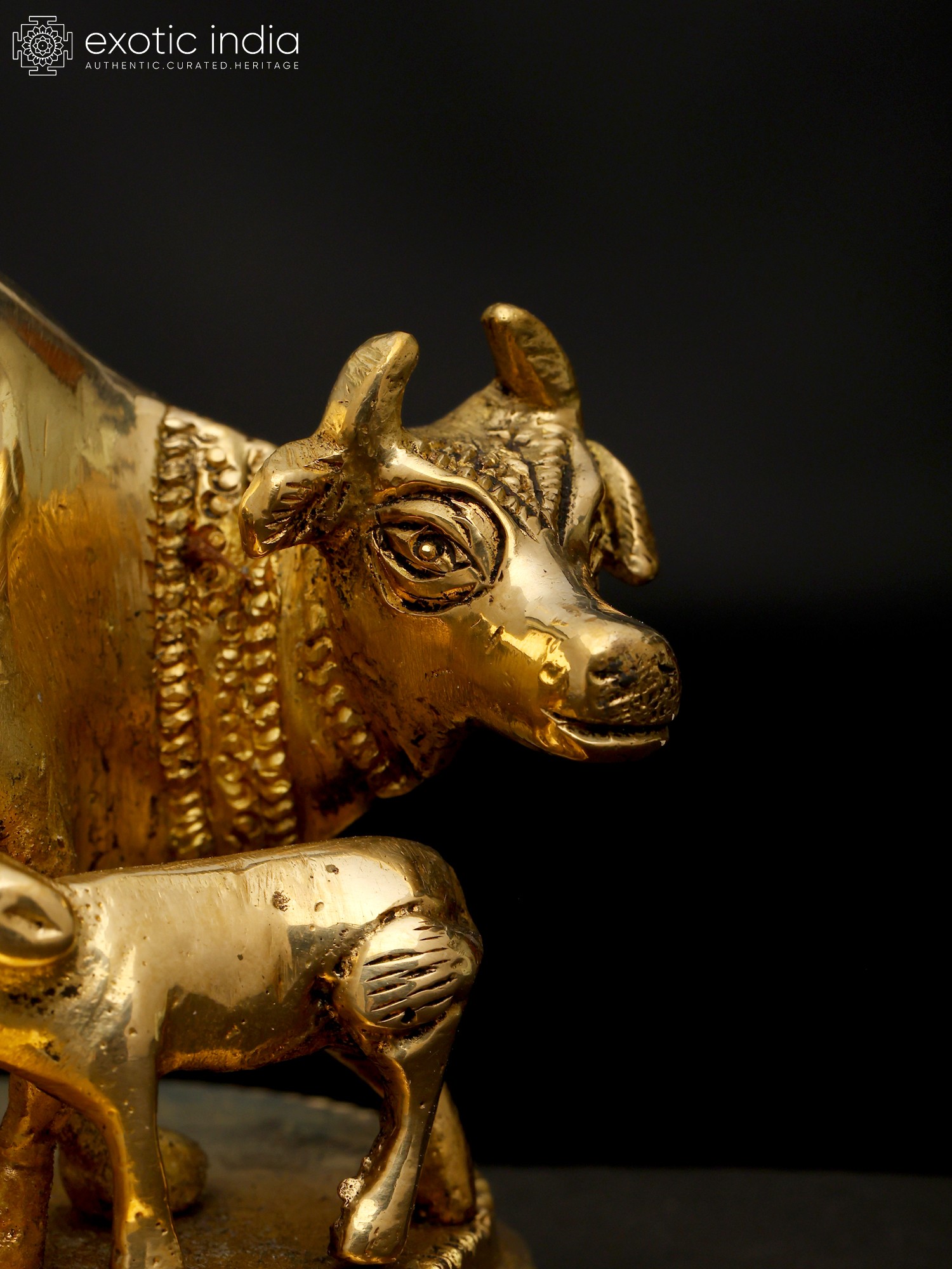 4" Small Superfine Cow and Calf Brass Statue with Lakshmi and Ganesha Carving