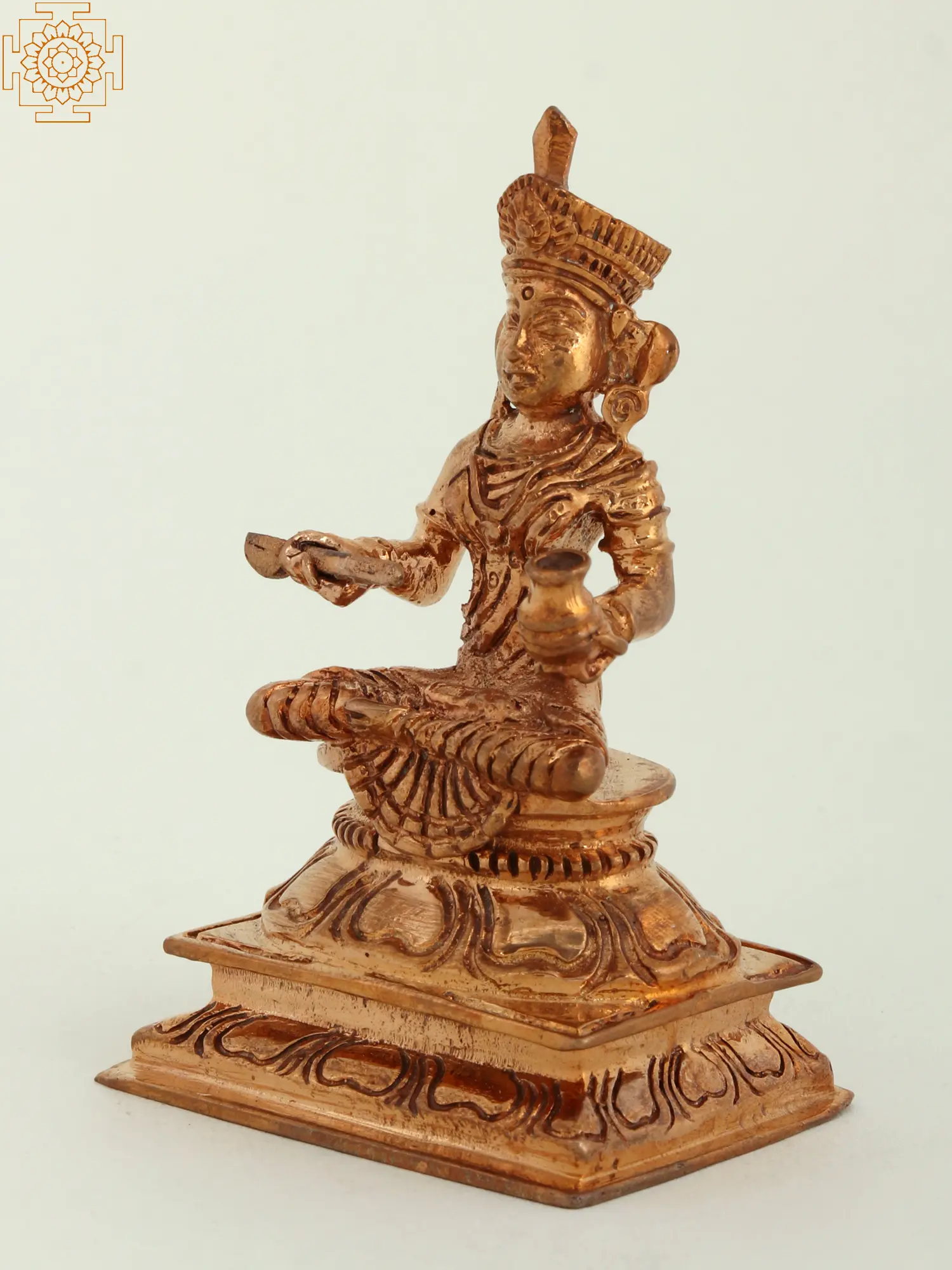 On a double-tiered lotus platform, goddess Annapurna- the motherly aspect of the great goddess (Adi Shakti), is depicted in this bronze statue. Devi Annapurna is wrapped in a saree and wears a distinctive crown. In her hands are a pot and a ladle, to distribute the nectar of her affection and nourish her devotees.