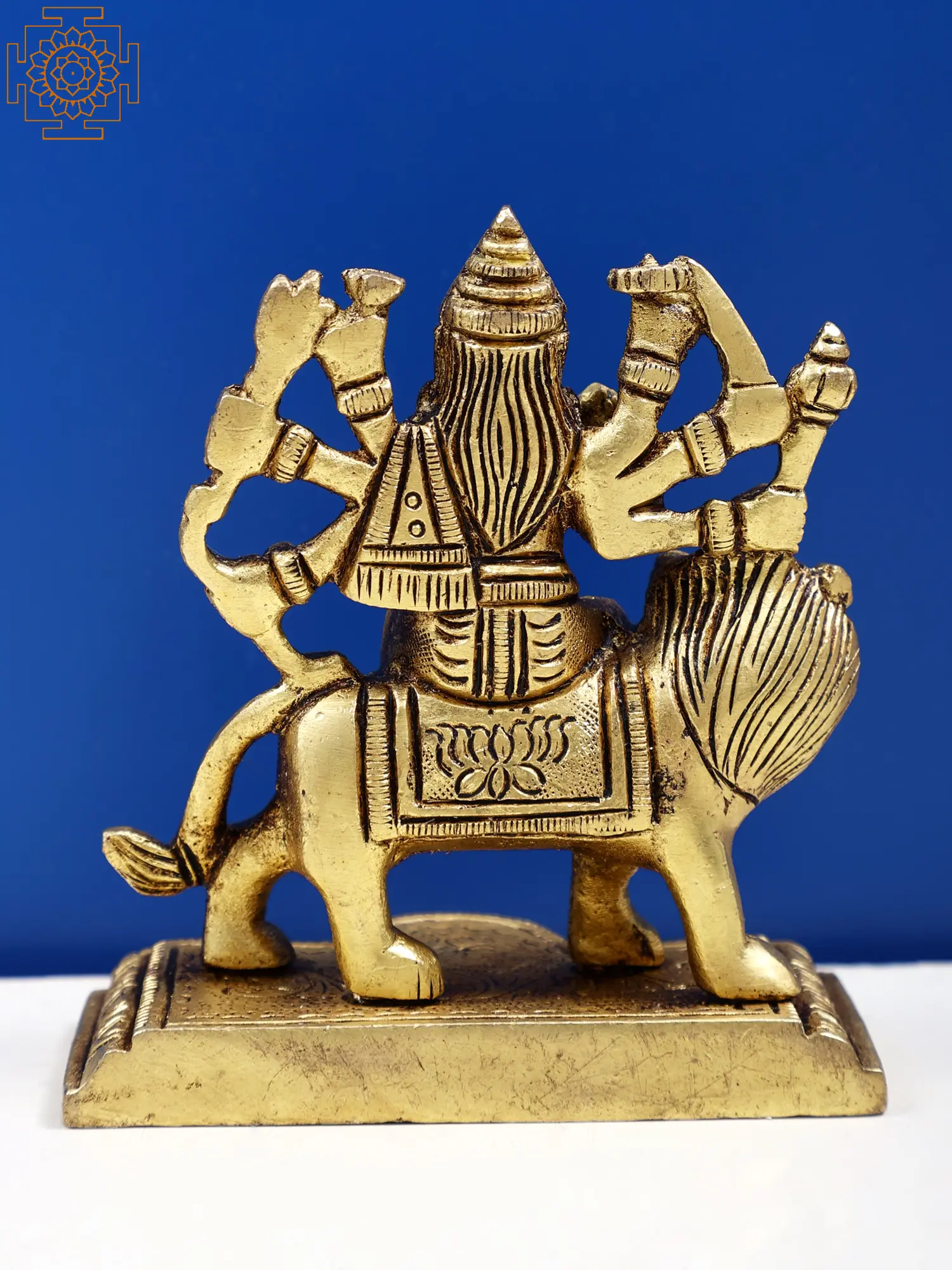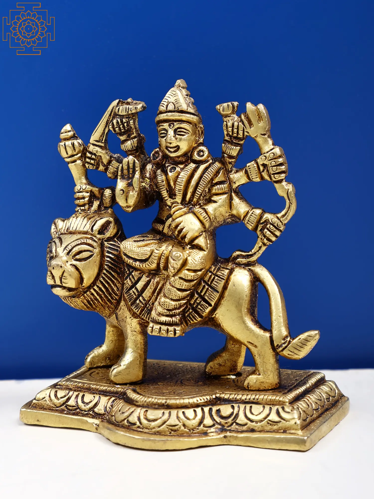 This roopa of the great Hindu mother goddess Ashtabhuja Maa Durga is invoked by her followers to provide total protection from all visible and invisible foes. The eight-armed mother is depicted in this small brass statue seated on her Simha, or lion. She is elegantly dressed, wearing a saree, and sporting an affectionate smile on her divine visage.