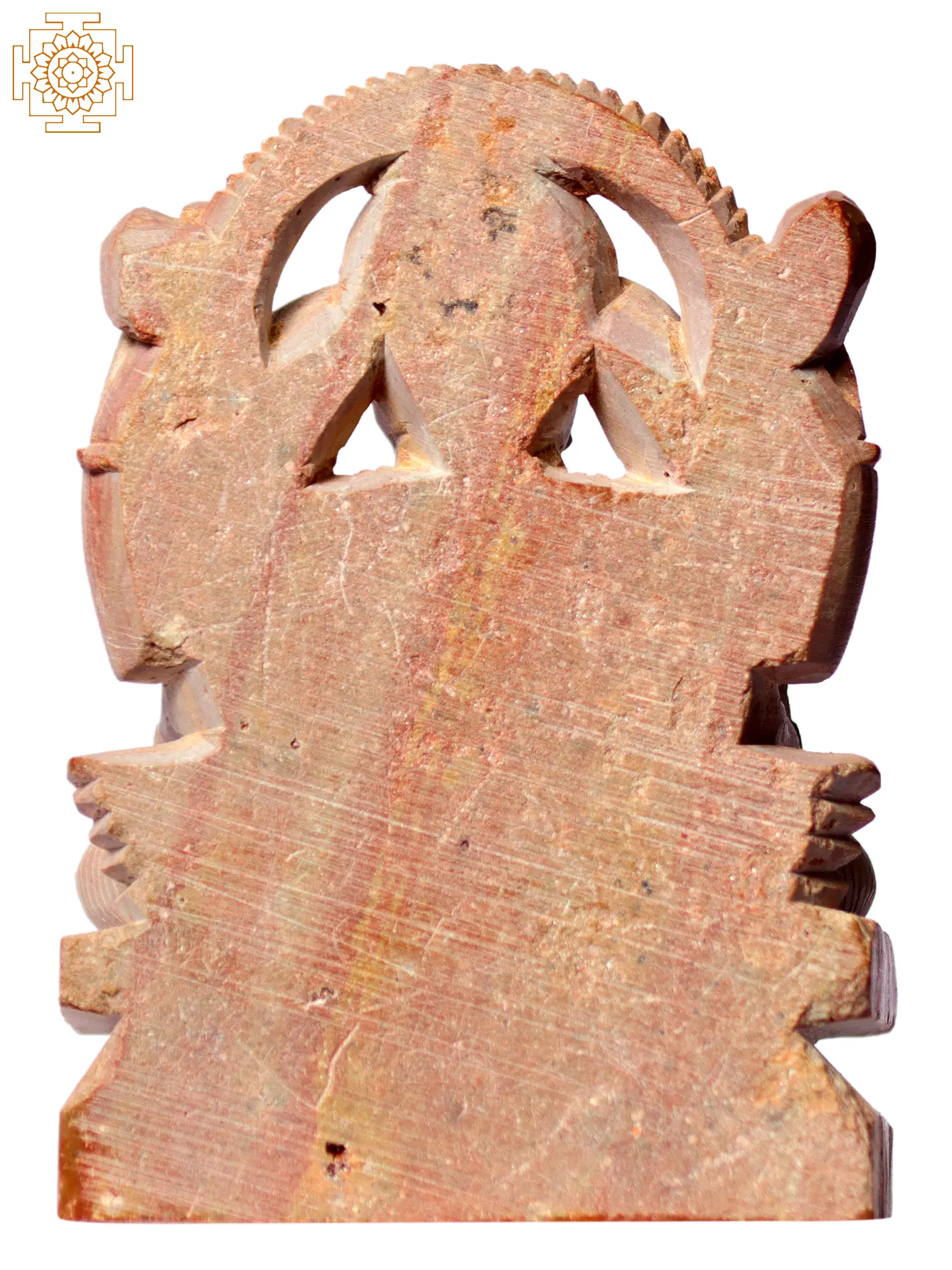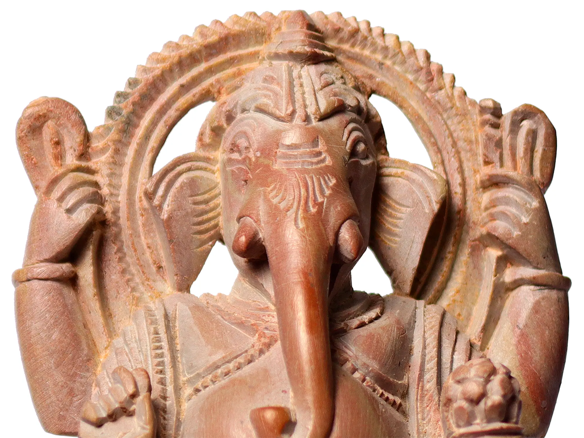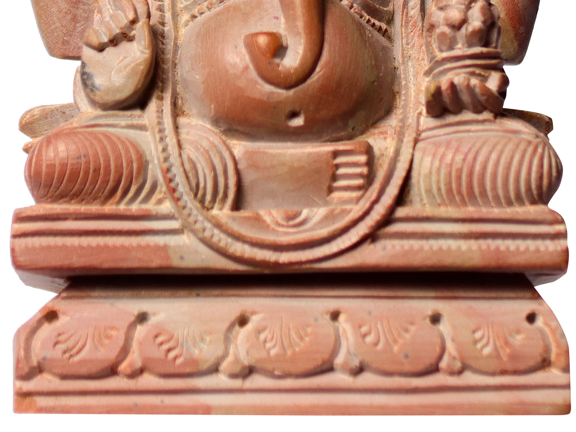 Seated serenely in Padmasana - Lord Ganesha is reverently carved in pink stone with the essence of divine royalty and benevolence, presenting him in all his magnificence. With regal poise, Ganesha's divine form emanates a sense of grandeur and celestial grace. His broad shoulders and sturdy physique symbolize strength and protection, while his elephant head signifies wisdom, intelligence, and compassion. His large ears symbolize his attentiveness to the prayers and pleas of his devotees, always ready to listen and respond.