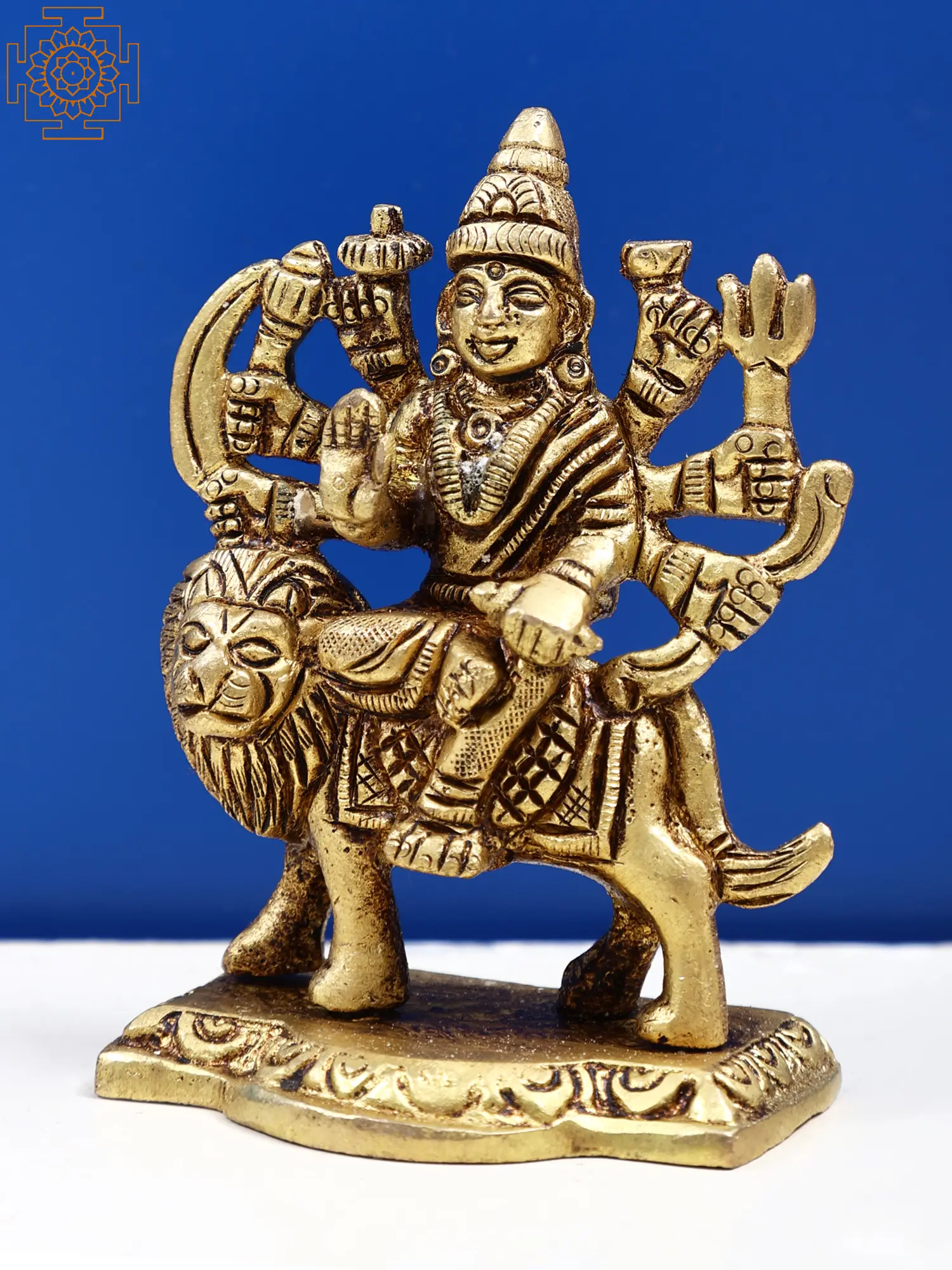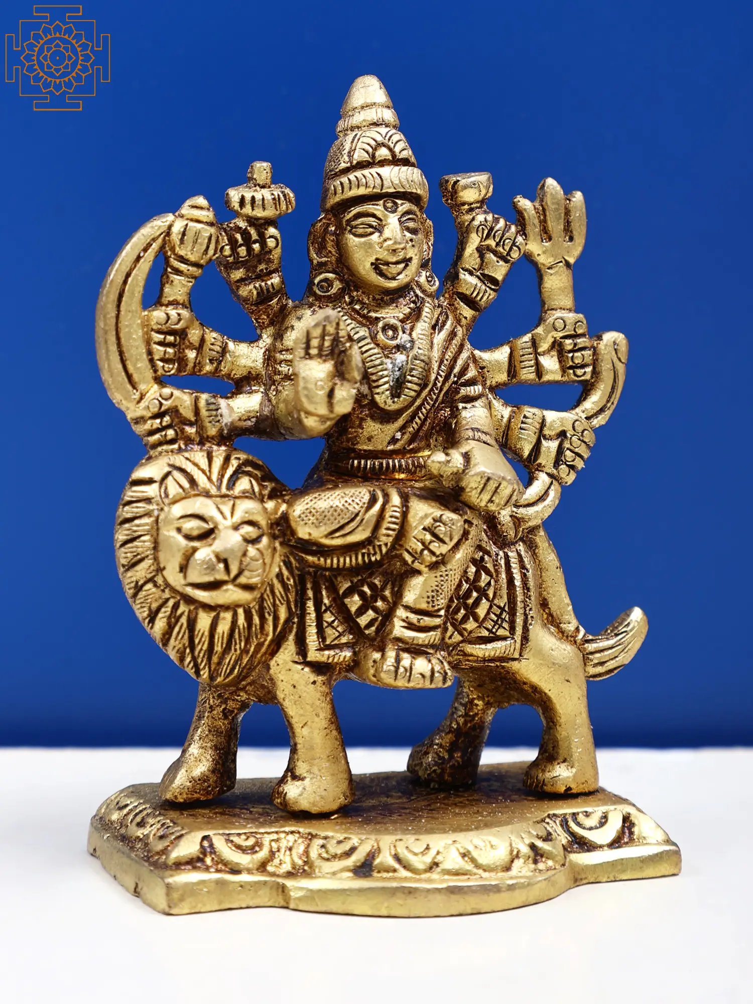 Ashtabhuja Maa Durga is an aspect of the great Hindu mother goddess evoked by her devotees for complete protection from all seen and invisible enemies. In this small brass statue, the eight-armed mother is enthroned on her Simha or lion, wrapped in a saree, adorned beautifully, with a gentle smile on her divine countenance.