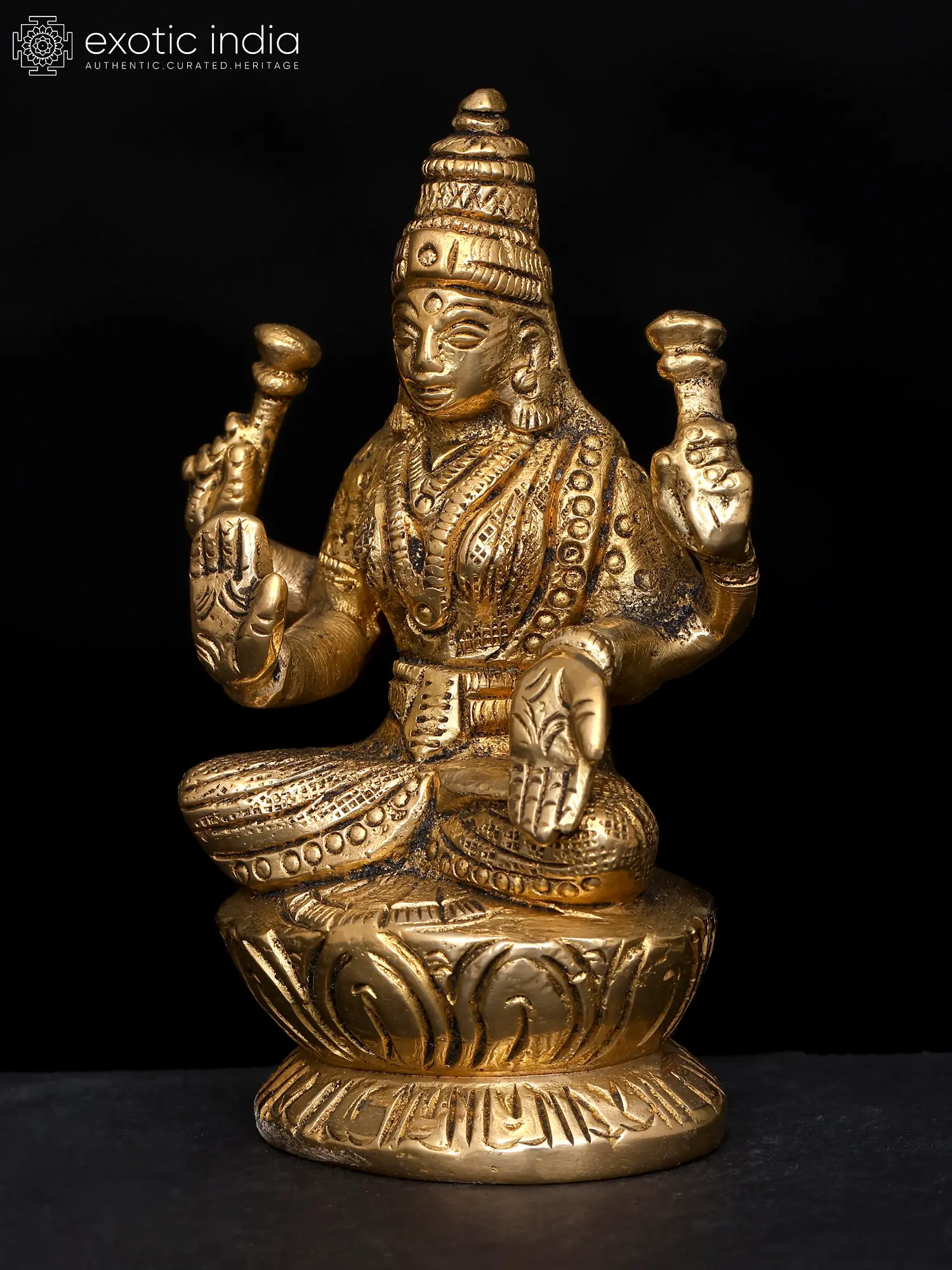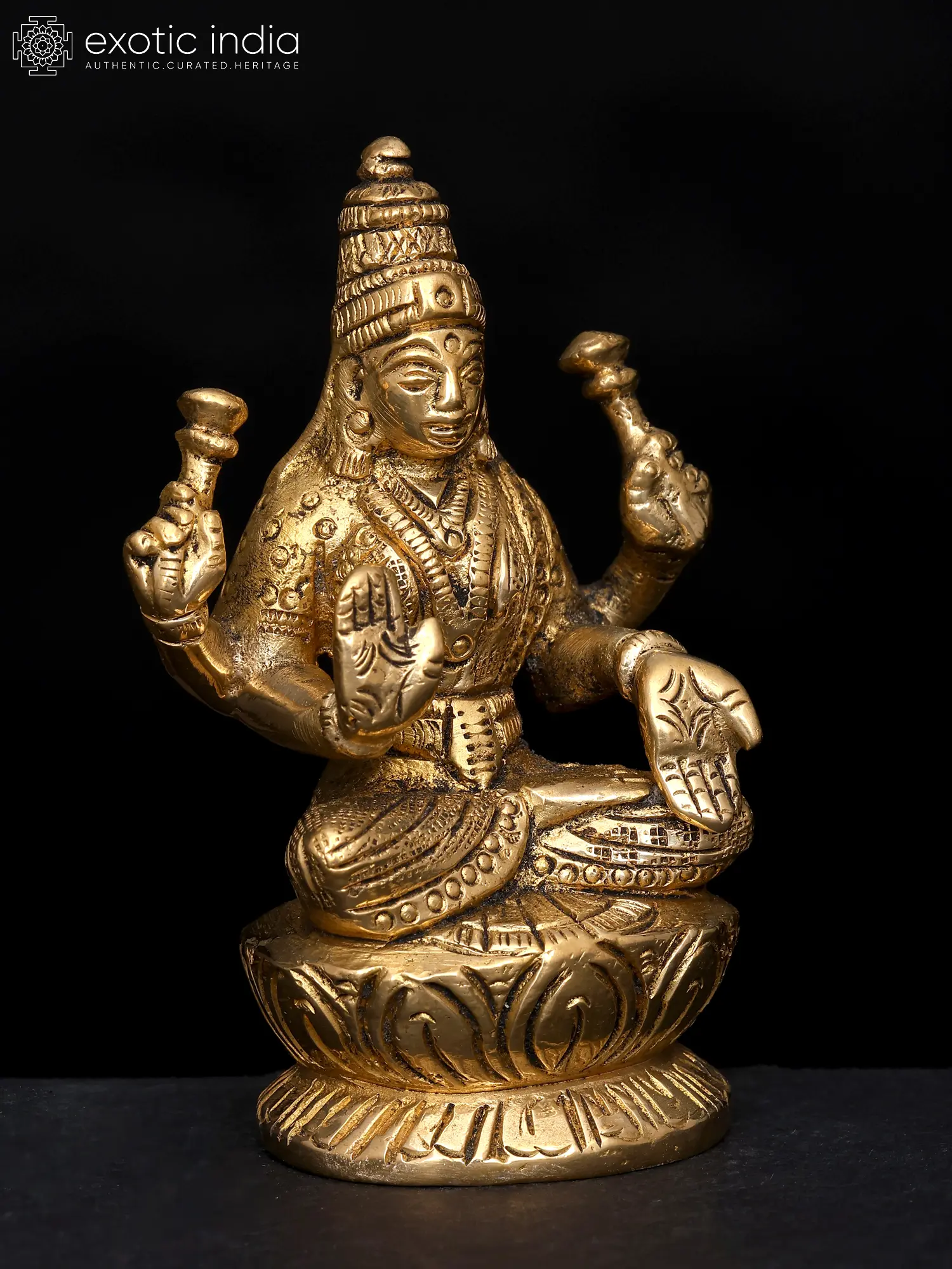 Padmasana- seated on a Padma or lotus which is the Hindu symbol of purity, auspiciousness, wisdom, and fertility, Devi Lakshmi in this brass statue is in her roopa as the divine bestower of eternal richness in life. Maa Lakshmi is depicted in her heavenly youthful aspect, adorned with a saree, ornaments and a royal crown, as offerings in the lotus-feet of the supreme mother goddess.