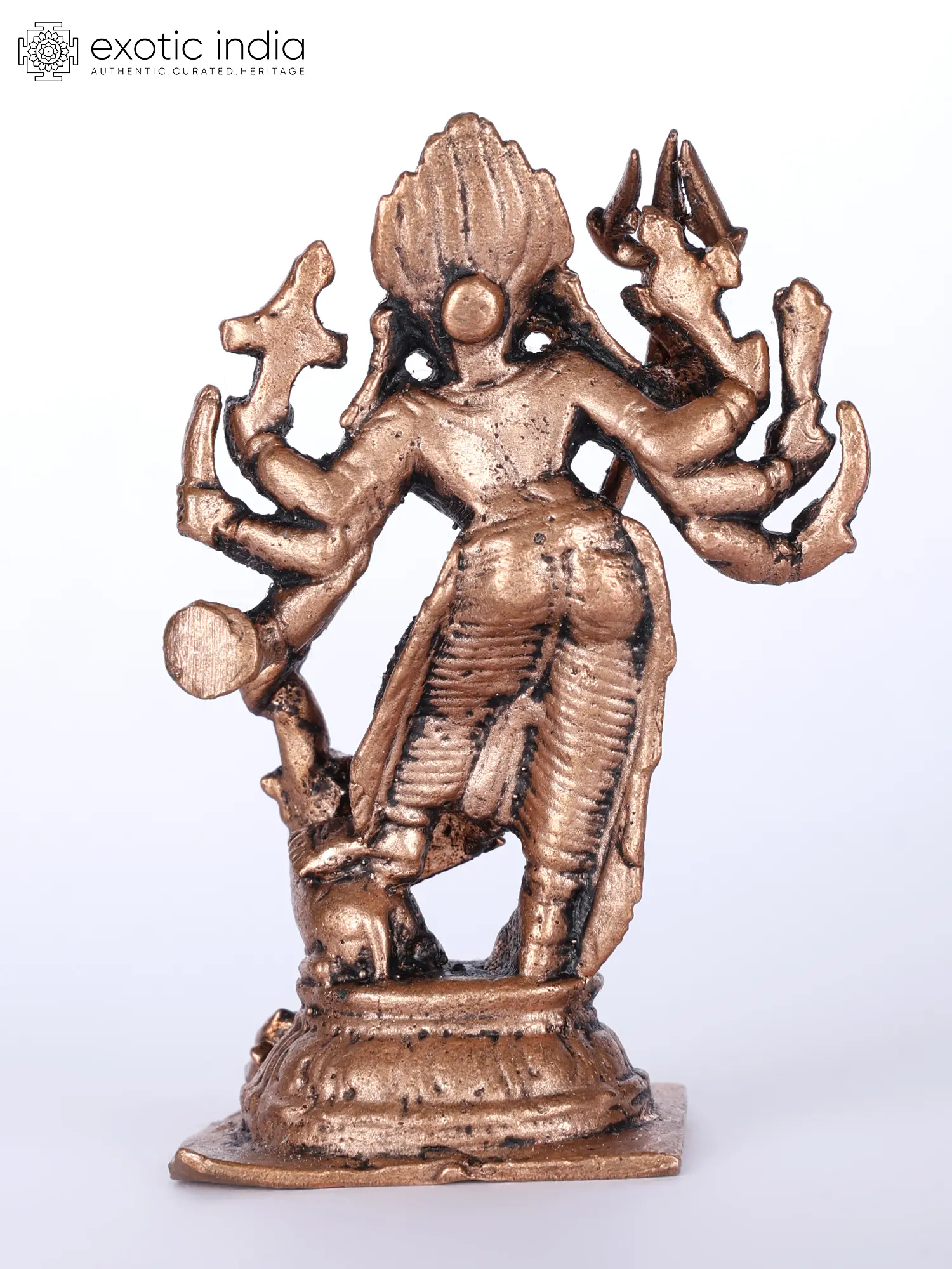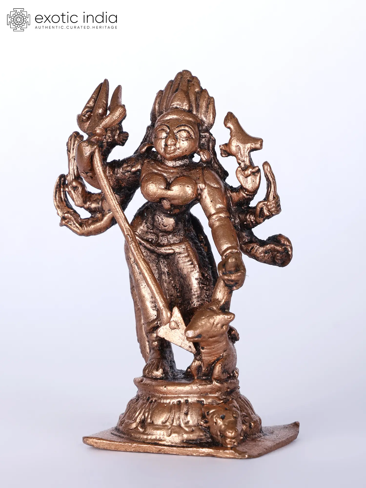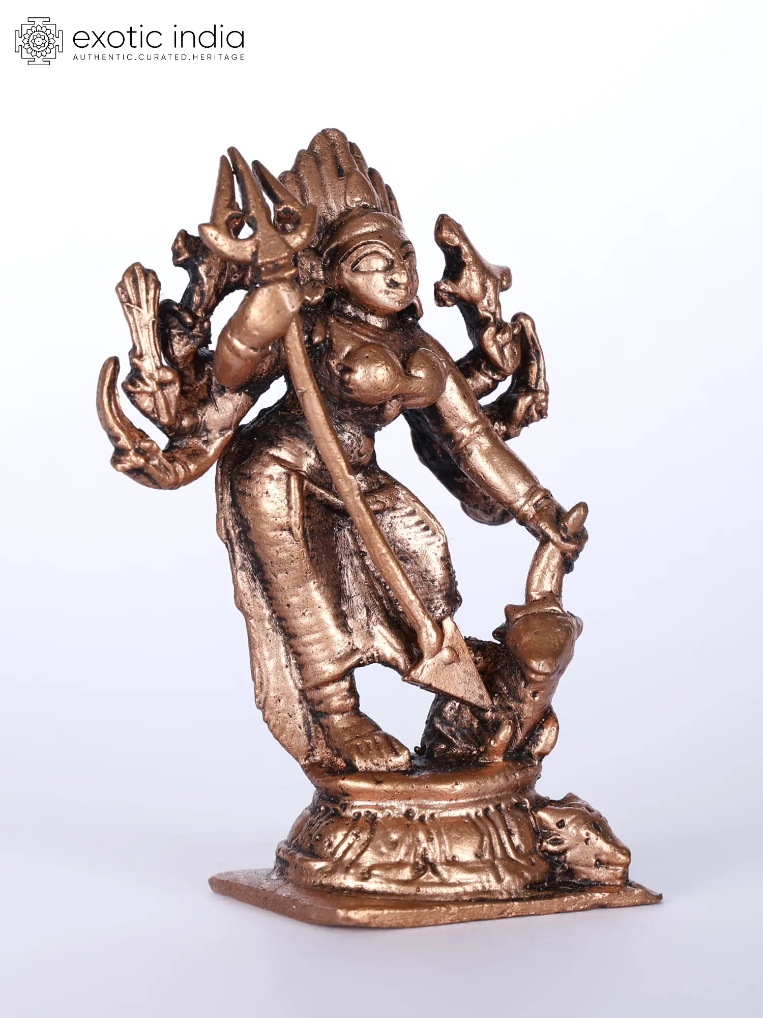 This statue portrays the formidable Hindu goddess Durga in her victorious form as Mahishasura Mardini symbolizes the triumph of God over evil. Crafted with meticulous details and cast in enduring copper, this sacred statue captures the essence of divine strength and courage.