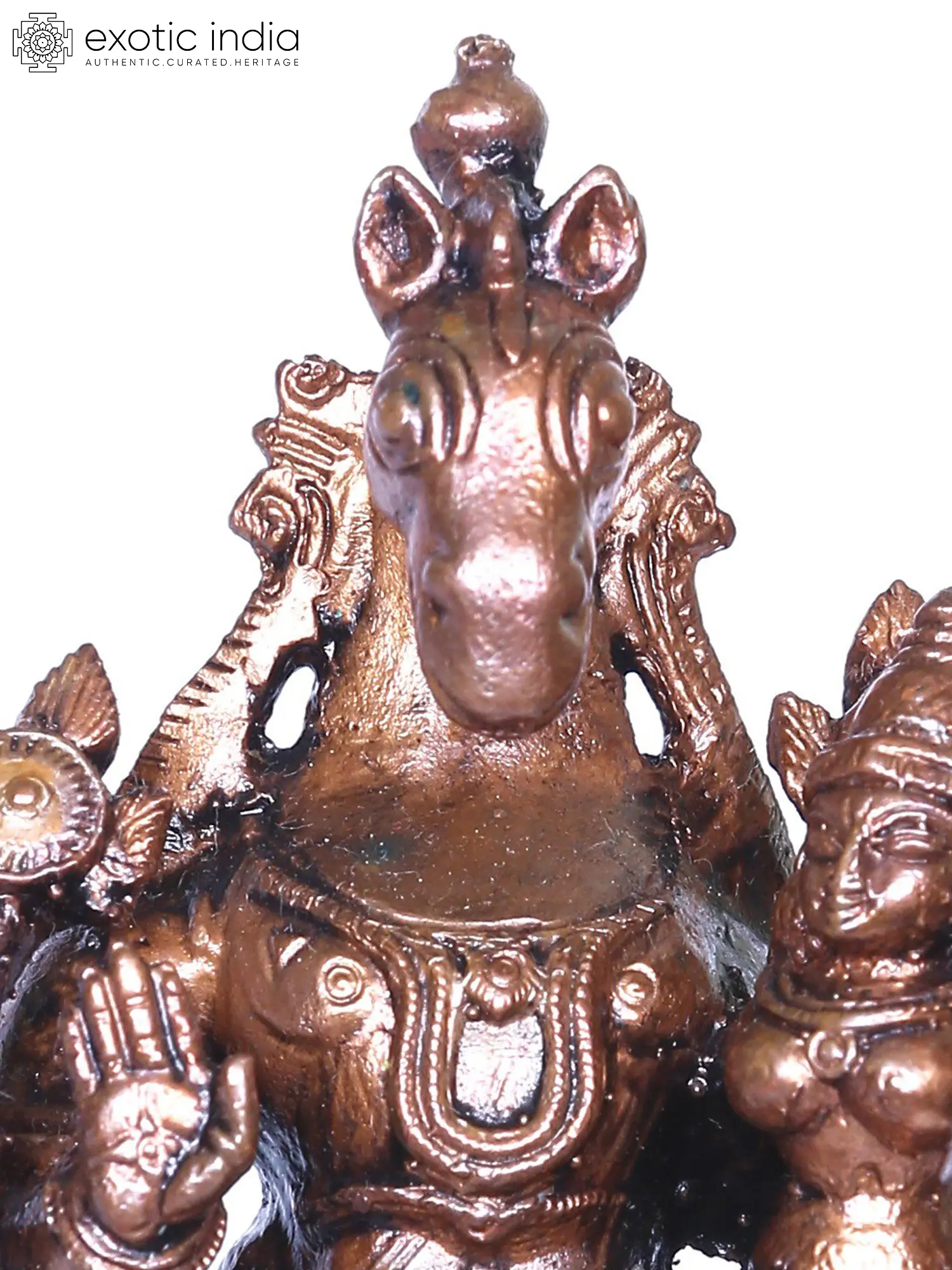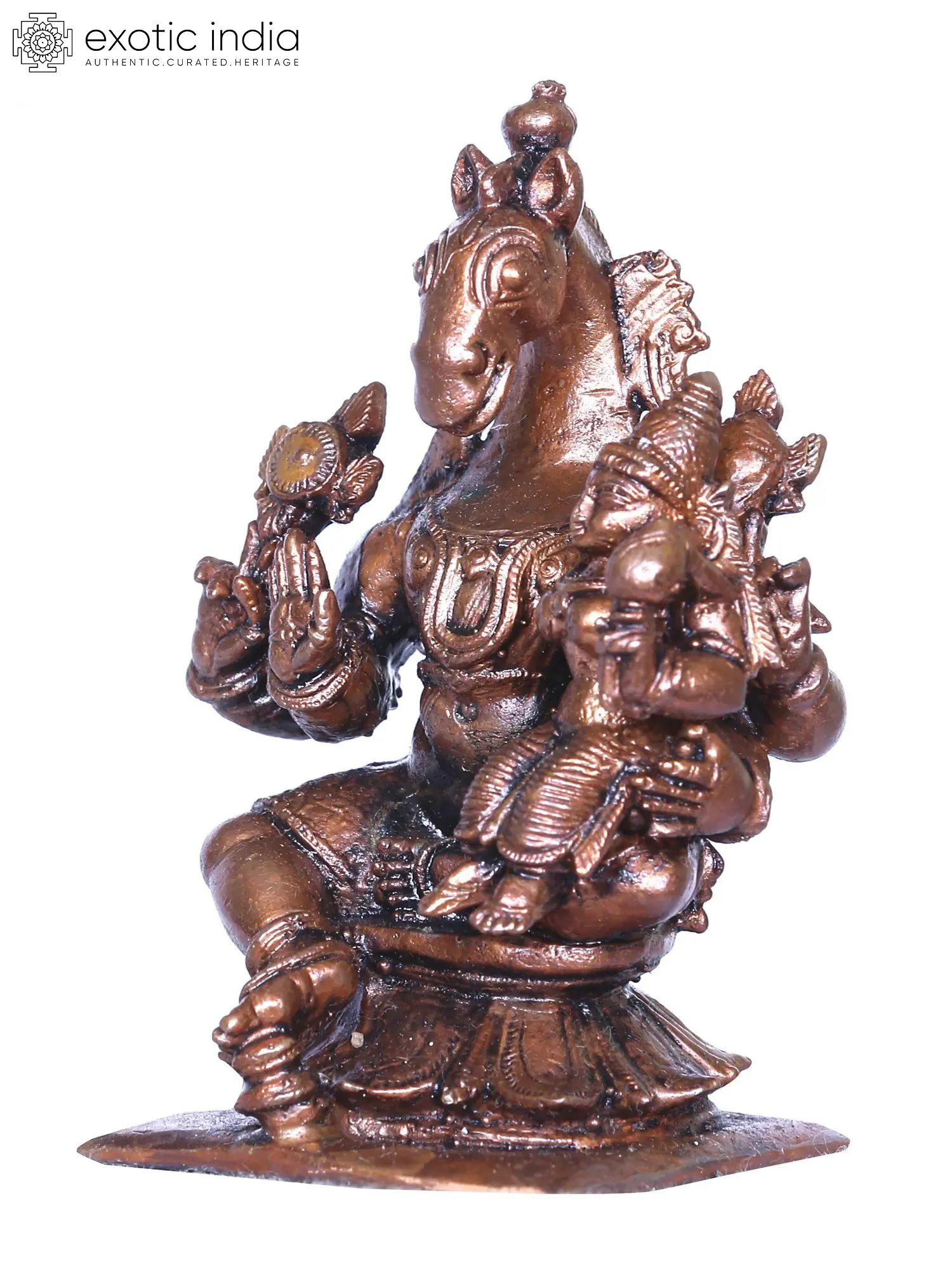 Lord Hayagriva is an incarnation of Lord Vishnu. He is worshipped as the god of knowledge and wisdom. In this sculpture, He has been depicted with a human body and a horse’s head, seated on a lotus podium. Lord Hayagriva’s front right hand is in Abhaya Mudra (fear not gesture), signifying courage and fearlessness. His right hand at the back is seen carrying a discus, demonstrating his power to destroy demons. Laksmi, the goddess of wealth and good fortune, sitting in Lord Hayagriva’s lap, carrying a lotus in her hand, symbolising purity and prosperity. As a pair, Lord Hayagriva and Goddess Lakshmi represent the harmonious coexistence of intellectual pursuits and material prosperity. As the bestower of knowledge, wisdom, wealth and prosperity, Lord Hayagriva and goddess Lakshmi shower their blessings upon devotees who worship them for academic success, spiritual enlightenment and prosperity.