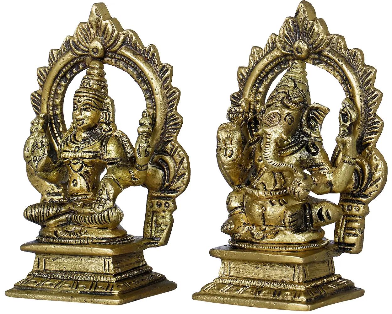 Accompanying Lakshmi is Lord Ganesha, the beloved elephant-headed deity, revered as the remover of obstacles and the patron of arts and sciences. His distinctive form, with a single tusk, signifies his ability to overcome challenges and his mastery over worldly wisdom. Ganesha is invoked at the beginning of any new venture, ritual, or journey to ensure success and to clear the path of impediments. The story of how he obtained his elephant head, a tale of divine intervention and profound love, is a testament to his unique place in the pantheon. The intricate detailing on both statues, from the fine filigree work on their halos to the delicate folds of their garments, speaks to the skill of the artisans. Cast in solid brass, these figures possess a timeless quality and a rich patina that deepens with age, reflecting the enduring nature of the deities they represent. Their compact size makes them incredibly versatile, allowing you to place them as focal points on an altar, as guardians on a bookshelf, or as cherished mementos on your workspace.