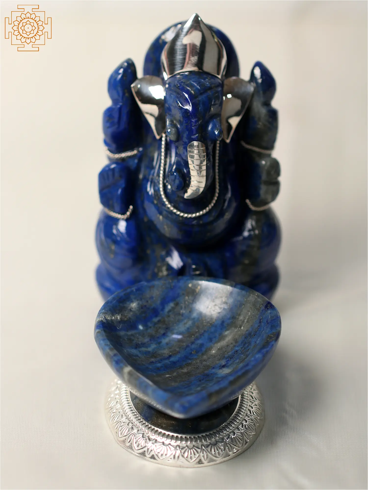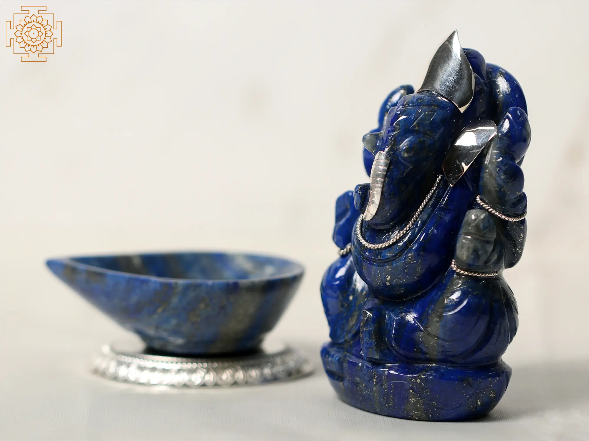 Discover a Small Lapis Lazuli Gemstone Blessing Ganpati Idol and Diya, where the deep blue lapis lazuli gemstone meets the divine presence of Lord Ganesha. Ganesha, the harbinger of success and wisdom, graces the lapis lazuli with his blessings. This meticulous piece of art inspires one to seek the light of knowledge and the wisdom of Ganesha. Like the Diya that illuminates the darkness, embrace the transformative power of Ganesha's blessings, knowing that with his guidance, you can overcome obstacles and light the path to success.