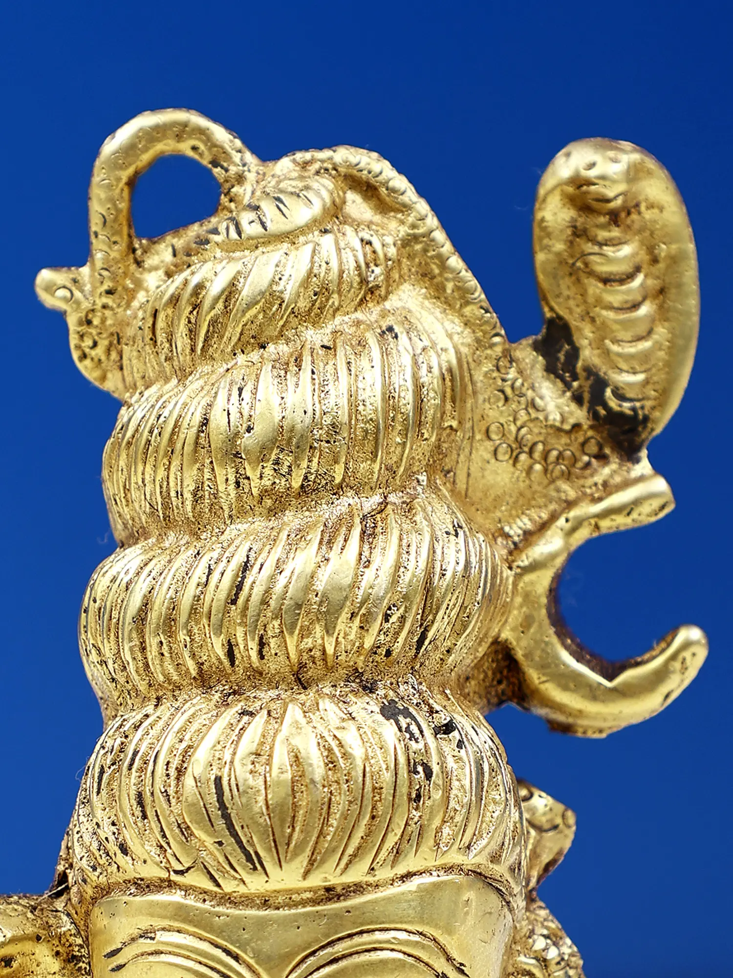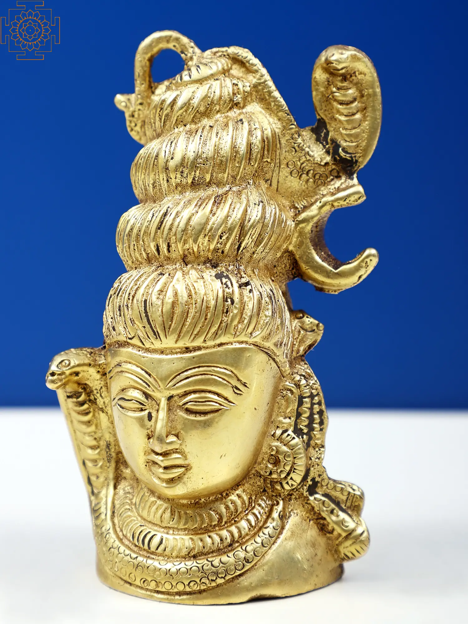 This diminutive yet striking brass depiction captures the essence of Lord Shiva's cosmic dance, Nataraja. The finely detailed head exudes the energy of the destroyer and creator. The third eye signifies spiritual insight, while the crescent moon adorns his flowing locks. With the sacred Ganga flowing, Shiva reveals his untamed power. His matted hair holds the mighty river, and the serpent around his neck symbolizes control over time. This artwork encapsulates Shiva's dynamic role in the universe, evoking reverence for the eternal cycle of life, destruction, and rebirth.