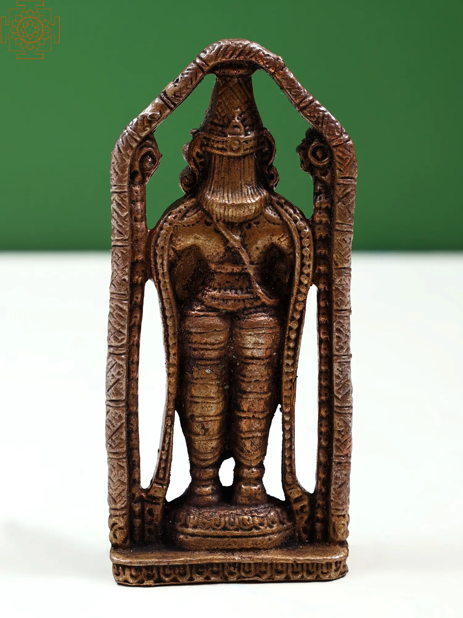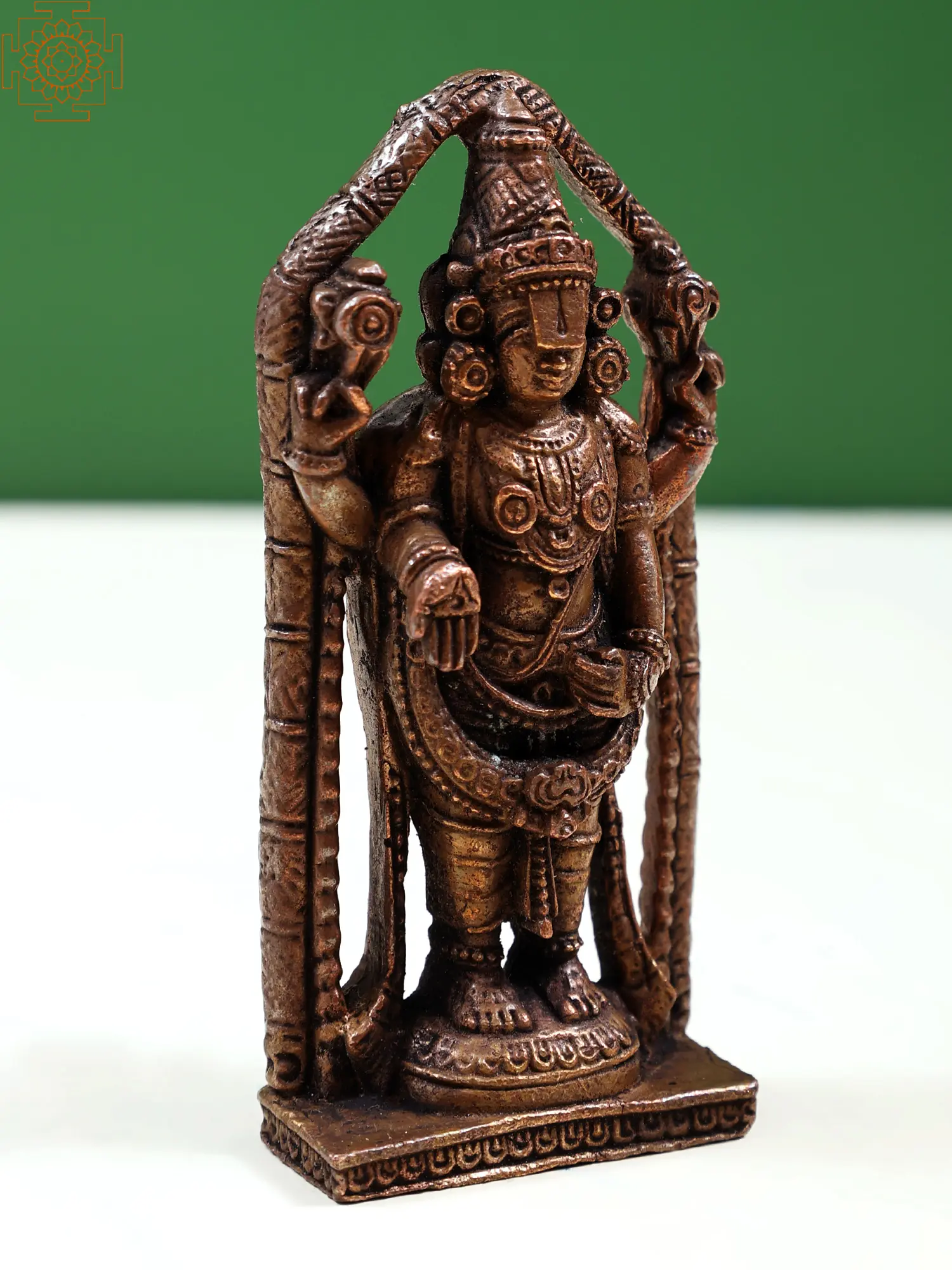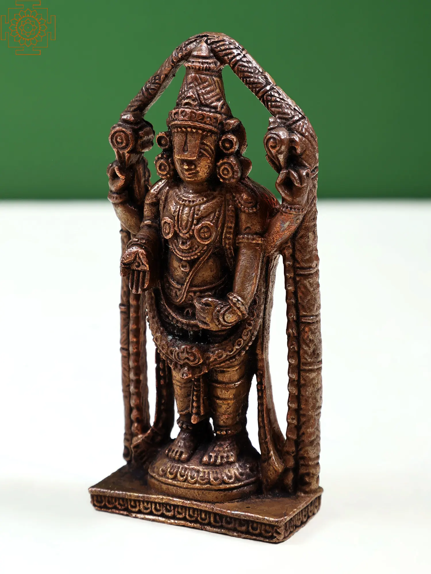 A manifestation of Sri Vishnu, the Hindu preserver god, who resides in the Tirupati temple in Andhra Pradesh is referred to as Balaji (the strong one), Tirupati (Lord or Pati of Goddess of Wealth or Tiru, Lakshmi), and Venkateshwara (Lord or Ishwara of Venkata hill). The Lord of Tirumala is shown in this exquisitely modeled Sri Venkateshwara copper statue in a splendid four-armed roopa, regally decorated and radiating a divinity that reassures the devotee of his omnipresent goodness.