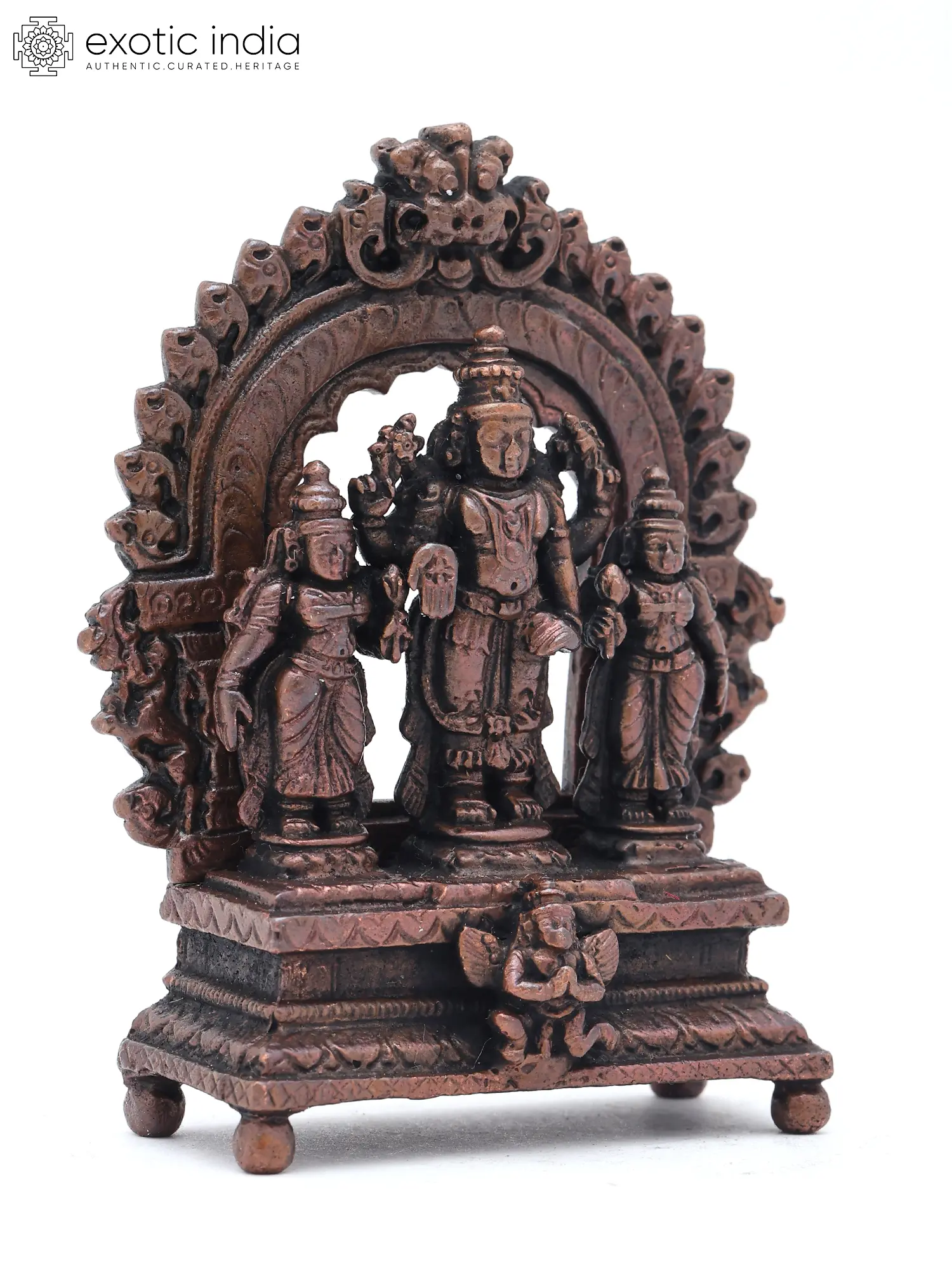 3" Small Lord Vishnu with Sridevi and Bhudevi on Kirtimukha Throne | Copper Statue | Made in India