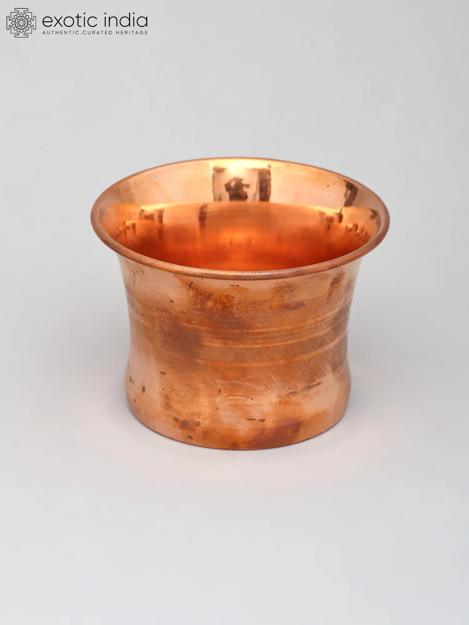 Each Pancha Patra is a testament to the enduring skill of Indian artisans. The subtle horizontal striations that adorn its exterior are not just decorative; they are the marks of the hammer, meticulously shaping the copper into its final form. This handcrafted nature ensures that each piece is unique, imbued with the spirit of its maker. The slightly flared rim and the sturdy base are designed for both aesthetic appeal and practical use, ensuring stability and ease of handling during prayer. The patina that may develop over time only adds to its character, speaking of its journey and the countless blessings it has facilitated. This Pancha Patra is more than an object; it is a piece of living tradition, ready to grace your sacred space and deepen your spiritual practice.