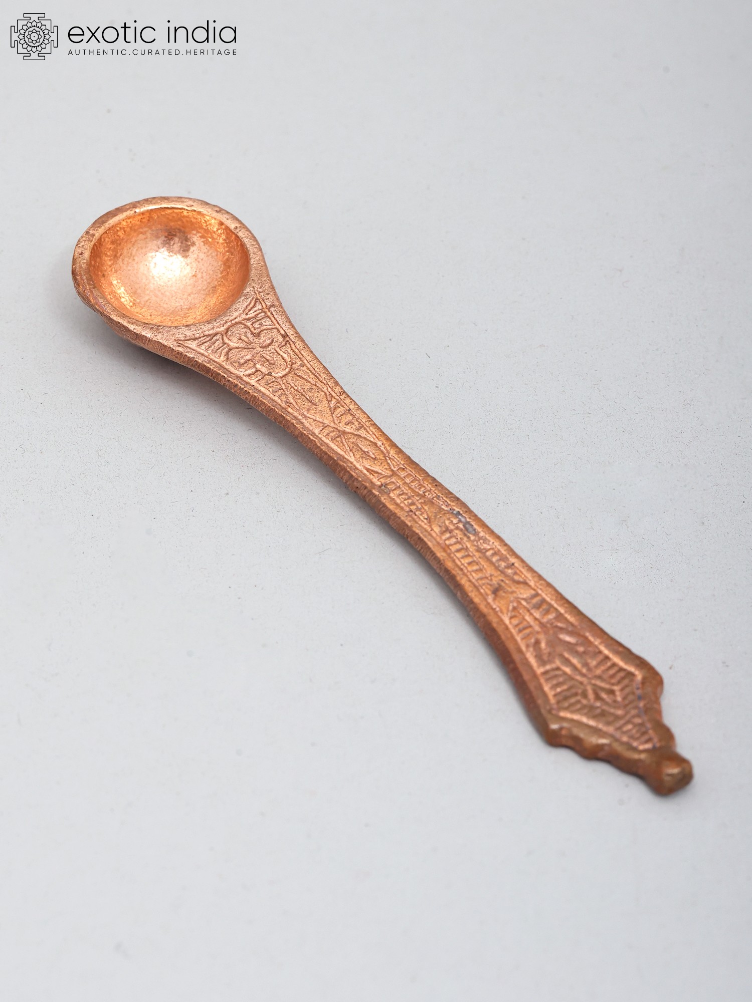 This exquisite copper Pancha Patra, a small yet significant ritualistic vessel, embodies the essence of ancient Indian spiritual practices. Crafted from pure copper, it carries with it the inherent sanctity and purifying properties attributed to this noble metal in Vedic traditions. Copper has long been revered for its ability to cleanse, energize, and channel divine vibrations, making it an ideal material for sacred implements. The warm, rich hue of the copper, enhanced by the handcrafted artistry, lends an aura of timeless devotion to this piece.