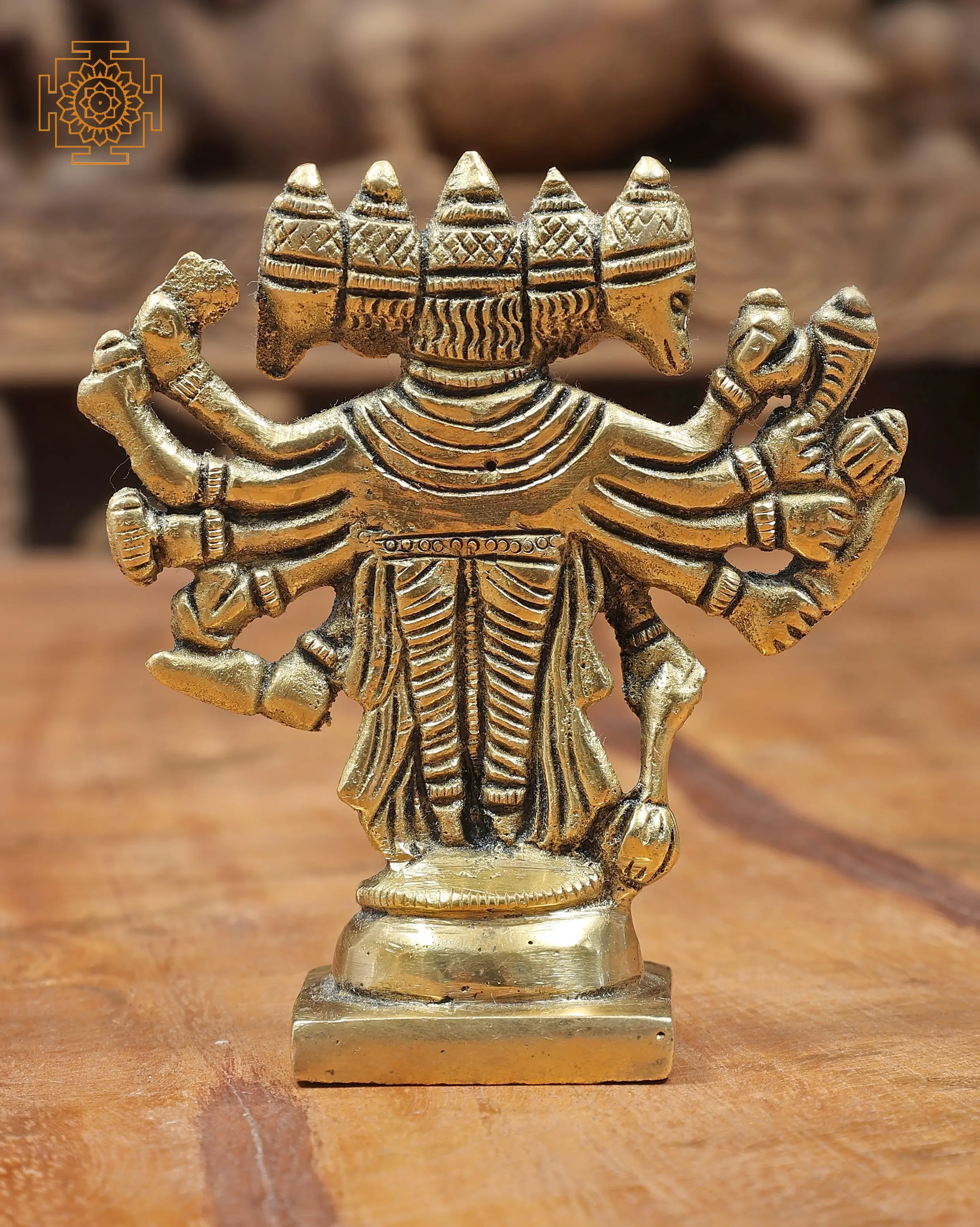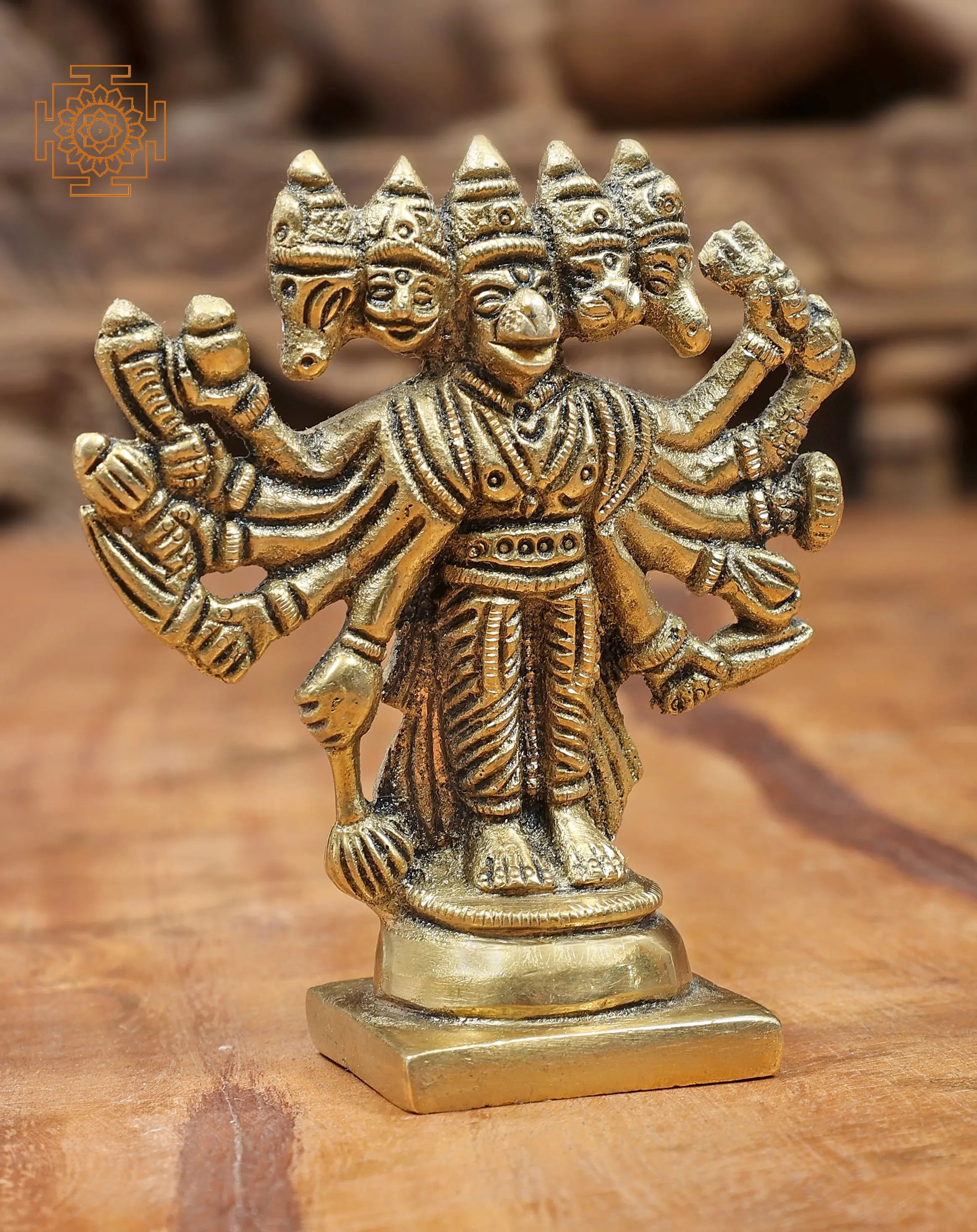 Crafted with devotion in India, the brass Panchmukhi Hanuman sculpture embodies boundless courage. With five faces representing five different deities, Hanuman symbolizes the power to overcome adversities from all directions. His hands hold a mace, a chakra, a conch shell, a bow, and a sword, signifying his readiness to protect and vanquish negativity. Each face embodies a facet of divinity - Varaha, Garuda, Narasimha, Hanuman, and Hayagriva. This artwork stands as a tribute to unwavering bravery and multifaceted divine intervention, inspiring us to embrace courage amidst challenges.