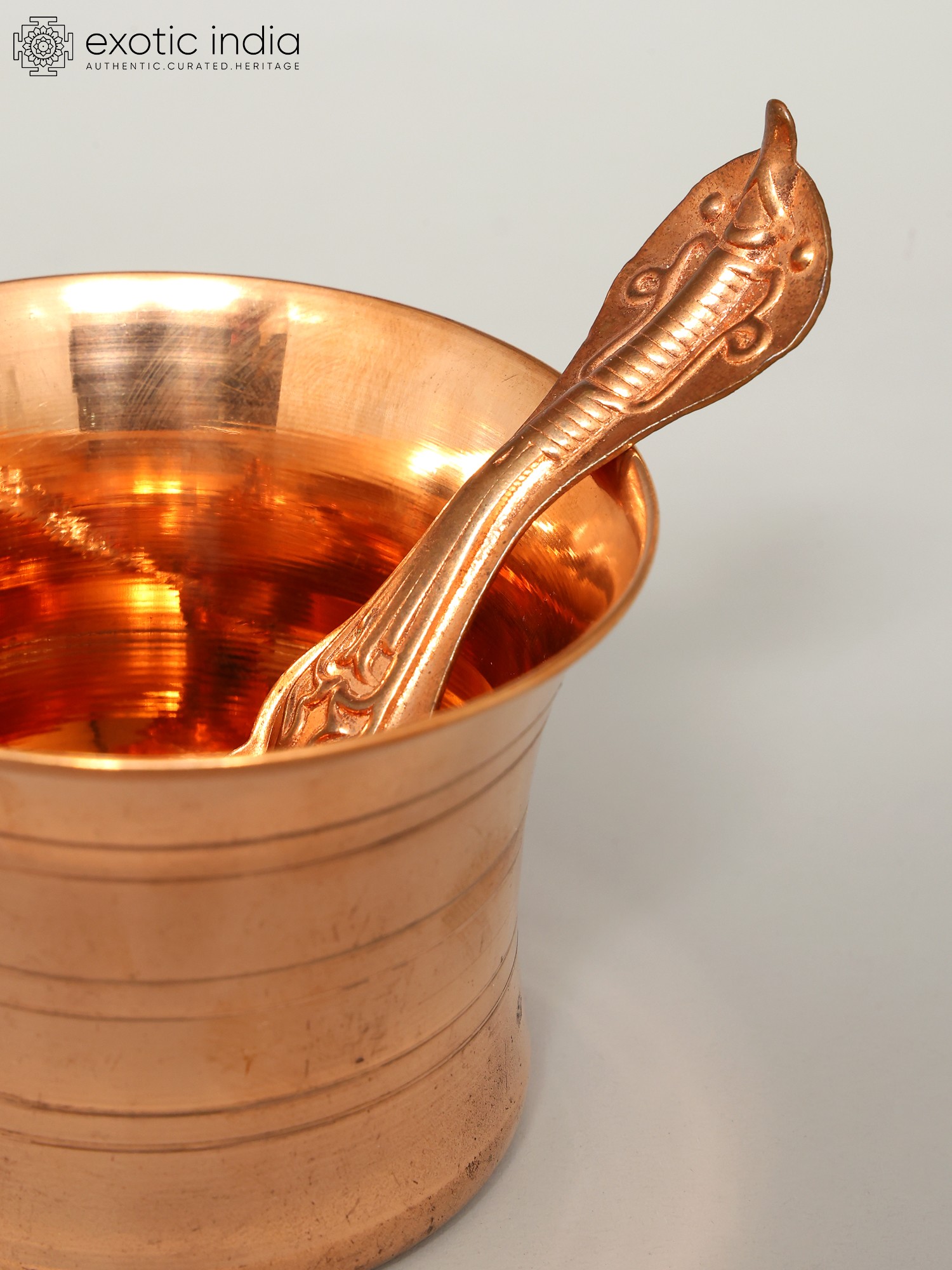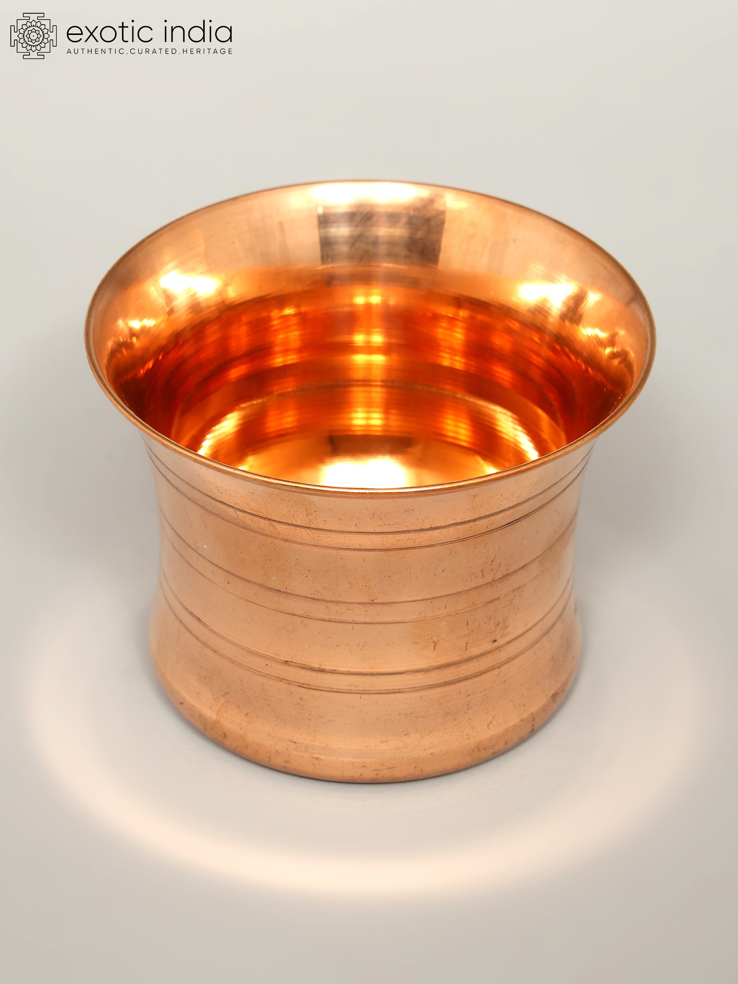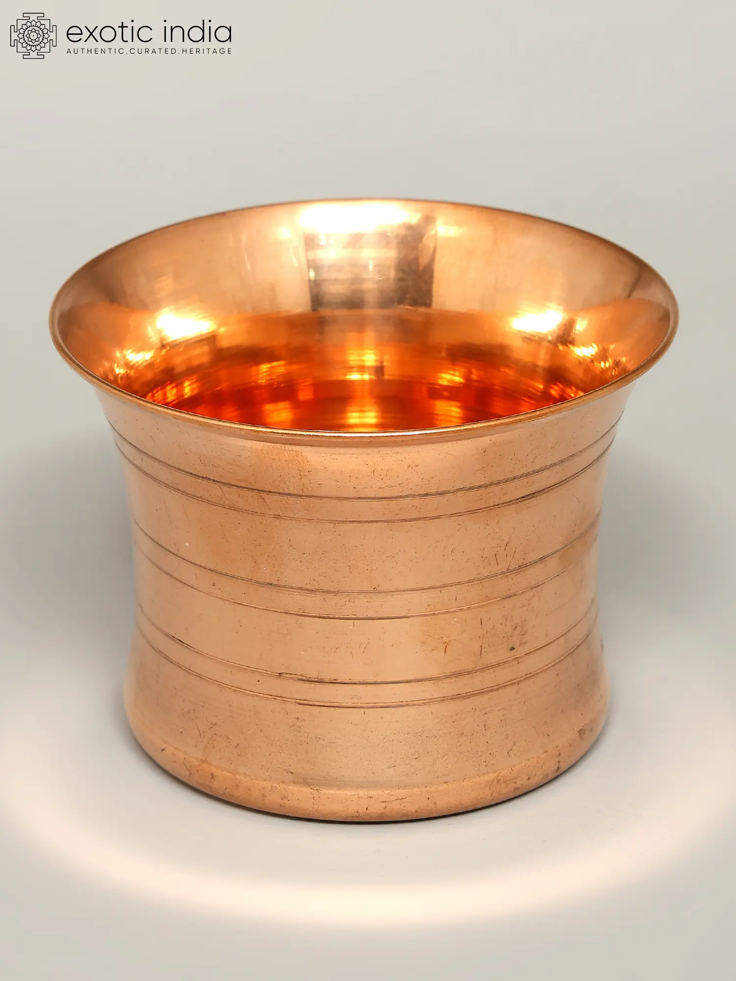 This finely crafted vessel, rendered in radiant copper, is more than just a bowl; it's a Panchapatra, a sacred instrument integral to Hindu rituals. Its simple, elegant form belies its profound significance, serving as a container for holy water, typically sourced from the Ganges or other sacred rivers, used for purification and sanctification during puja. The gentle curve of its rim and the subtle lines that encircle its form are a testament to the care and reverence with which it was created. The warm luster of the copper enhances its spiritual aura, promising to bring a sense of tranquility and tradition to your home.