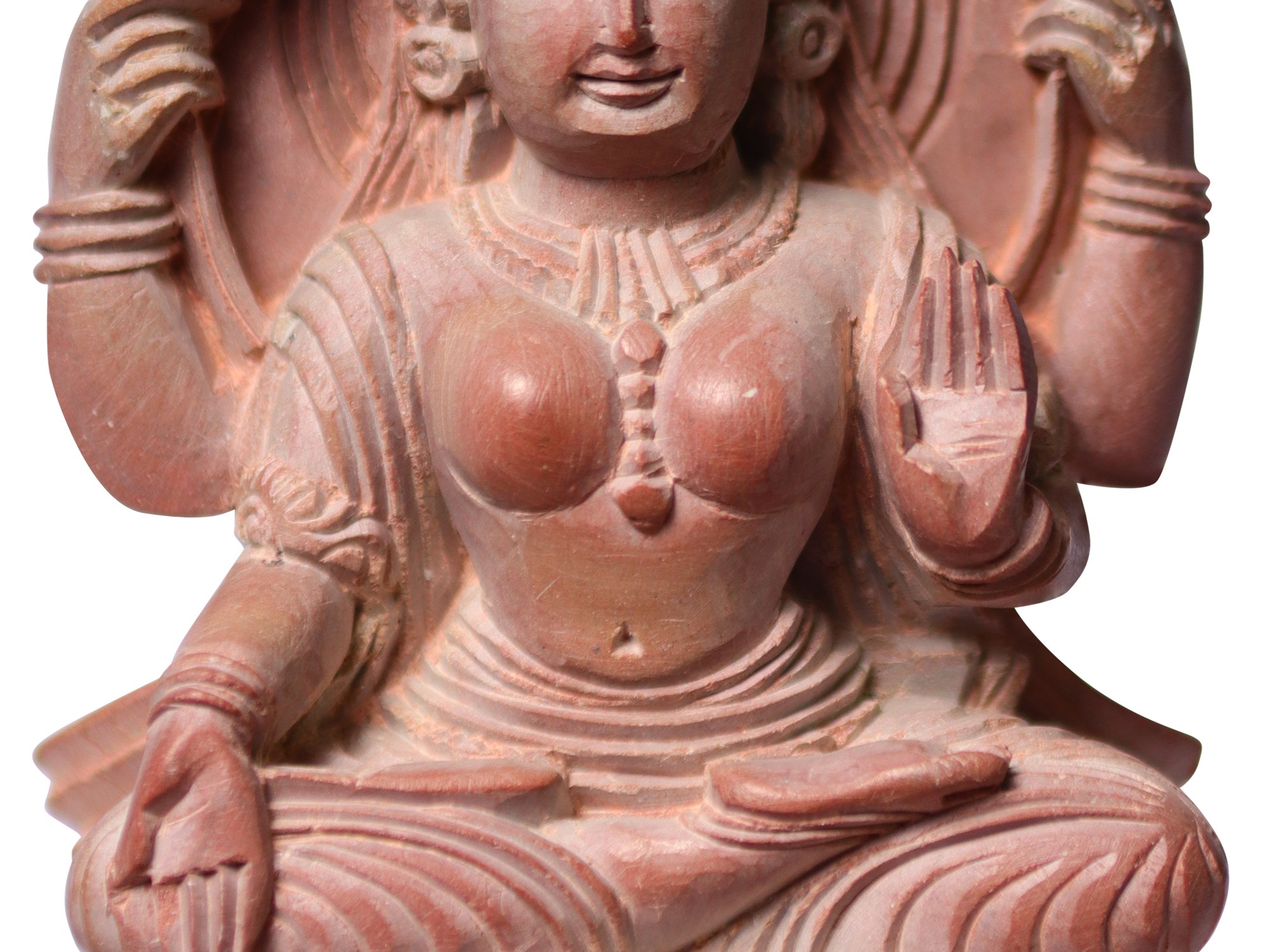 Invoke the divine presence of Goddess Lakshmi, the Hindu deity of wealth, prosperity, and auspiciousness, with this exquisite pink stone figurine. Crafted with meticulous detail, this statue captures the serene and benevolent aspect of the Goddess. Lakshmi is often depicted seated or standing on a lotus flower, a symbol of purity and spiritual enlightenment. In this representation, she is elegantly seated, her posture radiating peace and tranquility. Her gentle smile and compassionate eyes invite blessings and abundance into your home or sacred space.
