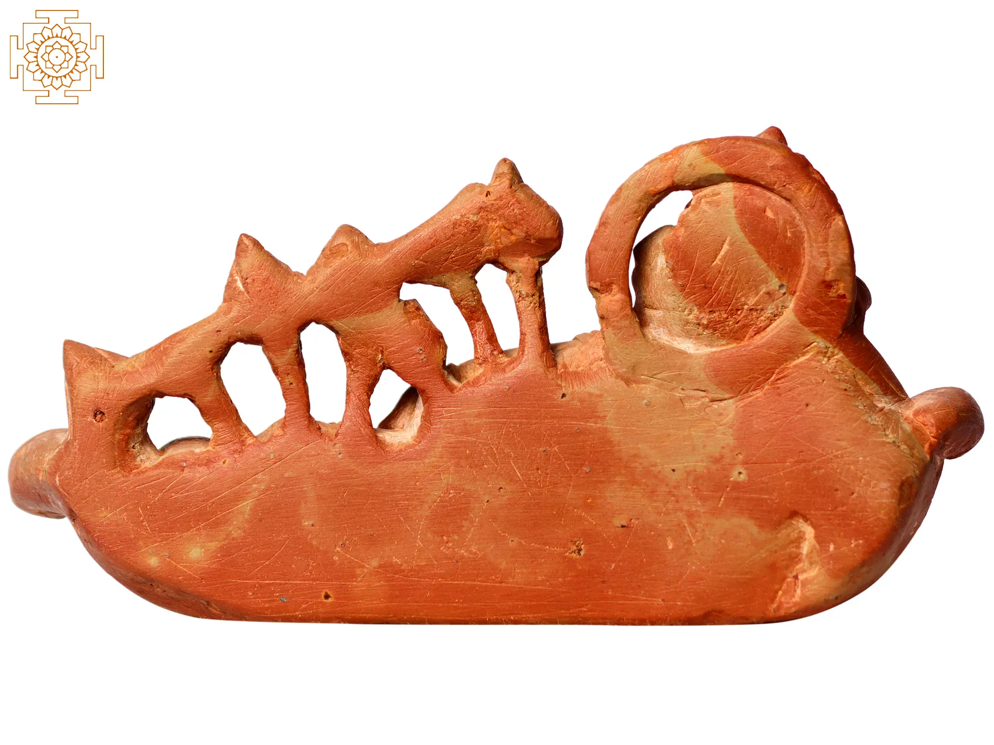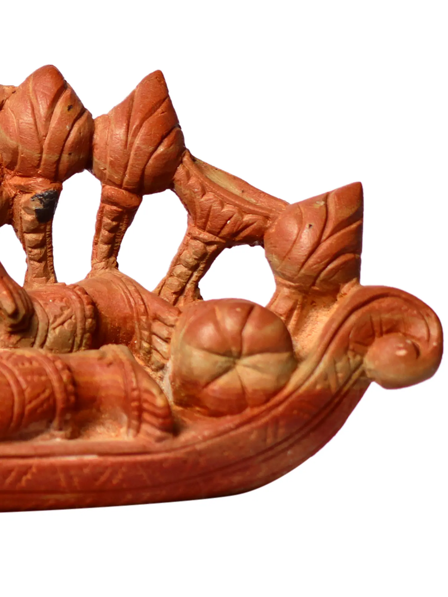 Craved from Pink stone - Lord Ganesha reclines gracefully on a lotus bed, adorned in resplendent pink stone attire symbolizing his supreme authority and divine charm. The lotus bed represents purity and spiritual awakening, as the lotus emerges from the mud unstained, signifying transcendence and enlightenment while Lord Ganesha's reclining posture signifies deep relaxation and serenity, reminding us to find tranquility within ourselves amidst the chaos of the external world.