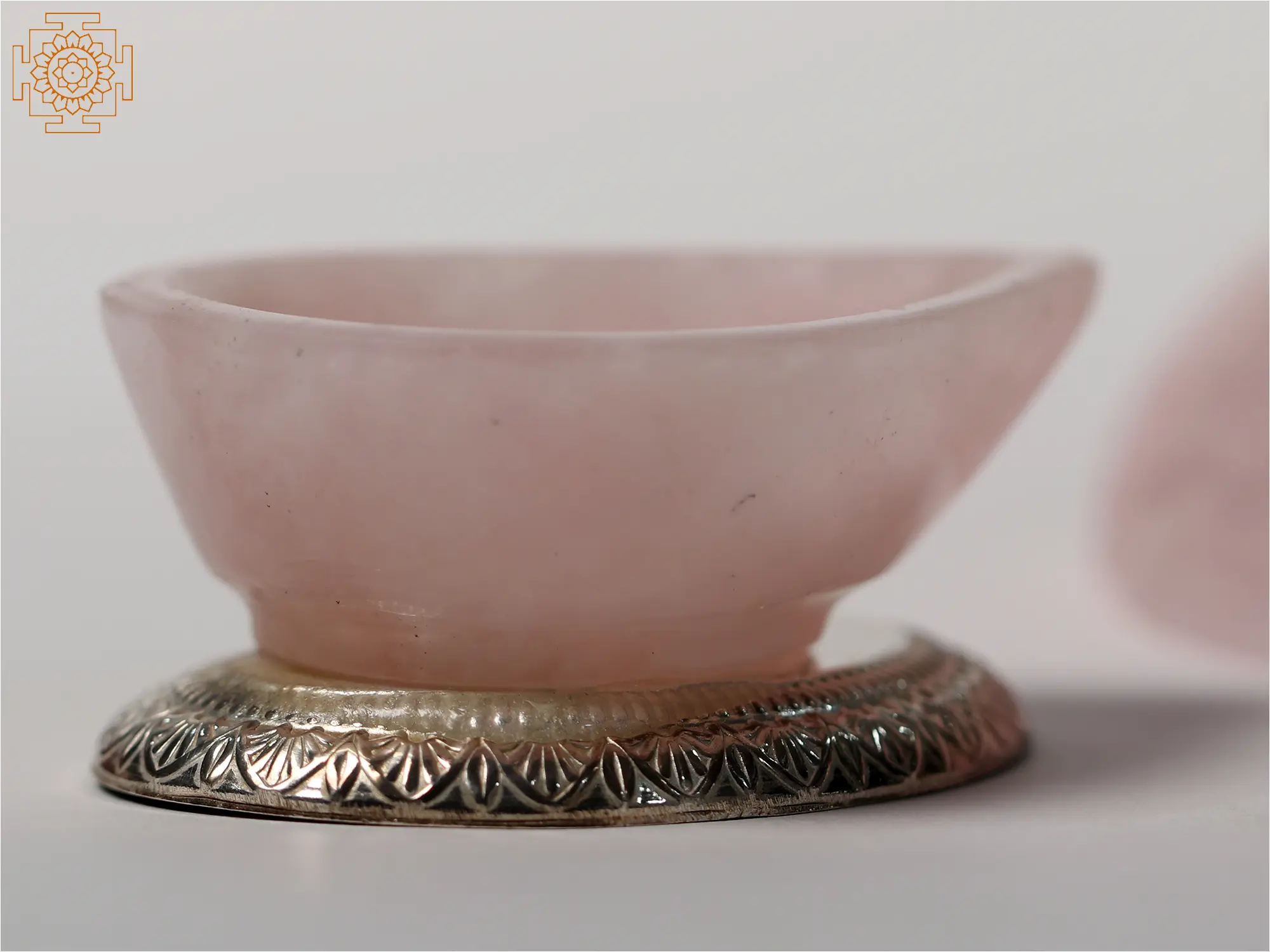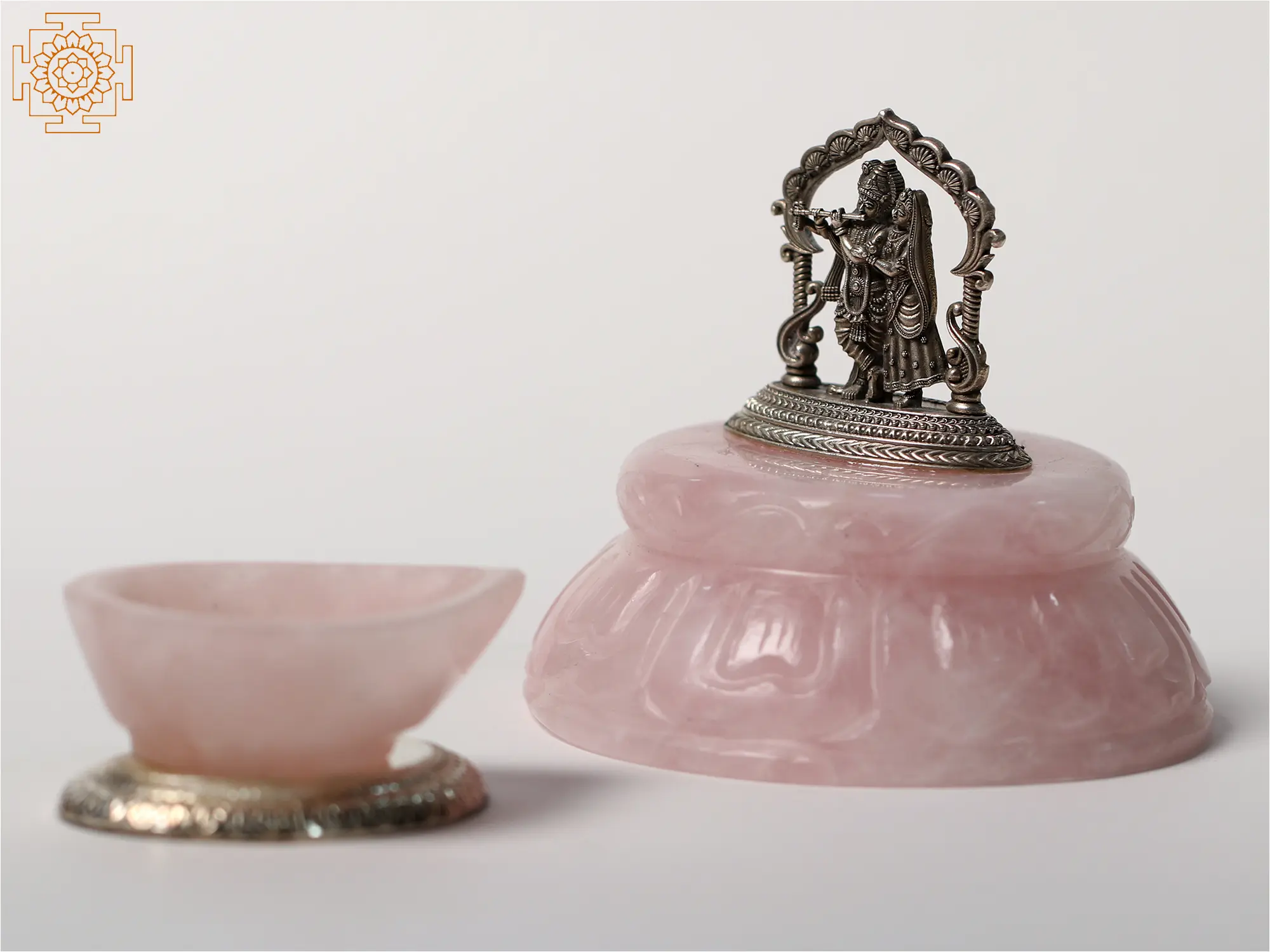 This silver statue of Radha Krishna on a Rose Quartz Base depicts the holy love story of Radha and Krishna. The black-silver shine of the statue gives it a different look that captures the heart of the beholder and also provides a contrasting view against the light pink color of the gemstone. The statue is also assisted with a pink gemstone lamp with a beautifully decorated silver base, enhancing its elegance. Radha and Krishna stand beneath an aureole, symbolizing their divine aura, with Lord Krishna playing the flute and Radha gazing at Him with deep affection. This intricately crafted piece is a thoughtful gift, exquisitely presented in a gift box, perfect for celebrating love and devotion.