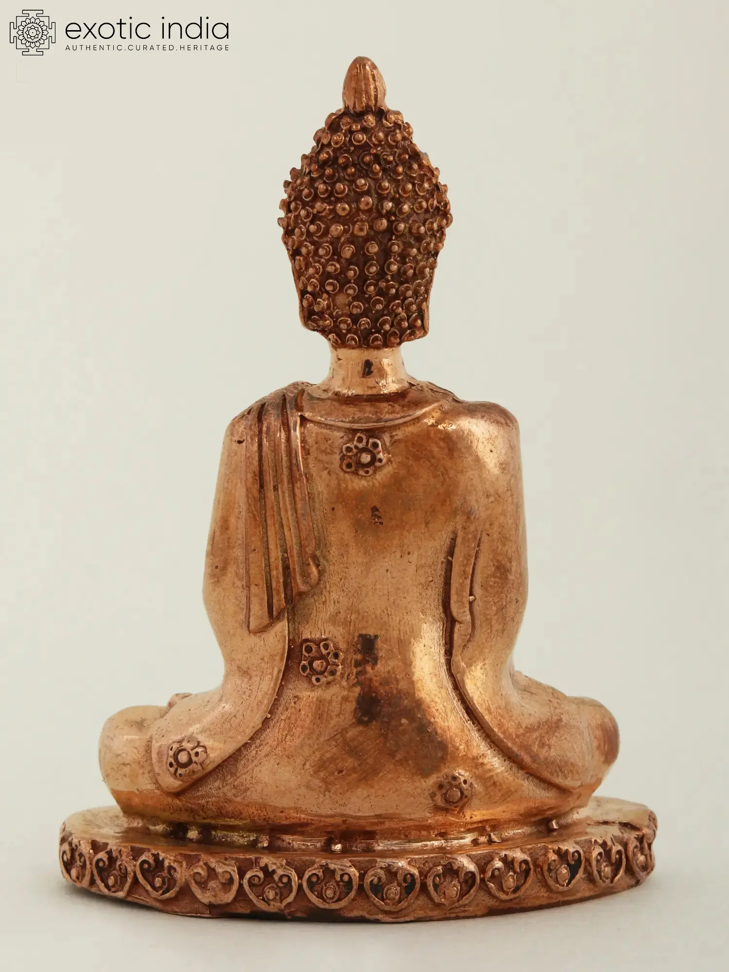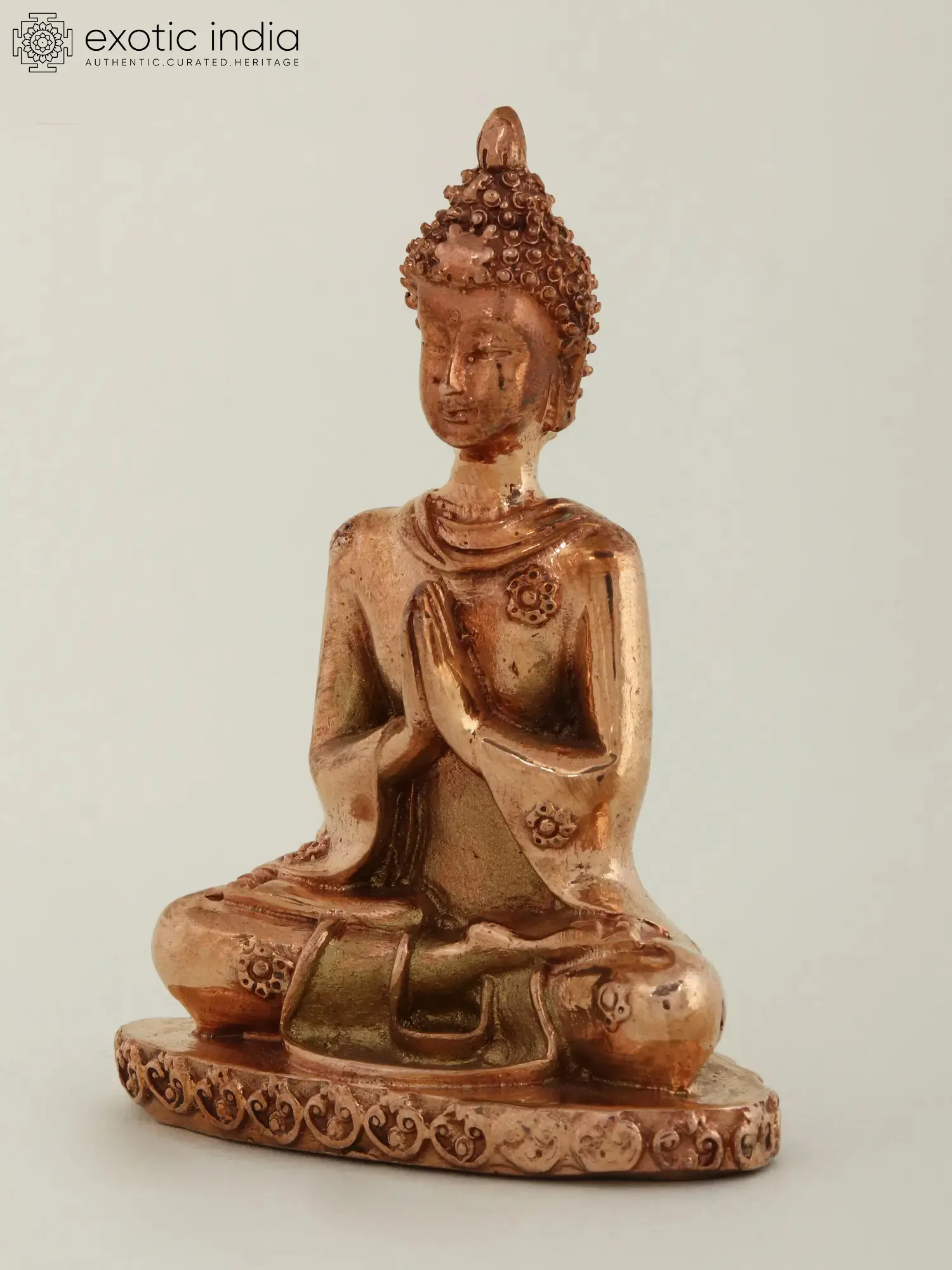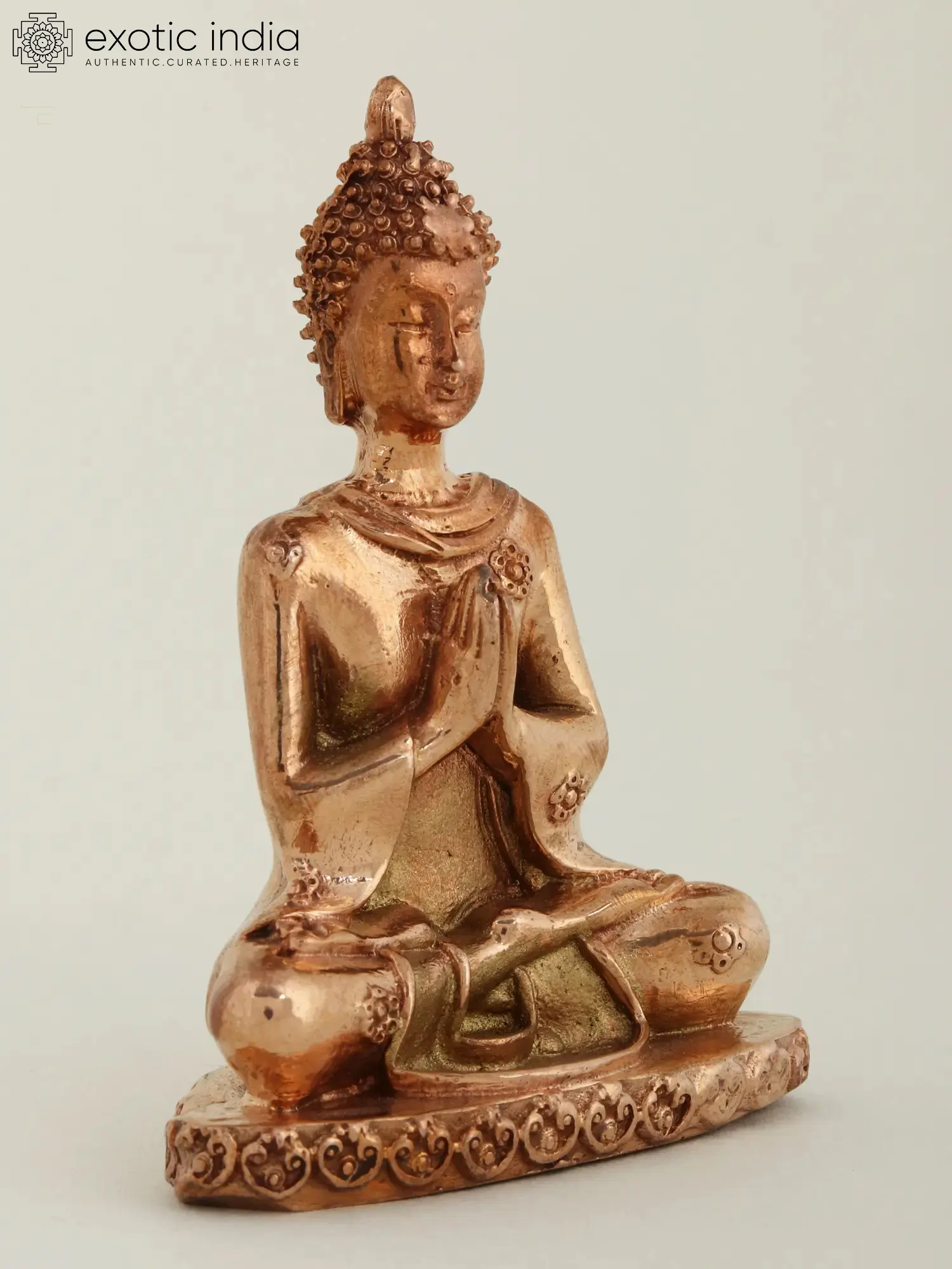 In the serenity of a Small Sitting Lord Buddha Bronze Statue in Namaskar Gesture, experience the beautiful journey of enlightenment. Buddha's hands in namaskar symbolize the convergence of wisdom and compassion. The creation of this artwork takes you on a personal odyssey of self-discovery and inner peace. Just as Buddha found enlightenment within, this sculpture states that the path to true awakening lies not in grand gestures but in the simple act of bowing to the divine light within us and recognizing it in others.