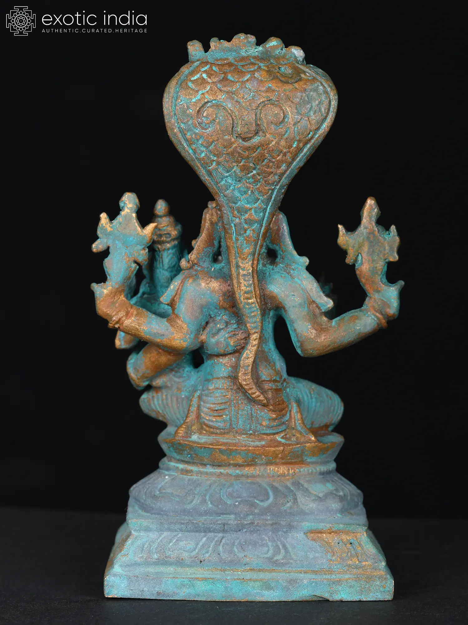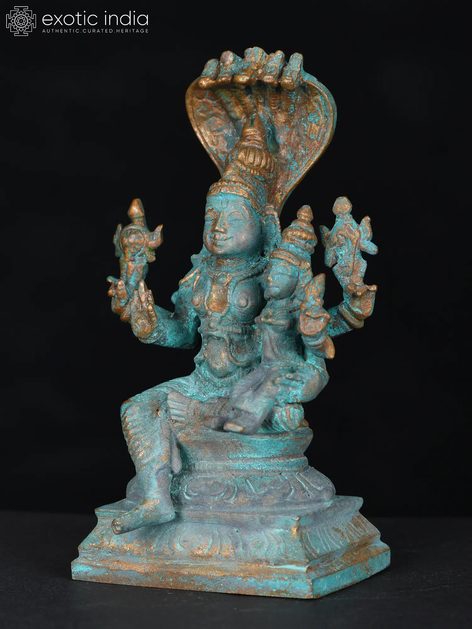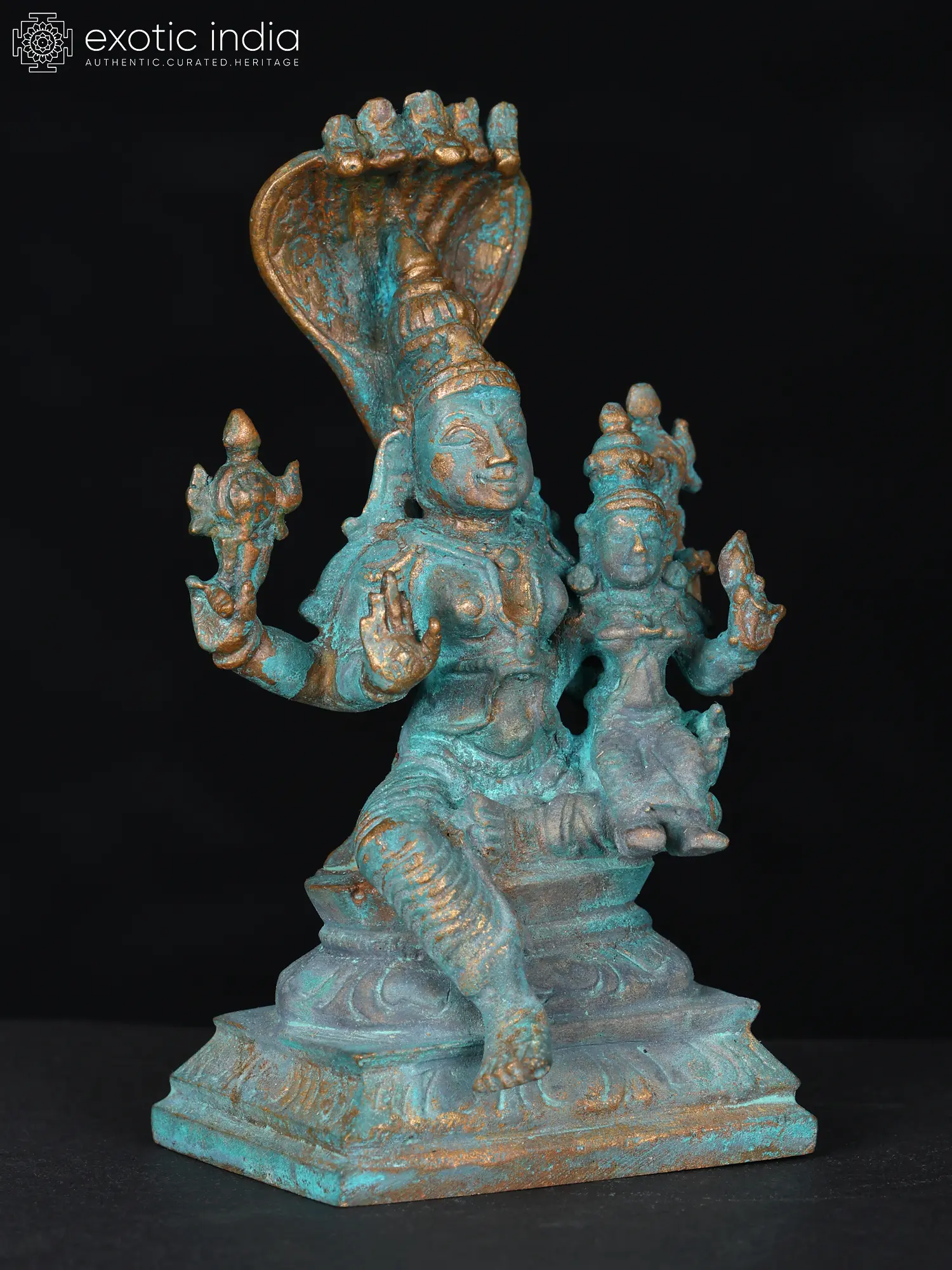 Sri Vishnu on the throne of Sheshanaga with goddess Lakshmi by his side is the perfect vision of cosmic balance and auspiciousness, translated in the antique idiom of bronze.