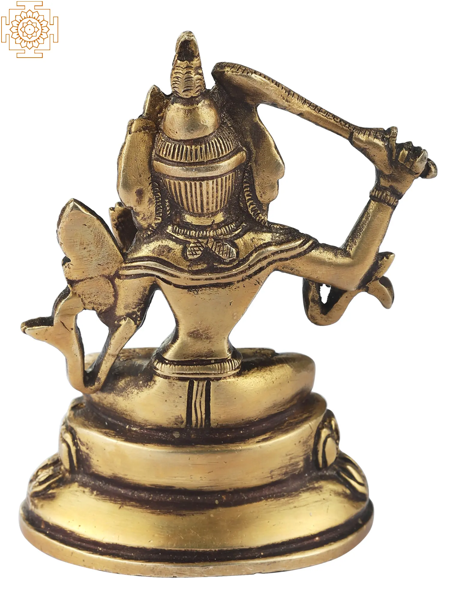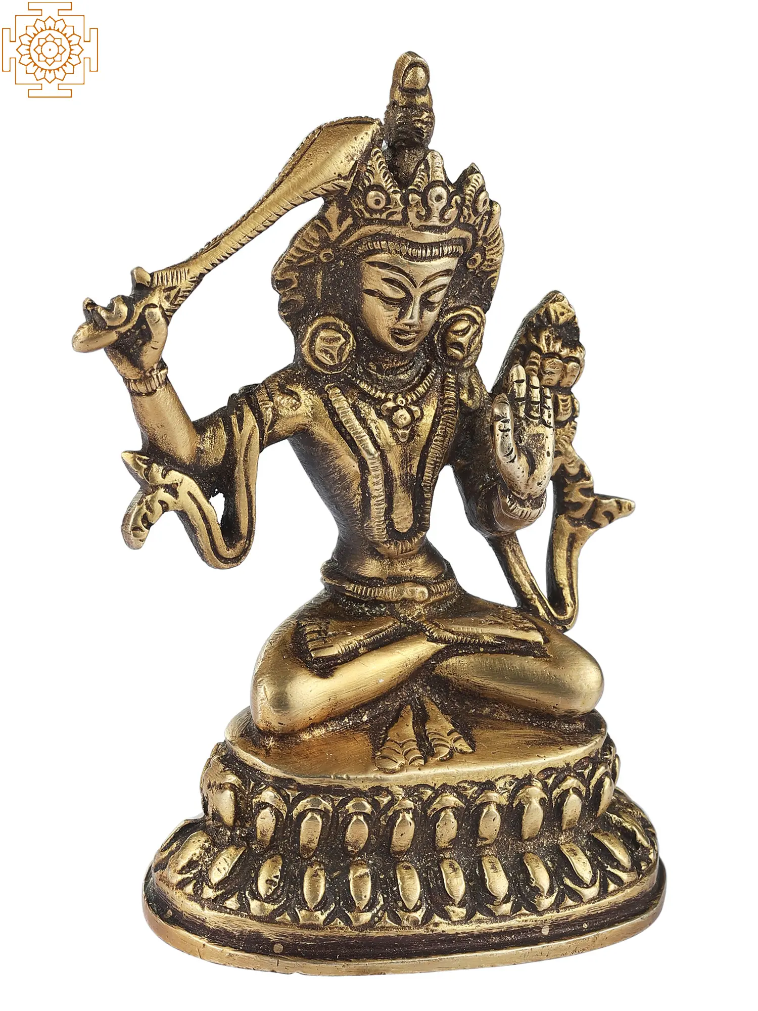 “Wisdom Embodied" - The Small Size Manjushri, a brass marvel from India, pays homage to the Tibetan Buddhist Bodhisattva. Handmade, it portrays Manjushri holding the sword of wisdom, cutting through ignorance. His lotus seat signifies purity amid chaos. Manjushri's radiant presence embodies enlightenment's brilliance, guiding seekers on their path to wisdom. As we gaze upon this figure, we're reminded of the inner sword that dispels illusion and grants clarity. This sculpture is a testament to the transformative journey of enlightenment and our pursuit of discerning truth from falsehood.