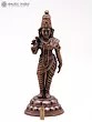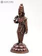 You'll appreciate the intricate detailing that graces this small standing form, from the ornate headdress to the finely rendered jewelry and the flowing dhoti. The sculptor has masterfully captured a sense of poise and divine authority, evident in the gentle gesture of the raised hand. The warm, earthy tones of the copper are enhanced by the subtle variations in texture, creating a visually captivating object despite its modest dimensions.