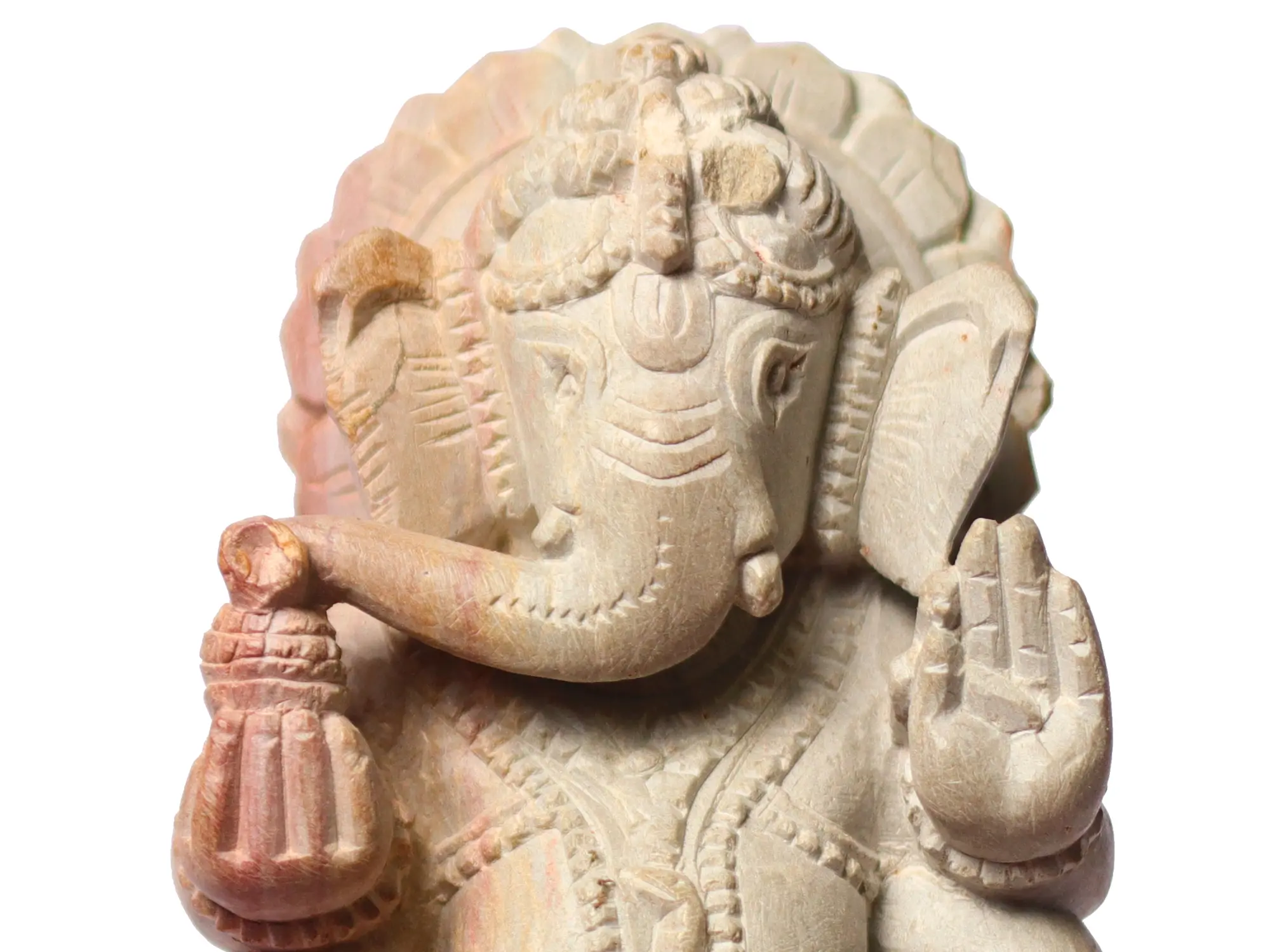 This exquisite statue captures the benevolent form of Lord Ganesha, the beloved elephant-headed deity revered as the remover of obstacles and the patron of arts and sciences. Carved from a beautiful pink stone, this piece exudes a gentle warmth and an understated elegance that makes it a perfect addition to any sacred space or personal collection. The intricate detailing showcases the skillful craftsmanship that imbues this representation with life and spiritual significance. ––––––––––––––––––––