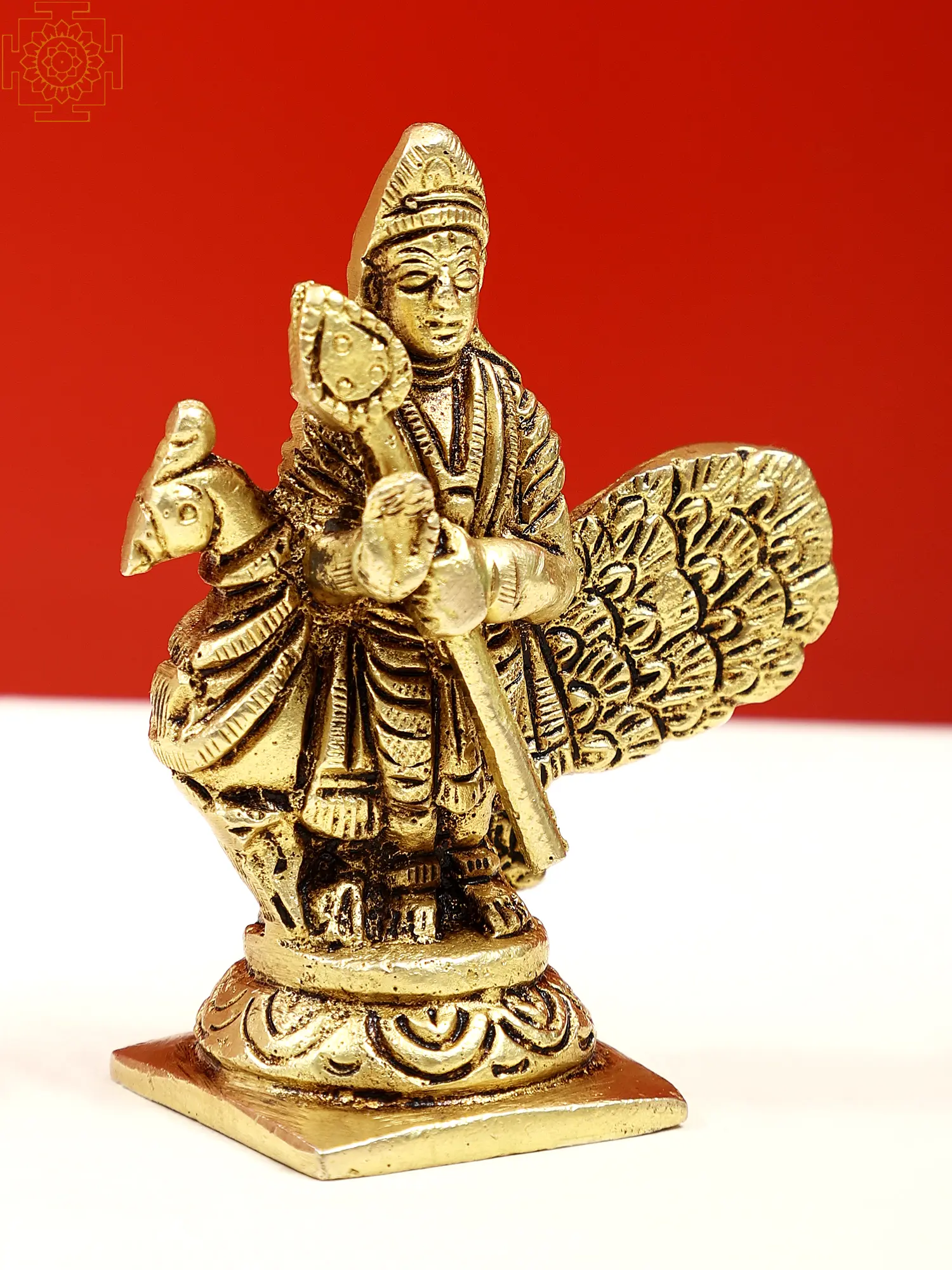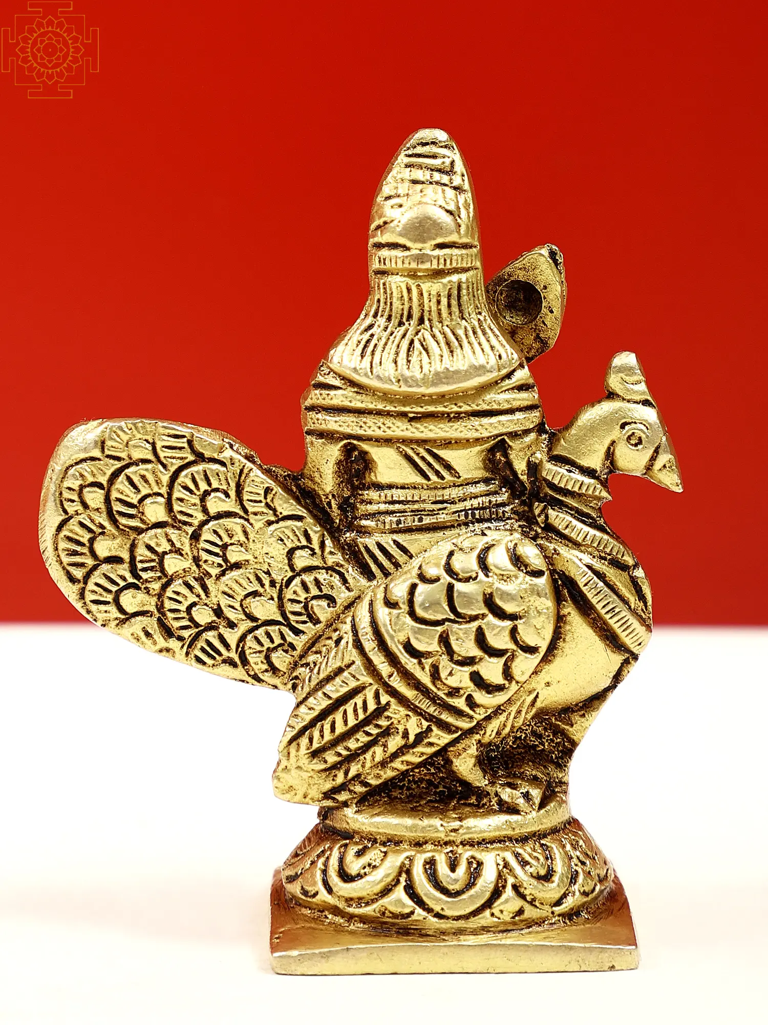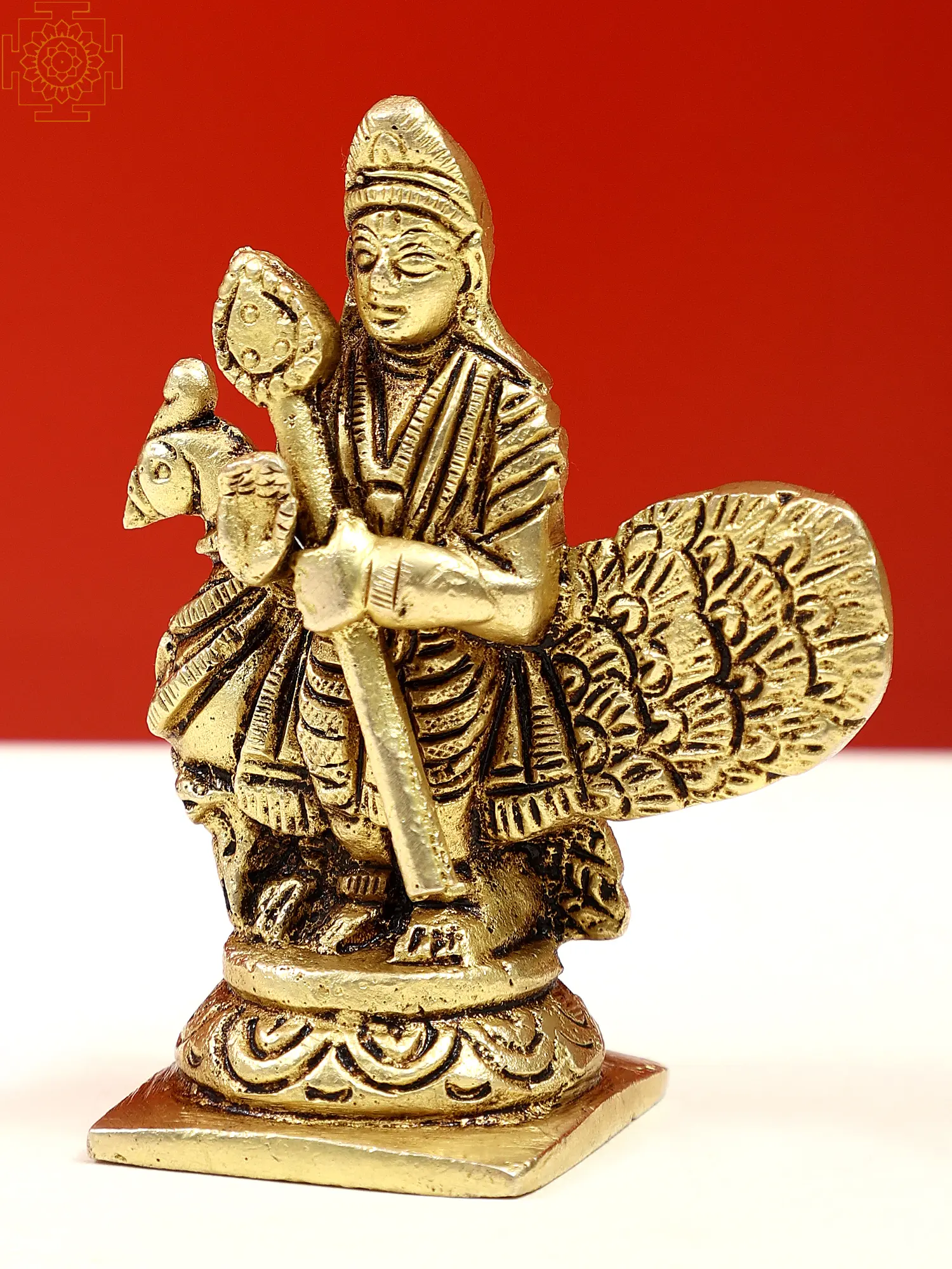 Filled with devotion, the small Lord Kartikeya sculpture reveals the deity atop his Vahana, the peacock. Kartikeya, the valorous son of Lord Shiva, signifies triumph over adversity. His spear signifies his might, while the peacock's regal plumage showcases its grace. Kartikeya's six faces symbolize the six seasons, reflecting his cosmic presence. Riding the peacock, he conquers ego and vanity. This artwork invites us to embrace Kartikeya's courage, inspiring us to rise above challenges with valor and determination.