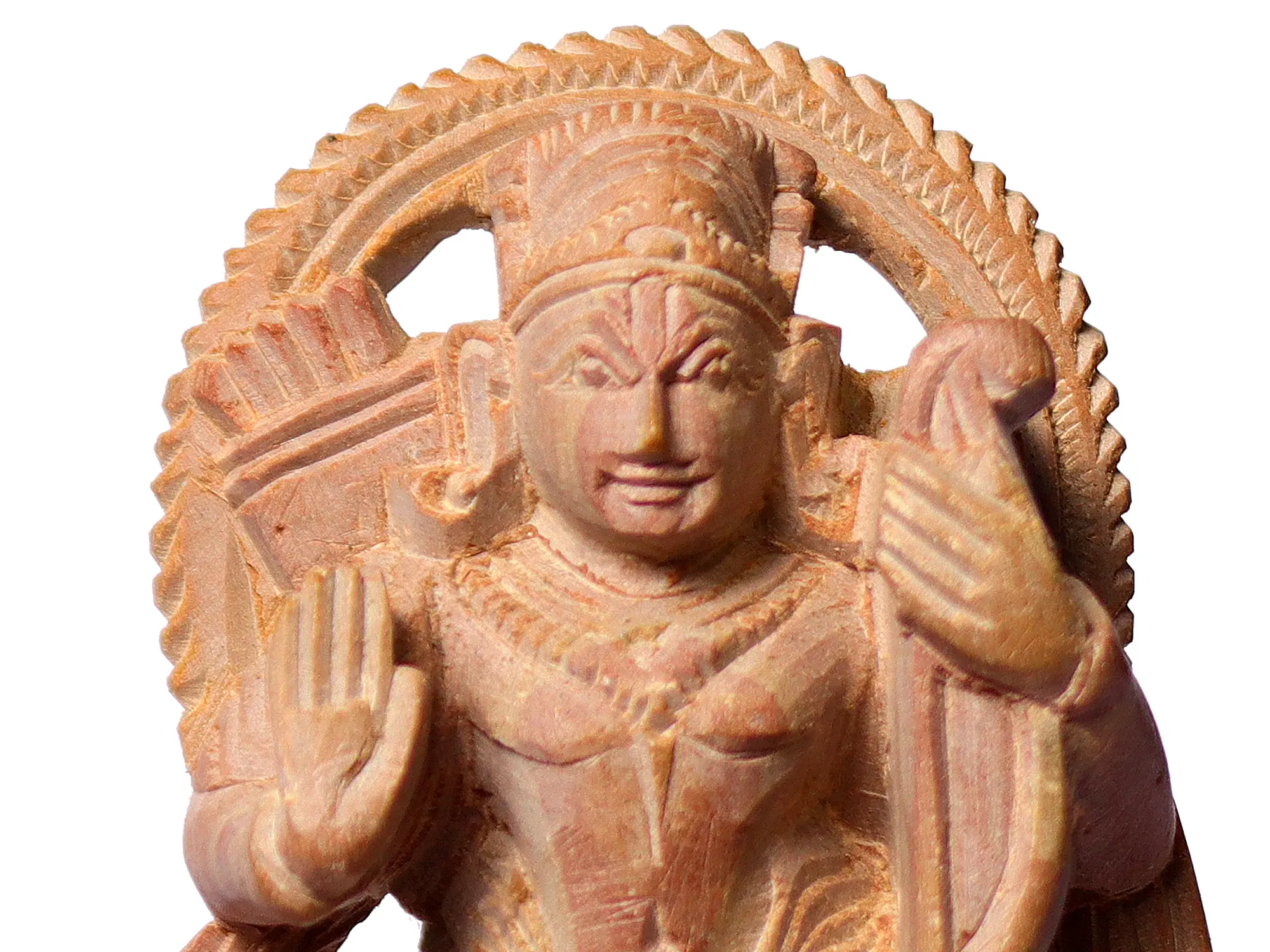 The statue portrays Lord Rama holding his iconic bow and arrow, the tools of his righteous battles against the forces of evil, most notably the demon king Ravana. His raised hand, in the Abhaya Mudra, signifies protection and reassurance, assuring devotees of his benevolent grace and the dispelling of fears. The elaborate headdress and the finely detailed attire reflect the regality and divine status of the Lord. The circular aureole behind him, reminiscent of the sun or a divine halo, further accentuates his celestial nature and his role as a beacon of light and truth. The intricate carving, from the subtle folds of his garments to the determined set of his expression, showcases the meticulous skill of the artisan, imbuing the stone with life and spiritual energy. This representation is a powerful visual embodiment of the spiritual narratives that have shaped cultures and guided millions for millennia.