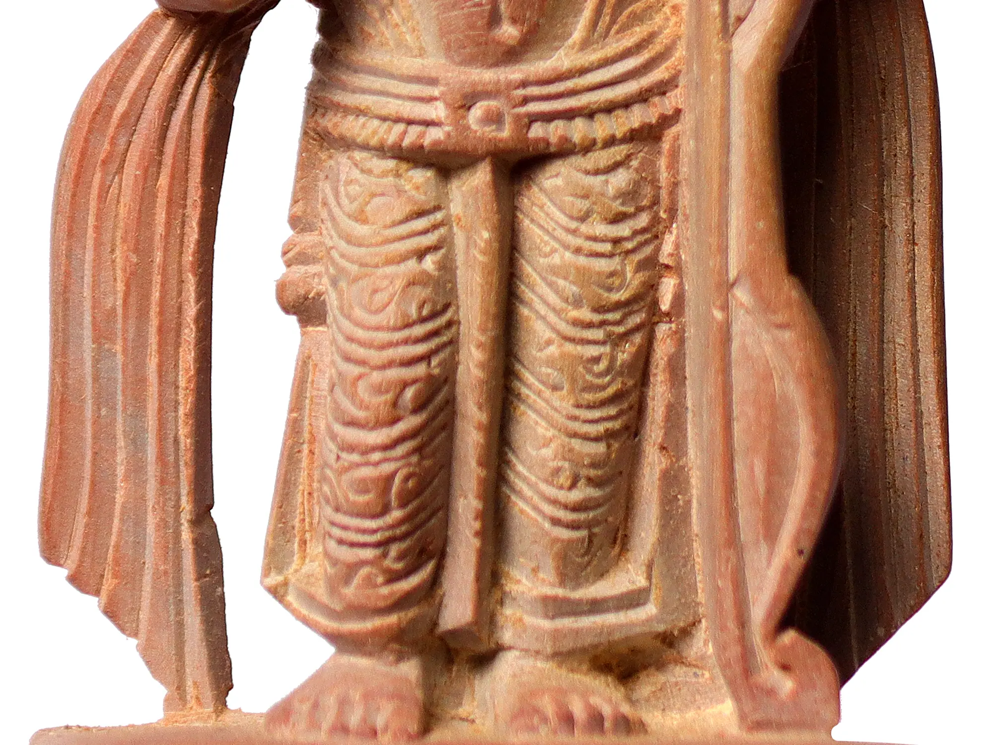 This exquisite statue captures the divine presence of Lord Rama, the revered protagonist of the epic Ramayana, in a standing posture of serene authority. Crafted from beautiful pink stone, this piece is a testament to the enduring artistry and deep spiritual devotion that characterizes Indian craftsmanship. The warm, earthy tones of the stone lend a natural, grounded quality to the divine form, evoking the very essence of the earth from which it is carved.