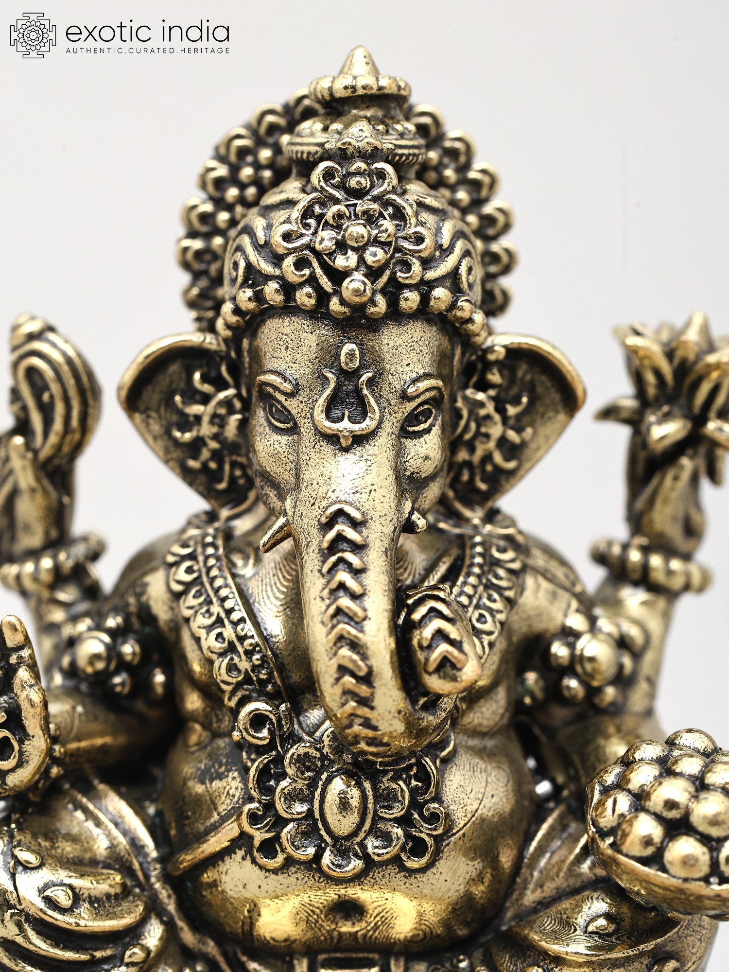 7" Four-Armed Ganesha Seated in Royal Ease Posture In Brass | Handmade | Made In India
