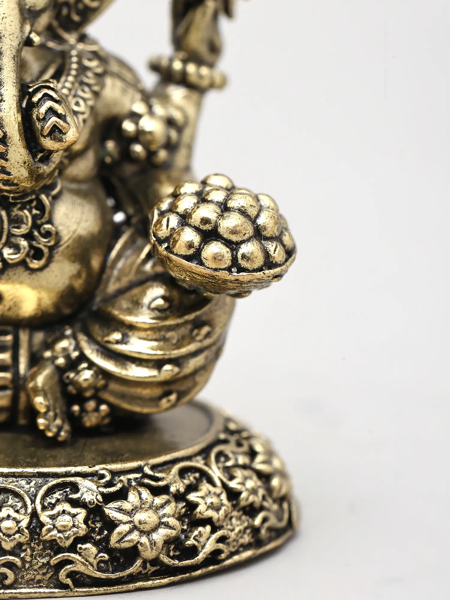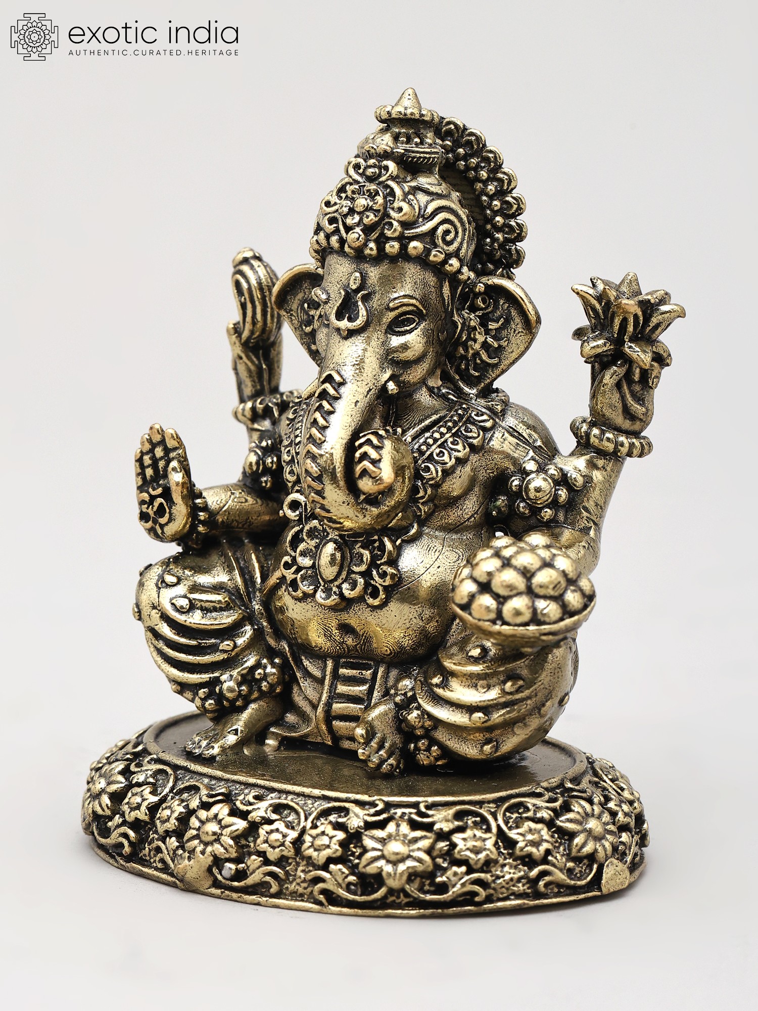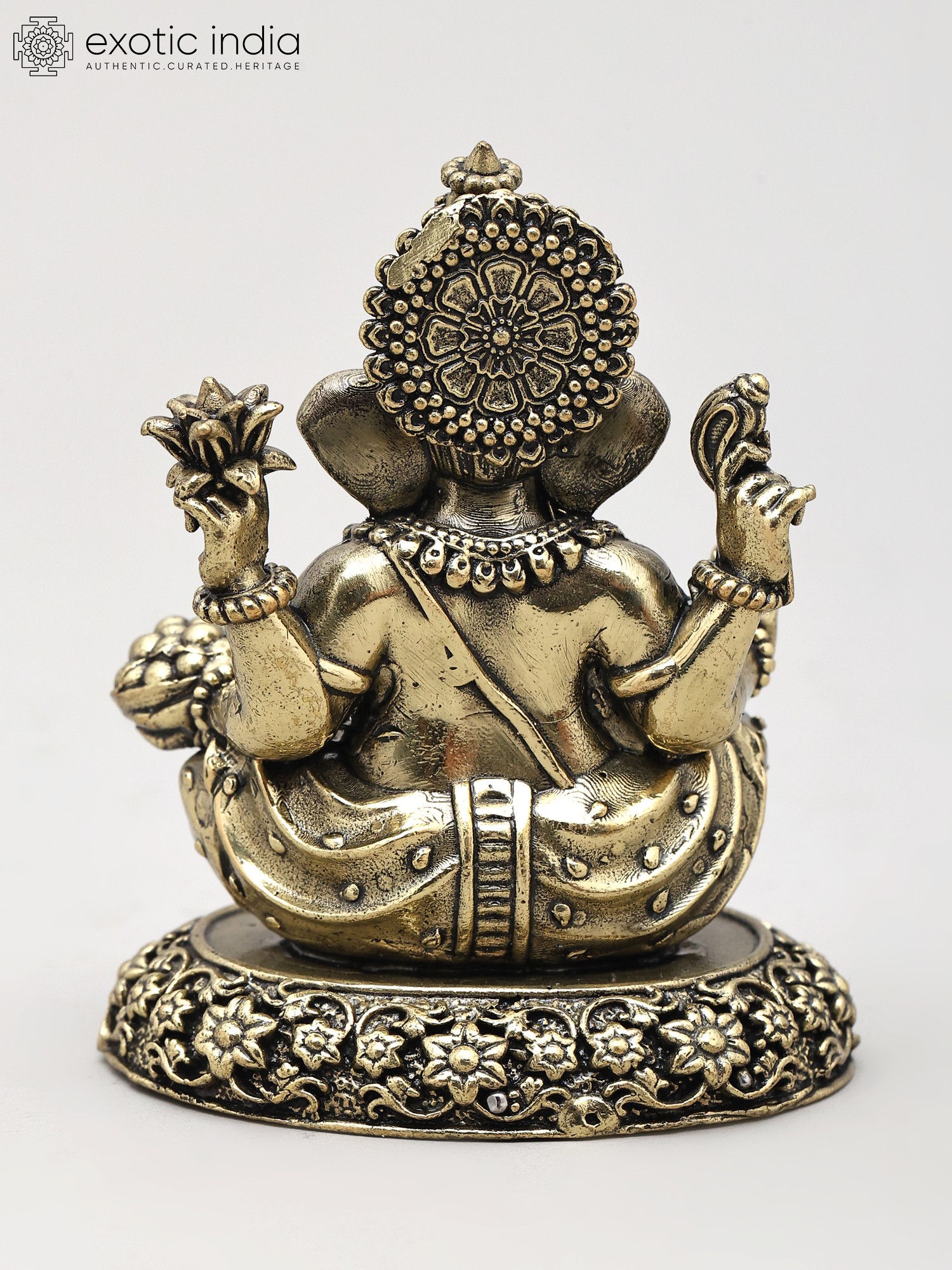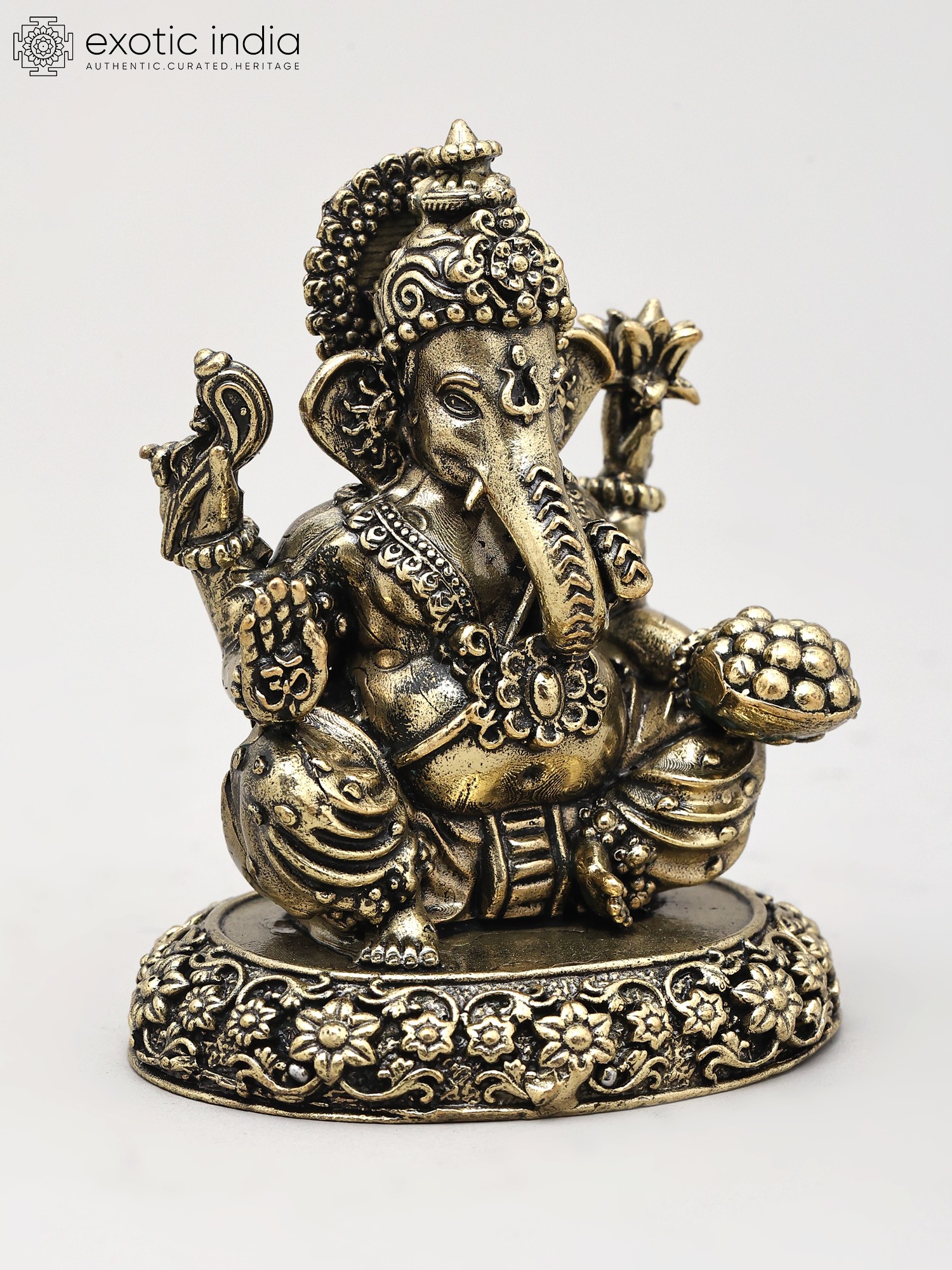 3" Small Four-Armed Ganesha with Modak & Mushak: A Divine Presence | Brass Idol