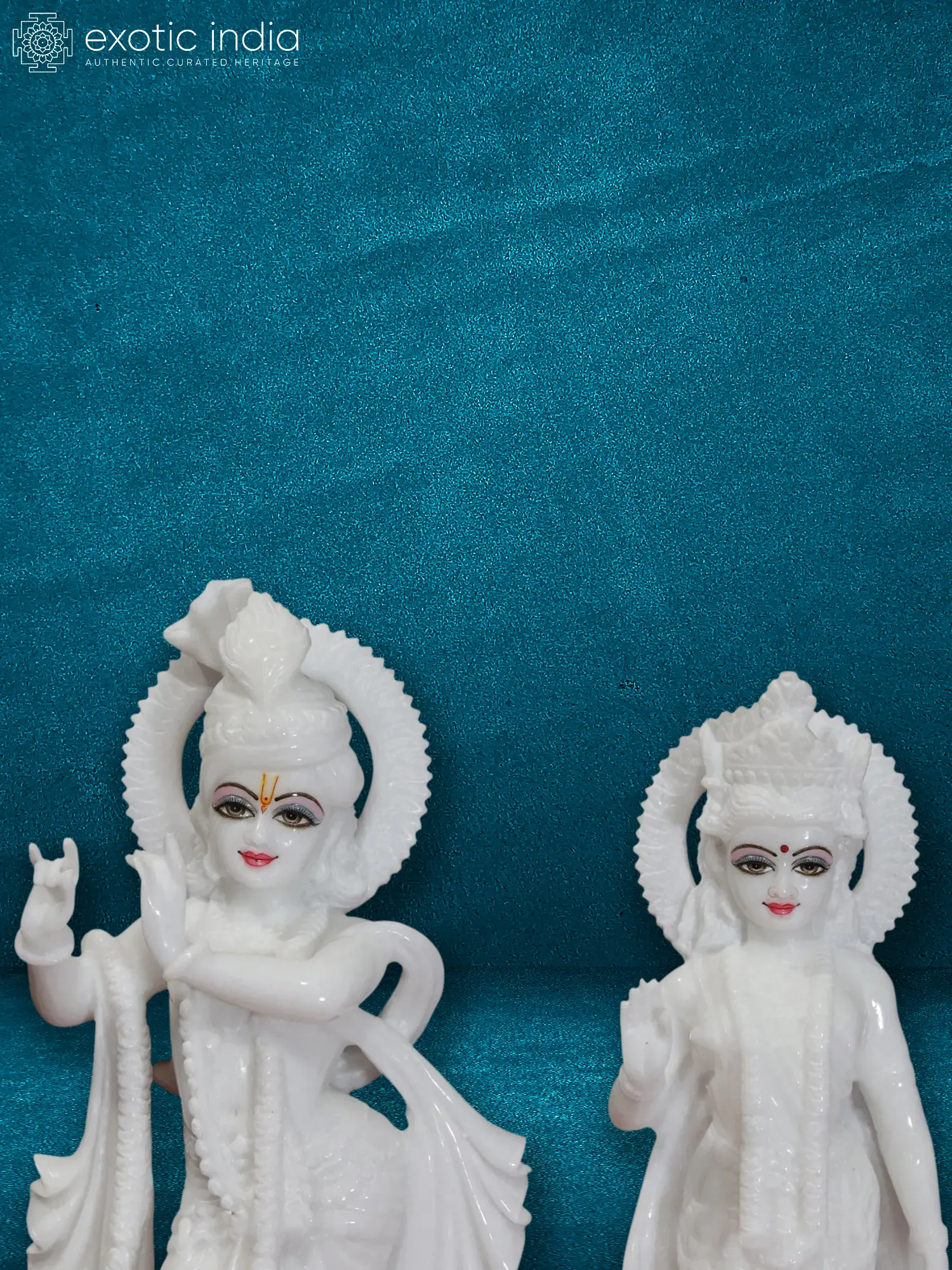 Each curve, each fold of fabric, and the subtle expressions on their faces have been meticulously carved by master artisans. The lustrous white marble brings a timeless elegance to the figures, highlighting the divine radiance of Radha and Krishna. The delicate carving of the halo behind each figure adds to their celestial aura, suggesting their divine status. The presence of the swan at Krishna's feet is symbolic of purity and grace, further enhancing the spiritual narrative. This idol is not merely a decorative piece; it is a testament to the enduring legacy of Indian craftsmanship and the profound spiritual narratives that have shaped culture for millennia. This magnificent sculpture serves as a constant reminder of divine love, devotion, and the pursuit of spiritual union. It is a piece that will undoubtedly become a cherished centerpiece, radiating peace and sanctity.