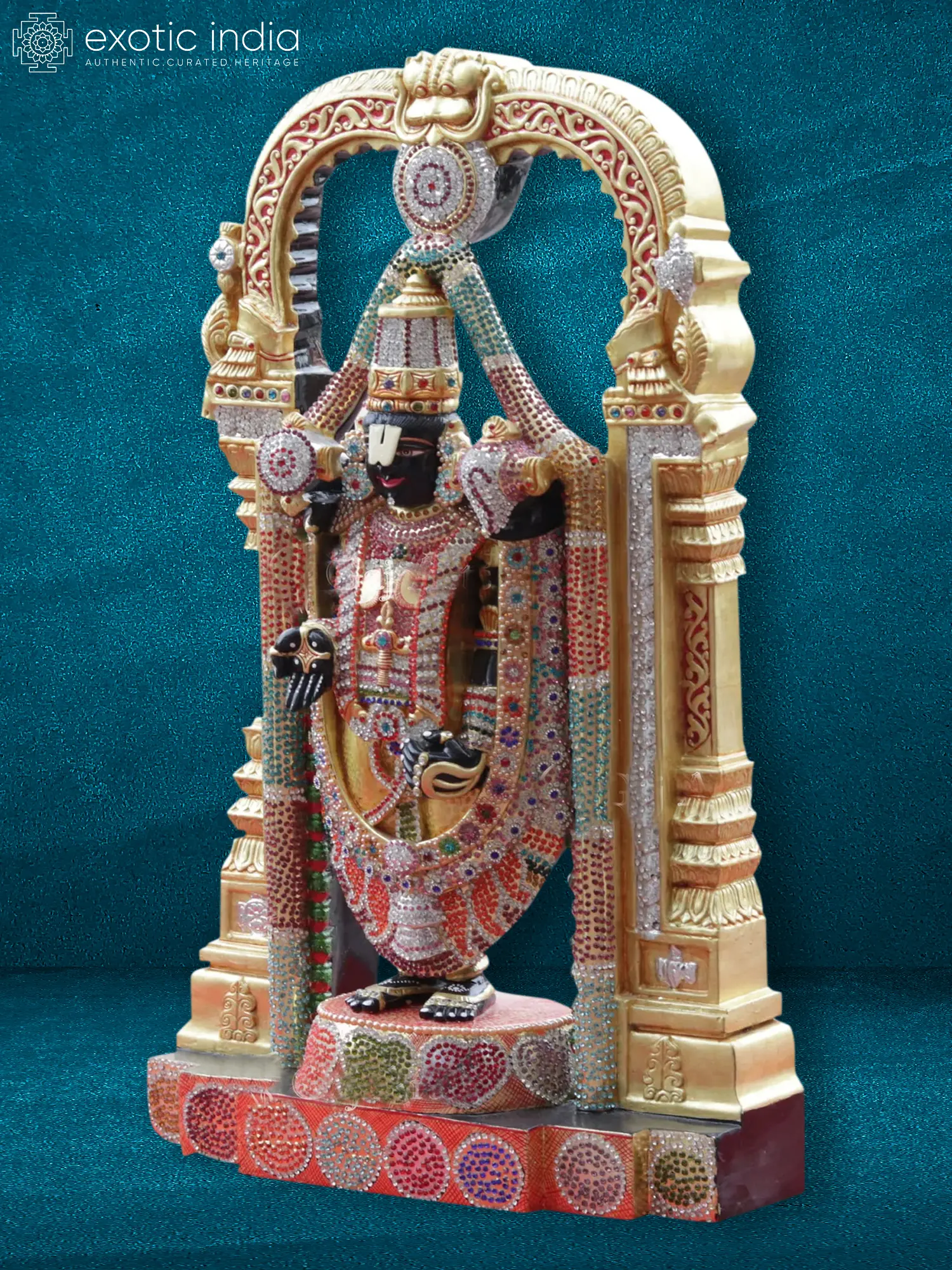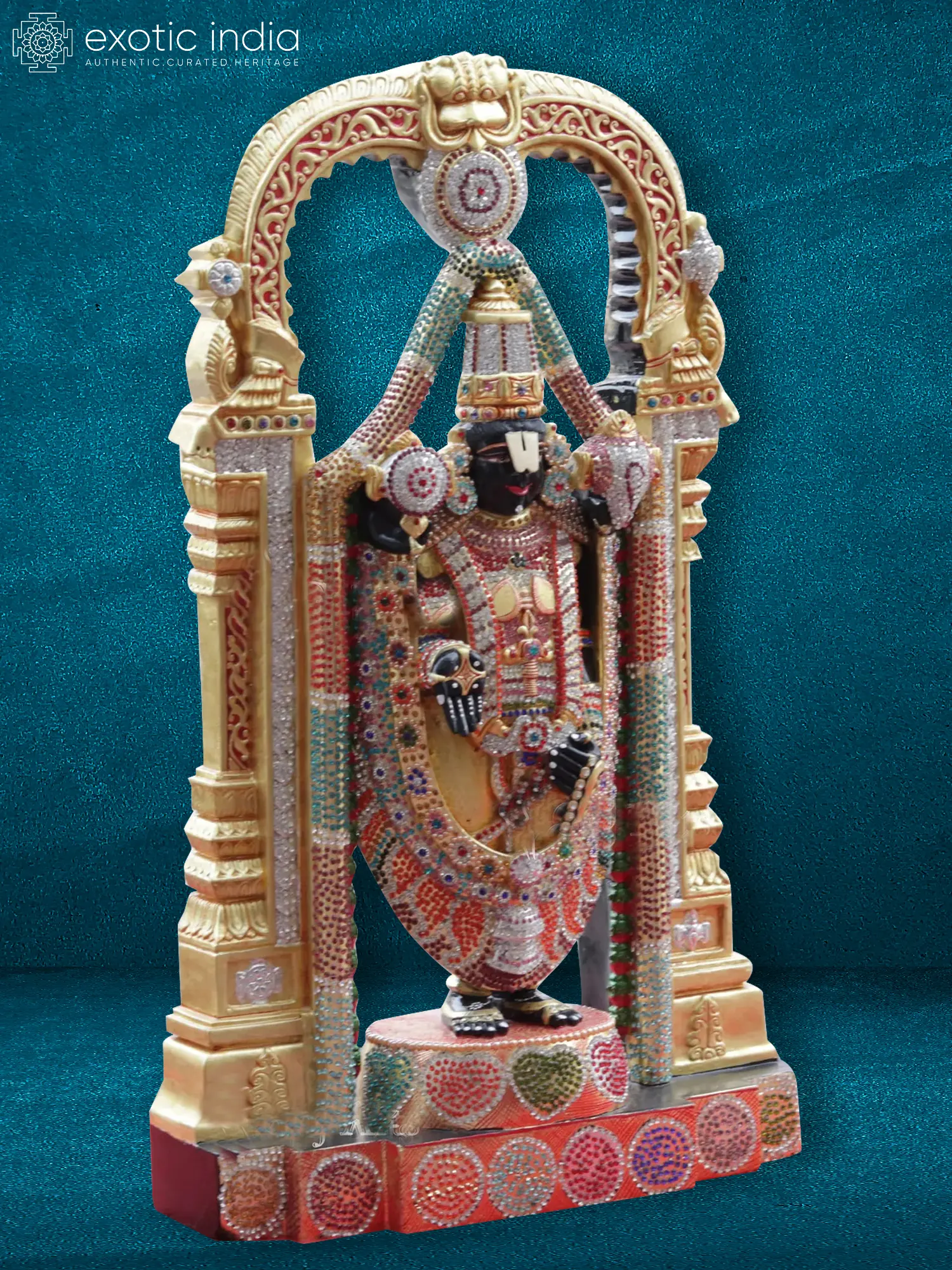 Bring the sacred aura of Tirumala into your home with this magnificent sculpture of Lord Venkateswara, affectionately known as Balaji or Srinivasa. Crafted from exquisite Rajasthan black marble, this divine representation embodies the divine grace and benevolent power of the Lord of the Seven Hills. The deep, lustrous black marble serves as a potent symbol of the cosmic darkness from which creation emerges, and upon which Lord Vishnu, in his form as Balaji, presides. The artistry extends beyond the choice of material. The entire sculpture is adorned with a dazzling array of meticulously placed crystals and gemstones, reflecting the traditional decorations that adorn the idol at the Tirumala Venkateswara Temple. These sparkling embellishments capture and refract light, creating a mesmerizing effect that speaks to the opulence and spiritual richness associated with this revered deity. The intricate detailing in the ornamentation, from the divine tilak on his forehead to the cascading necklaces and armlets, reflects a devotion that has been passed down through generations. The central figure of Lord Balaji stands tall within an ornate golden arch, symbolizing the sacred gateway to the divine realm. This architectural element, also richly embellished, frames the deity and emphasizes his celestial majesty. The posture of the Lord, with his right hand raised in blessing (abhaya mudra) and his left hand resting on his hip (katyavalambita mudra), conveys a sense of both protection and unwavering strength. He is often depicted holding his divine discus (Sudarshana Chakra) and conch shell (Panchajanya), symbols of his supreme power and cosmic order. Lord Balaji is a highly revered deity in Hinduism, particularly in South India. Legend has it that he appeared on the Venkata hill to save mankind from the trials and tribulations of the Kali Yuga. His devotees believe that a darshan (auspicious sighting) of his form, especially at Tirumala, can bestow immense blessings, alleviate suffering, and grant spiritual fulfillment. The tradition of adorning the deity with precious jewels and vibrant silks is a reflection of the immense love and gratitude his followers feel. This sculpture seeks to capture that same spirit of devotion and reverence. This substantial, handcrafted piece is more than just a decorative item; it is a powerful conduit to spiritual energy. Its imposing presence and intricate beauty make it a focal point for prayer and meditation, inviting peace, prosperity, and divine blessings into your living or sacred space. The enduring quality of the black marble, sourced from the rich quarries of Rajasthan, ensures that this divine embodiment will remain a cherished heirloom for years to come, a testament to faith and exquisite craftsmanship.