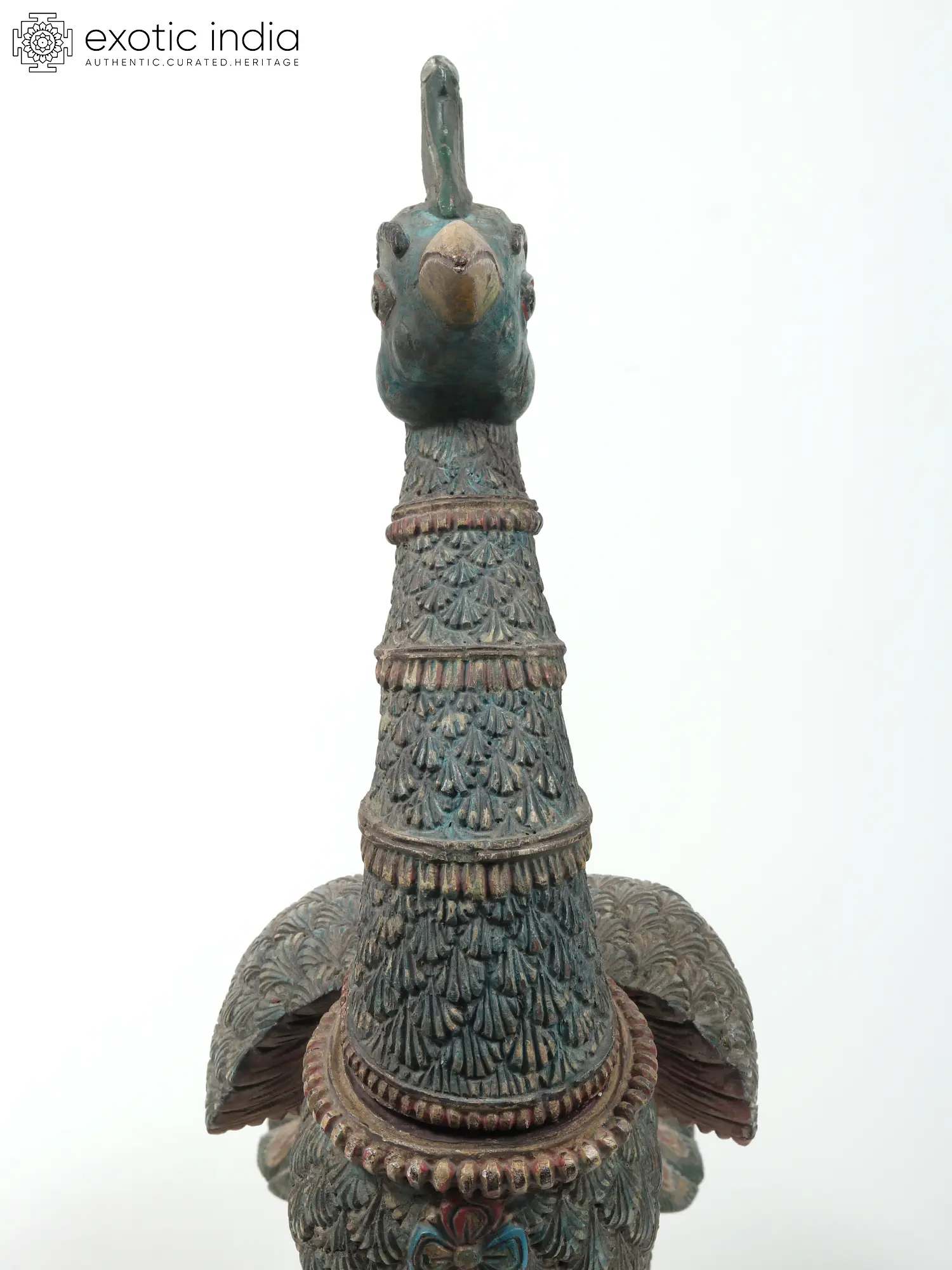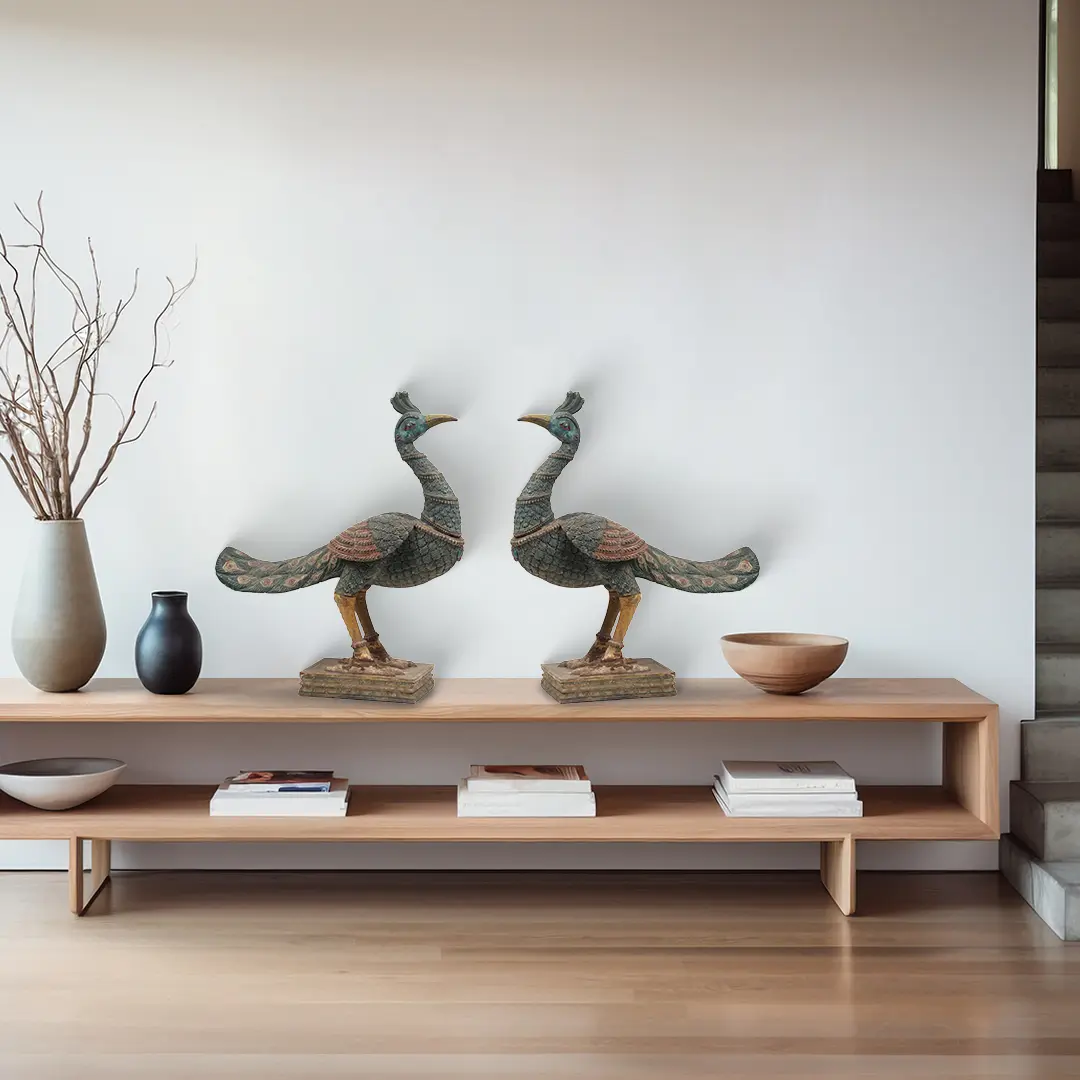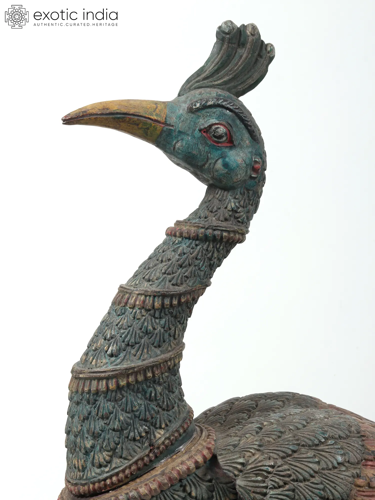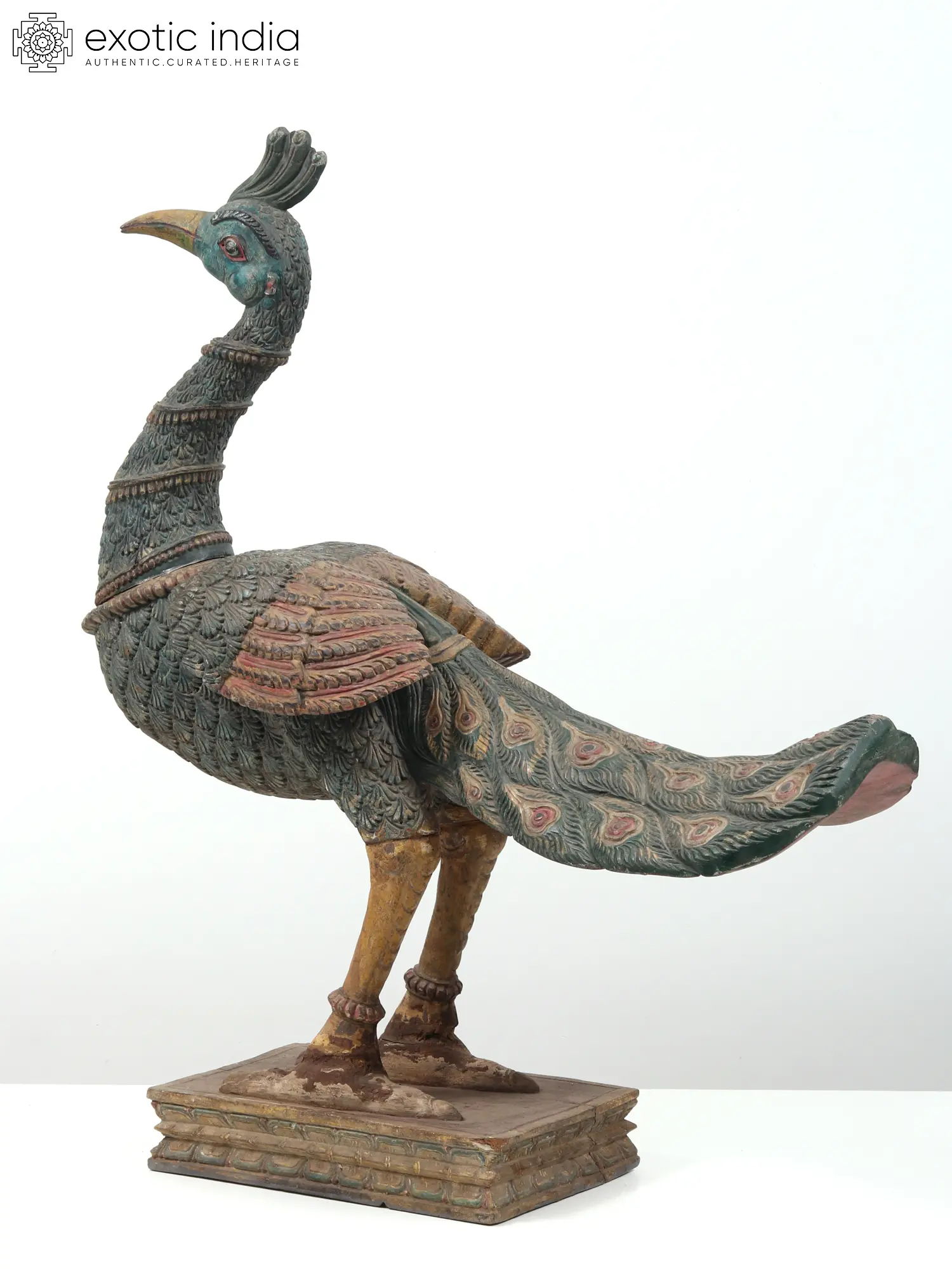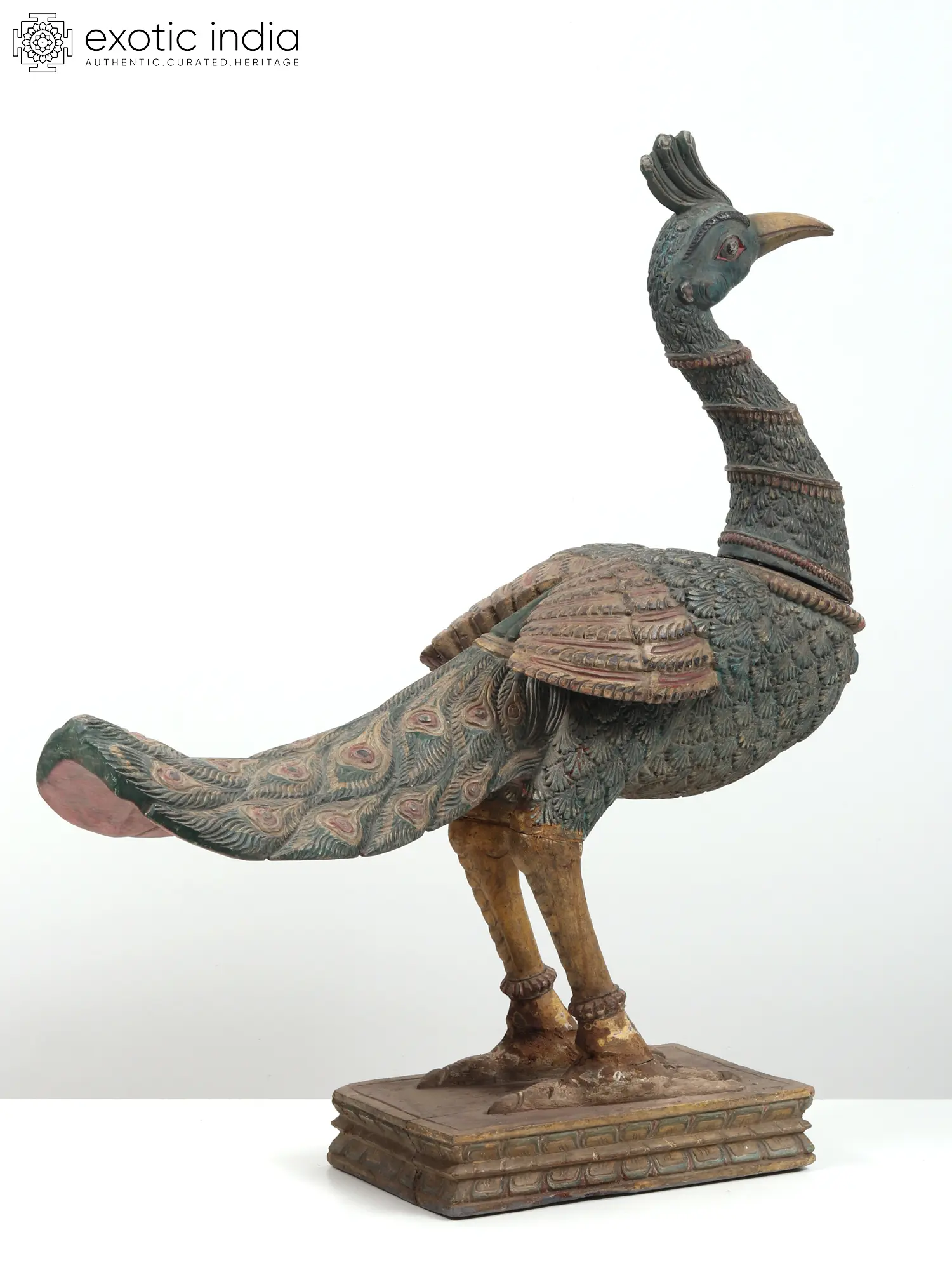 With its distressed paint, and the finely carved scales and feathers, the statue evokes the aura of ancient temples, making the peacock appear alive as if emerging from the hallowed walls. This artistic piece not only pays homage to the historical significance of peacocks in Indian art but also breathes new life into the tradition. It serves as a testament to the enduring allure of peacock motifs, celebrating the timeless beauty and cultural resonance of this majestic bird within the vibrant tapestry of Indian artistic heritage.