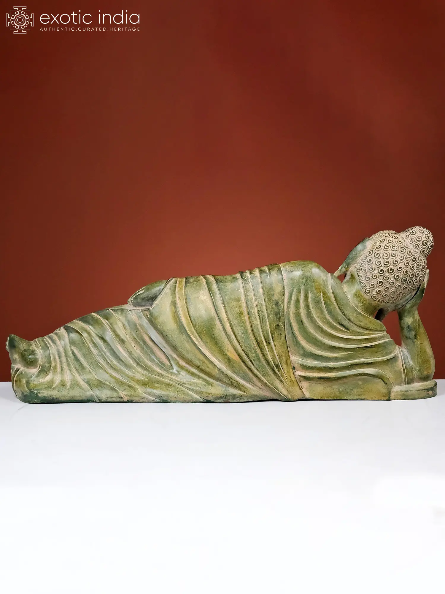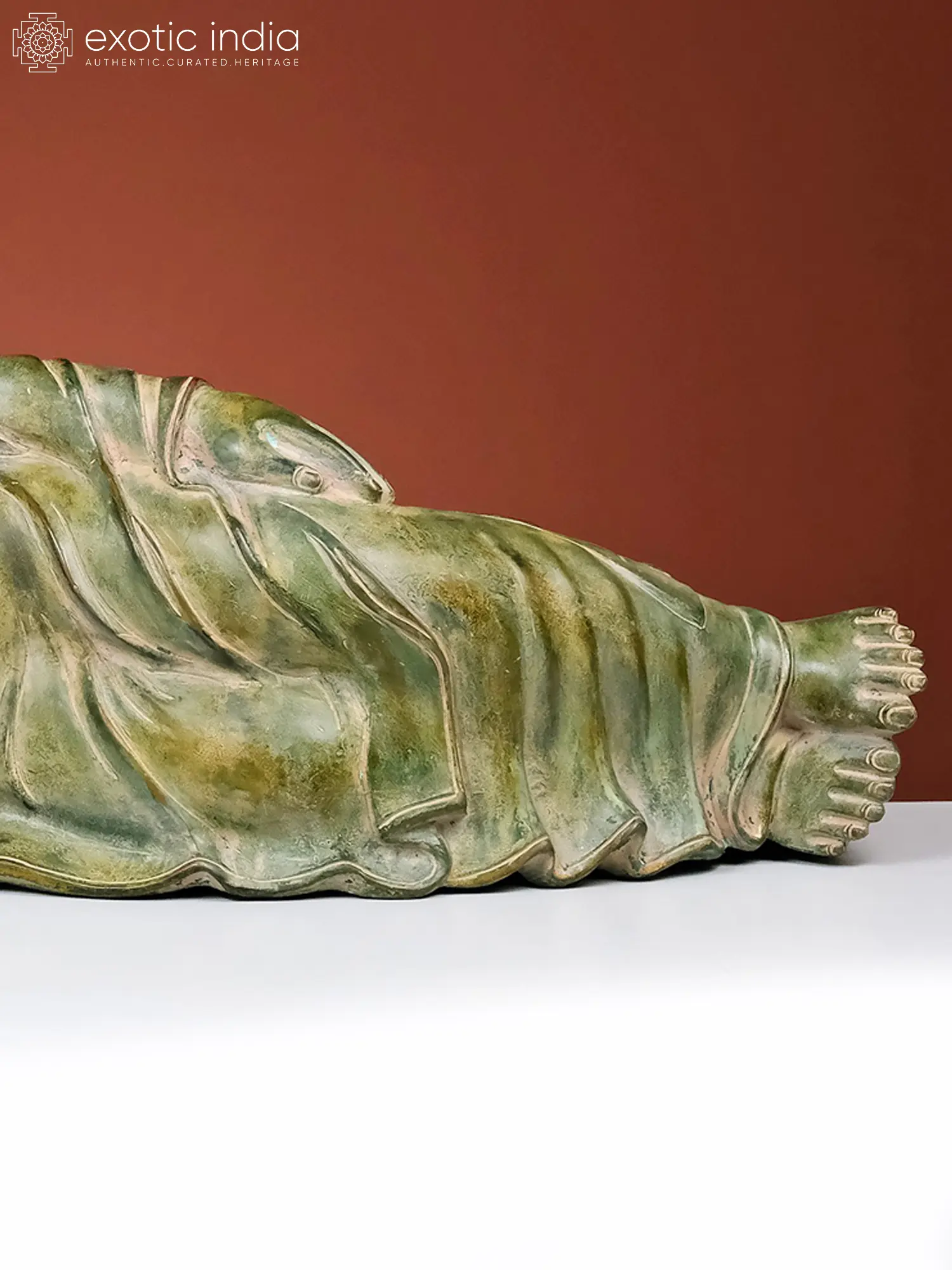 This magnificent brass sculpture captures the profound moment of the Buddha's Parinirvana, his final passing into nirvana. The figure reposes in a posture of deep tranquility, head gently supported by a raised arm, and eyes closed in peaceful contemplation. The intricate details of the urna on his forehead, a symbol of his divine insight, and the subtle curls of his hair, reminiscent of the legendary Ushnisha atop his head, speak to the masterful craftsmanship. The flowing robes are rendered with remarkable realism, each fold and pleat conveying a sense of soft, draped fabric, enhancing the peaceful aura of the sculpture.
