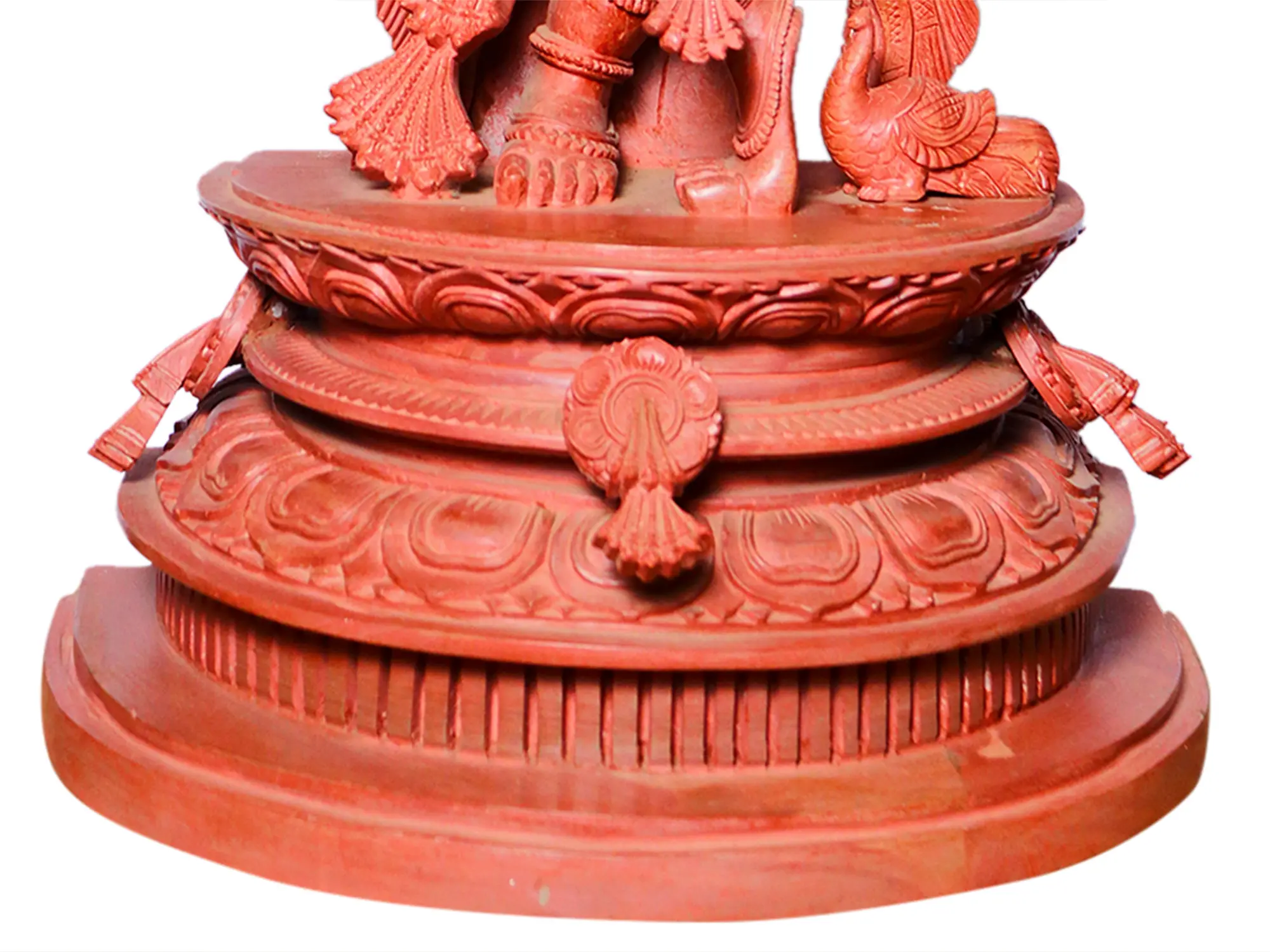 Immerse your space in the divine aura of Lord Krishna, captured in a magnificent 30-inch statue carved from exquisite red stone. This breathtaking sculpture depicts the beloved deity in his most iconic form, playing his divine flute, a symbol of transcendental music and spiritual awakening. The rich, earthy hue of the red stone lends a sense of groundedness and ancient wisdom to this captivating piece, making it a focal point of devotion and artistry.