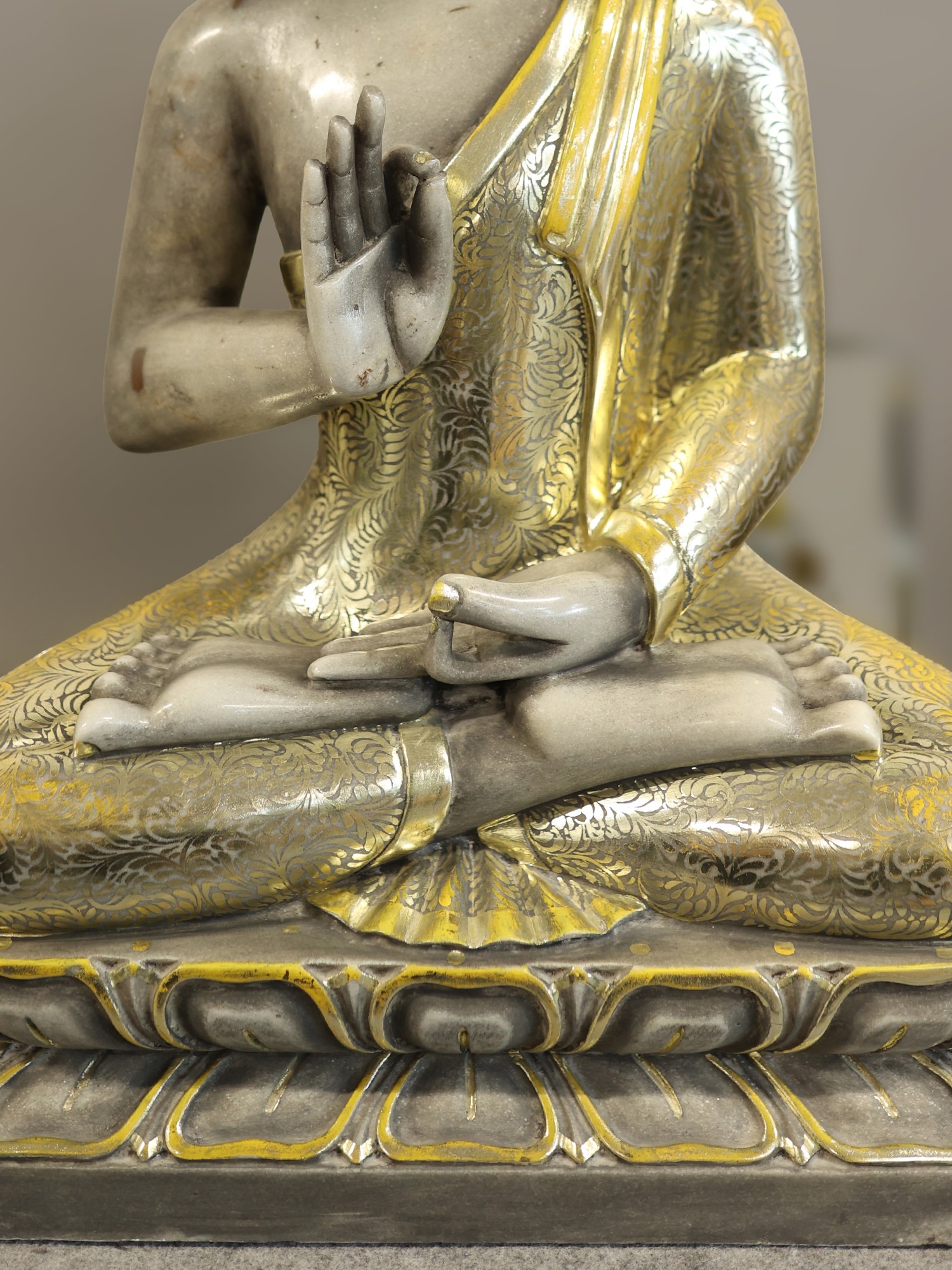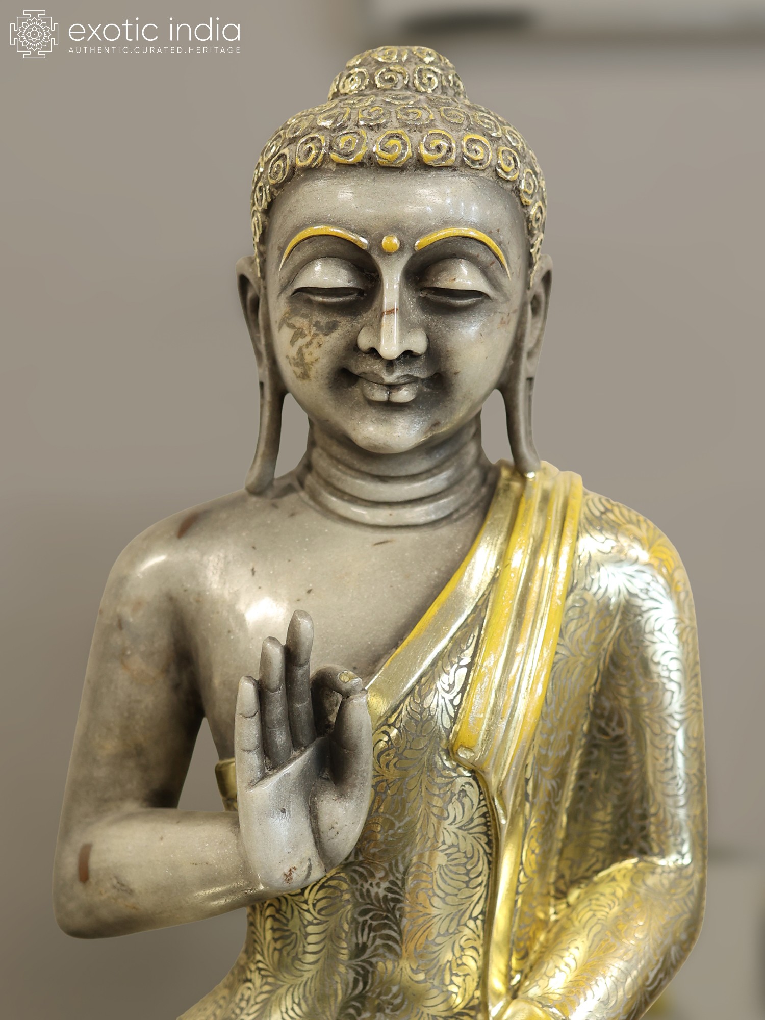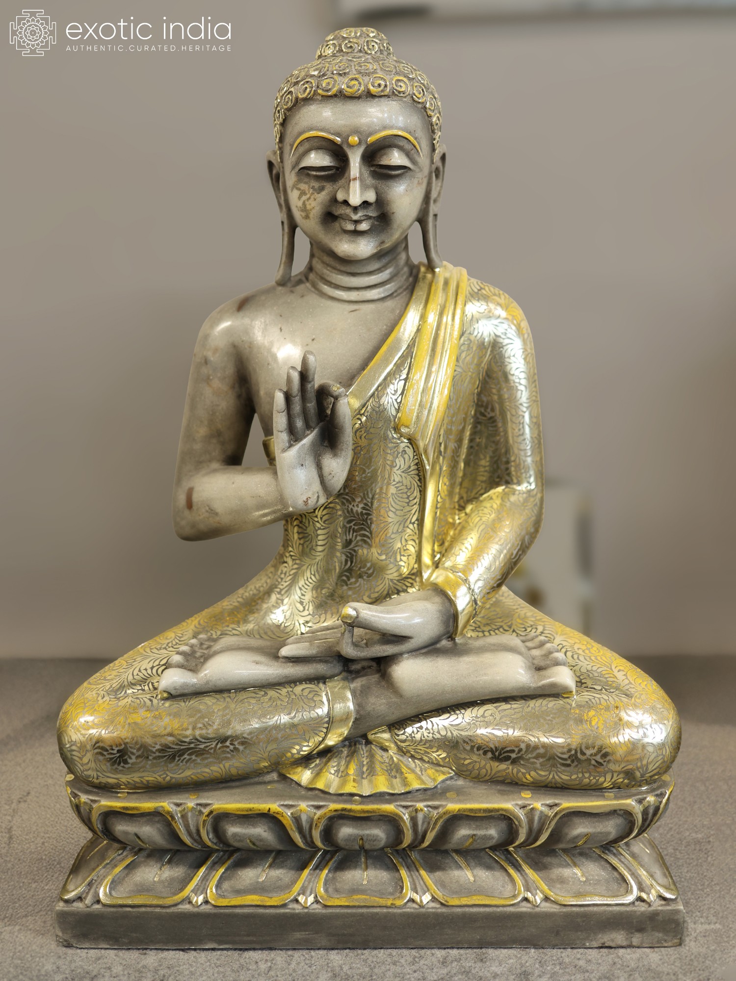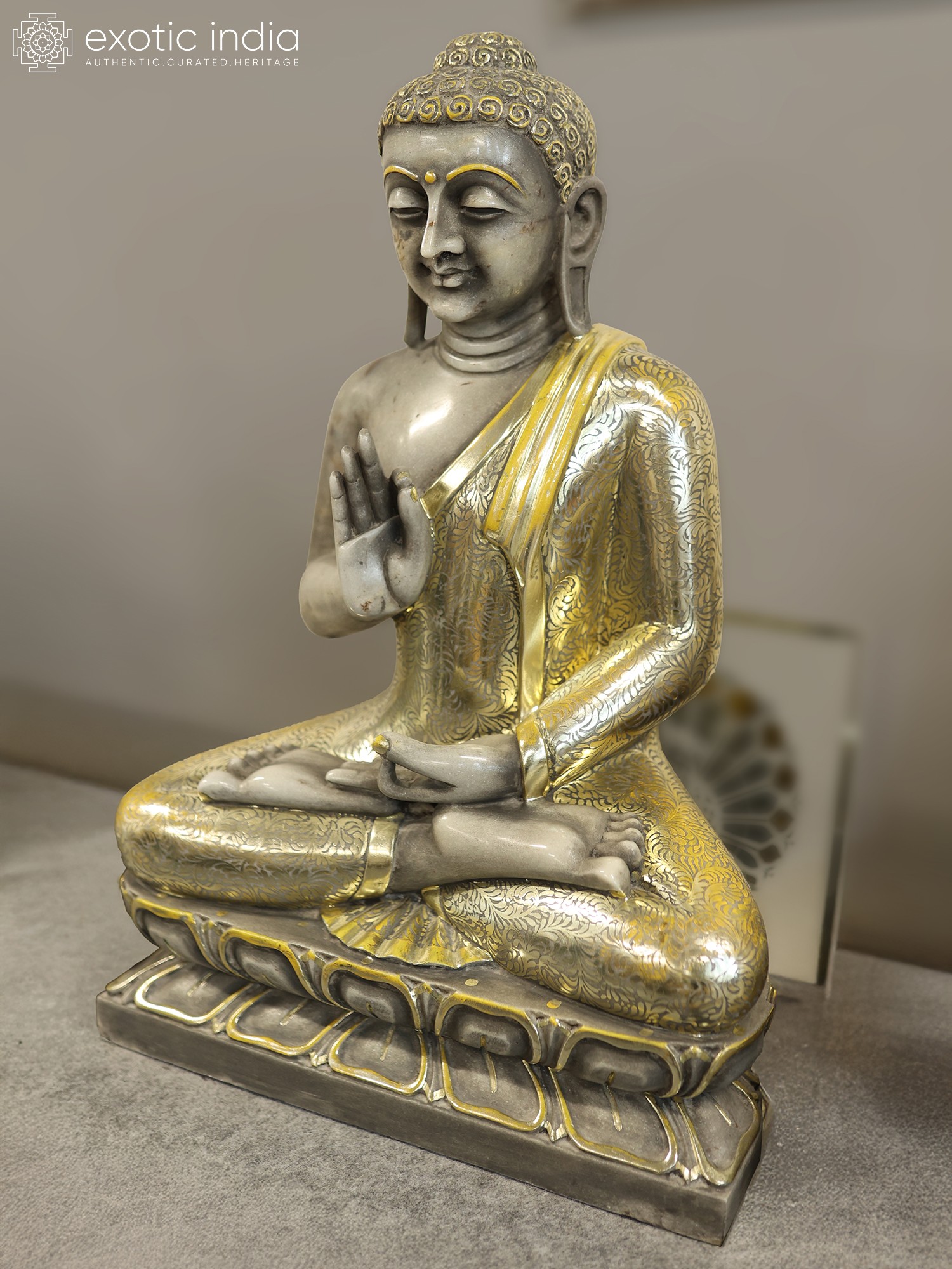 Standing at an impressive thirty inches, this representation commands attention with its substantial yet elegant presence. The Vitarka Mudra, a gesture of teaching and argumentation, is captured with serene clarity, symbolizing the Buddha's boundless knowledge and compassion. The flowing folds of the saffron robe are adorned with delicate, hand-applied golden patterns, catching the light and adding a luminous dimension to the cool marble.