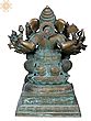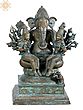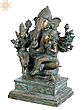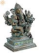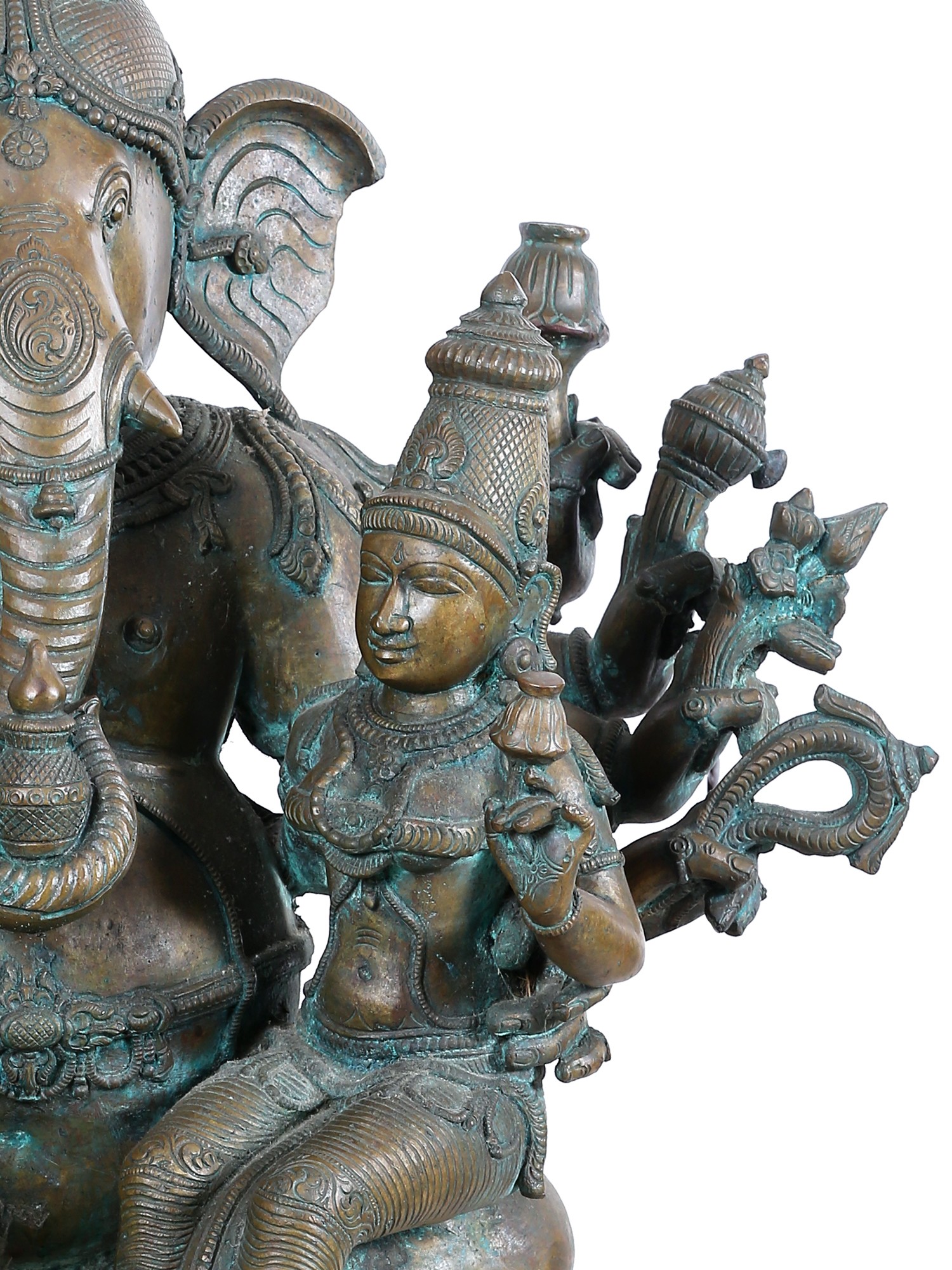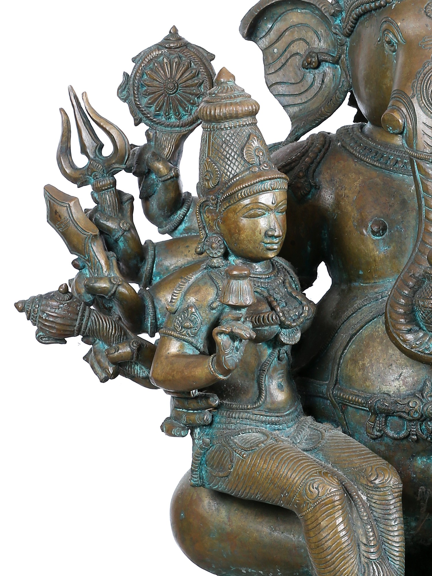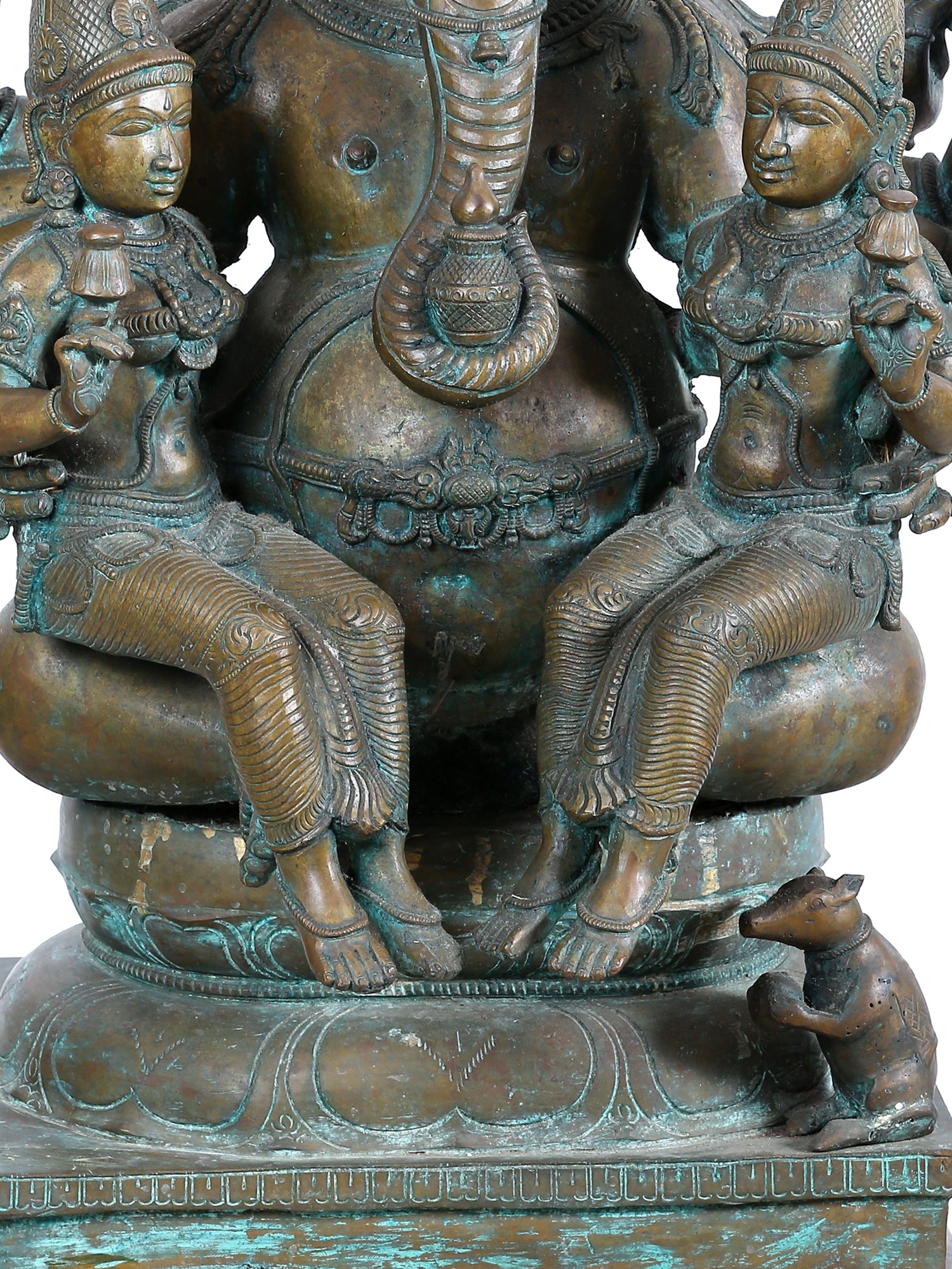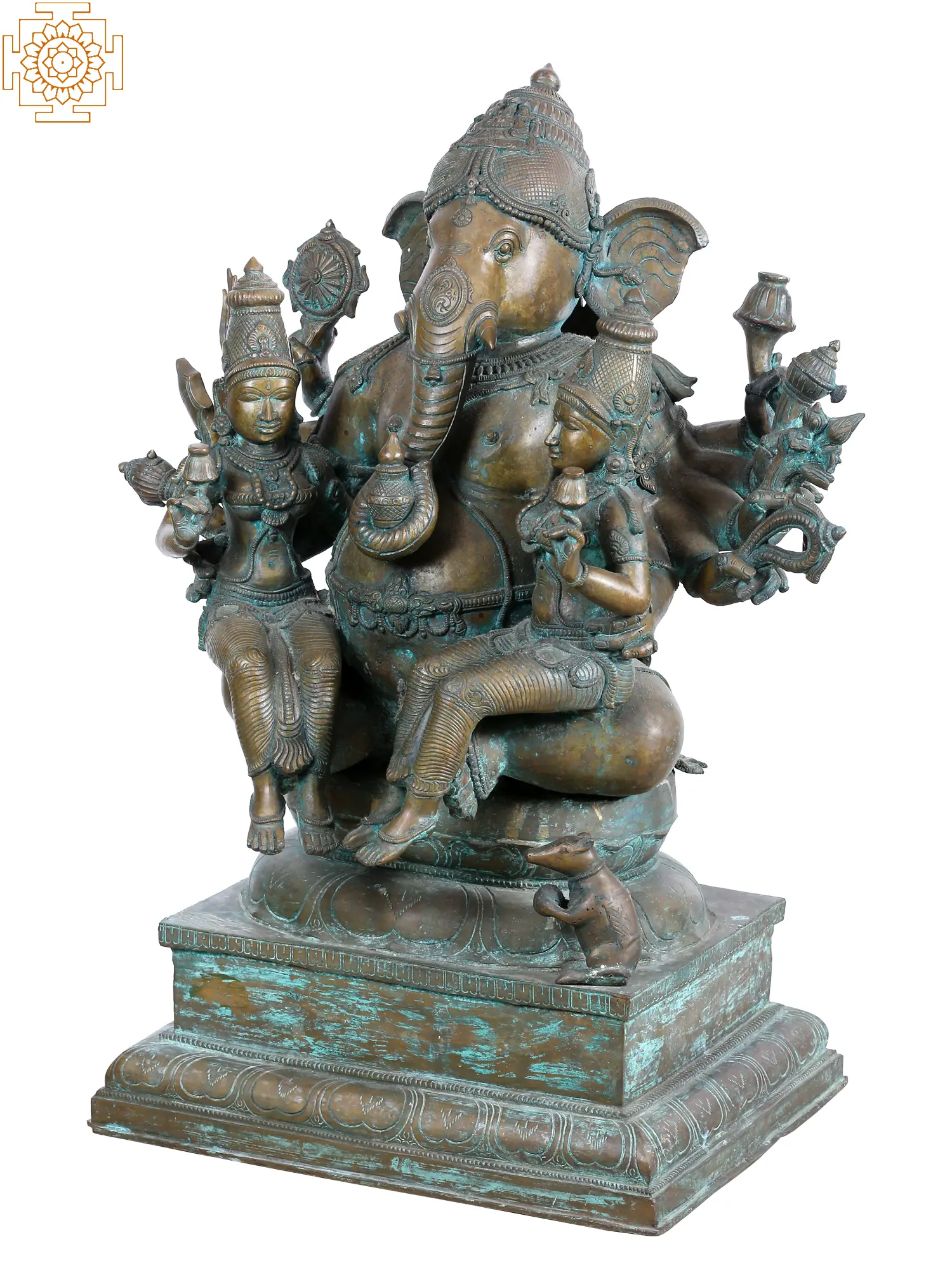 Seated on a dual-bloomed lotus Padma (lotus), supported by a plinth - this idol of Lord Ganesha is of him in the avatar of Maha Ganapati. One of the 32 forms of Lord Ganesha as mentioned in the Ganpatyic text of Mudgala Purana - he appears with his wives Riddhi and Siddhi sat on his left and right thighs subsequently as he embraces them; also his mount Mushaka, holding his favorite delight - Modaka. This piece is unique for its ornate edges and jewelry work, with what meets the beauty of your eyes.