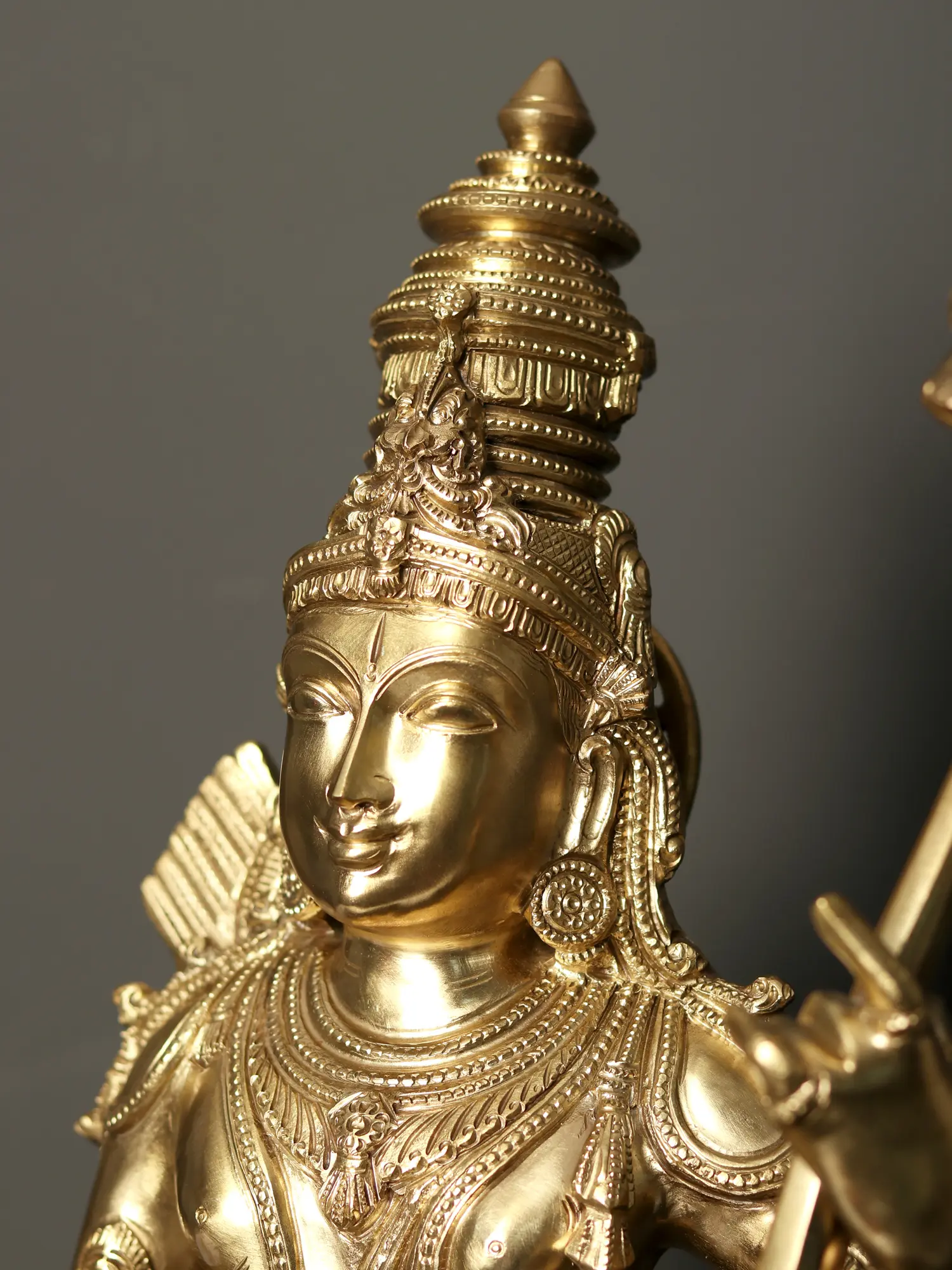 An artistic ode to the divine benevolent one, the valiant one, and the most ideal man- “Maryadapurushottama” Sri Rama, this splendid Panchaloha bronze statue allures the onlooker with its aesthetic brilliance. Rama is presented at the prime of youth, standing contrapposto, which accentuates the gracefulness of his celestial body. Adorning his Sun-like face, is a towering Kiritamukuta crown, along with round earrings, exquisite necklaces, Yajnopavita, and a heavy waist belt clasping his short dhoti. With one hand raised in Abhaya mudra, Rama holds his bow “Kodanda”, and stands on a beautiful lotus pedestal, which is guarded by a miniature idol of Lord Hanuman, placed on a separate platform, in Anjali-mudra, bowing to the might of the pleasantly smiling, lotus-faced incarnation of Vishnu.