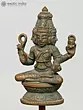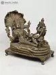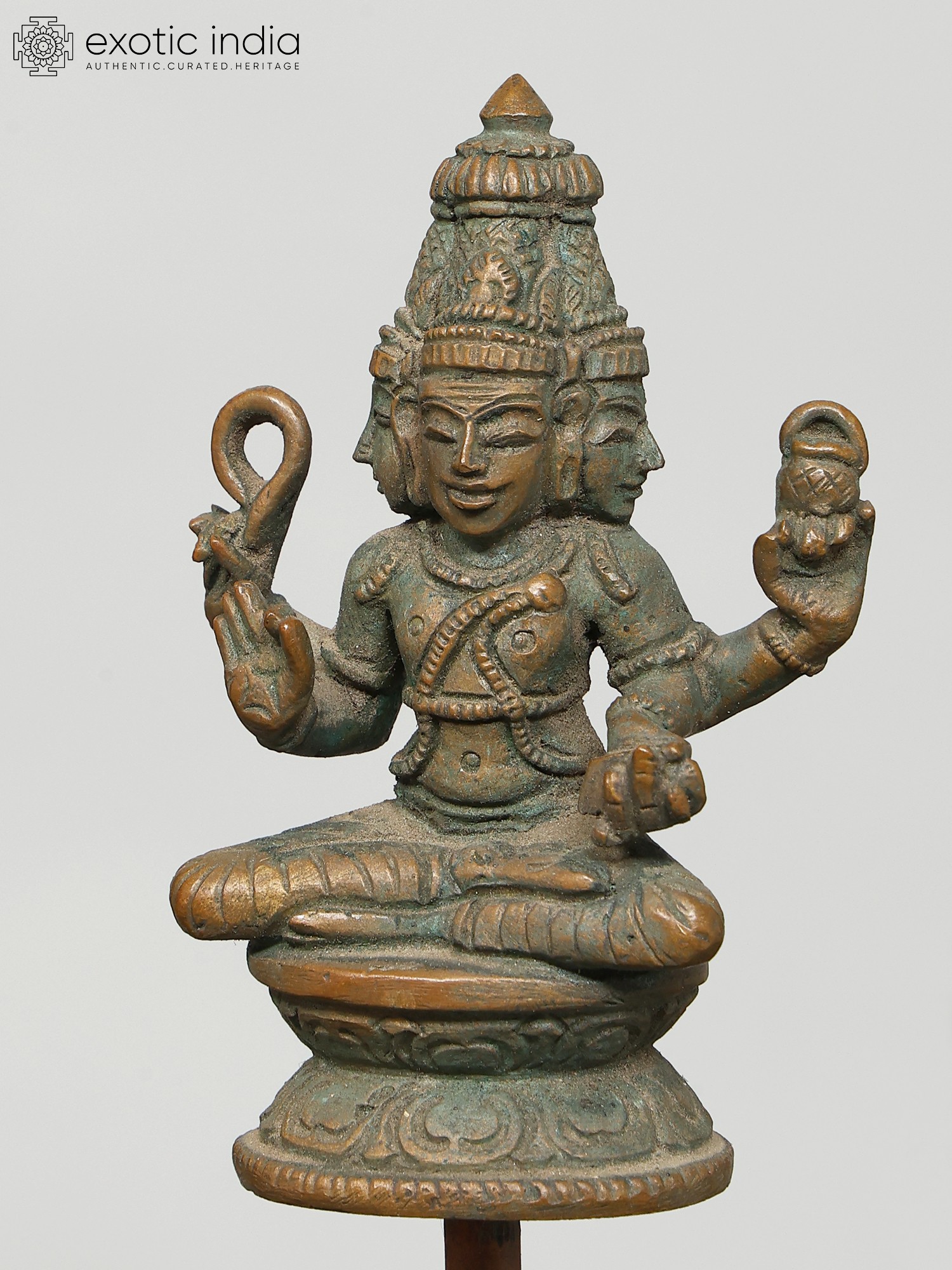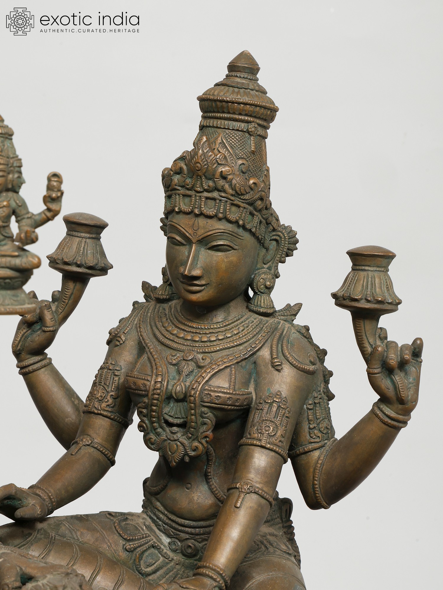 From his navel sprouts the lotus on which Brahma is enthroned, his miniature icon finely sculpted with a smile visible on his face. Serving the Lord of three realms is Devi Lakshmi, the Chaturbhuja or four-armed goddess of auspiciousness and wealth, her hands reaching Vishnu’s feet and the benevolent smile on her beautiful face animating the composition. The sculpture is placed atop a pedestal with Simha or lion feet. Sculpted in a rounded manner, the bronze masterpiece has immaculate details on the reverse, allowing the viewer to immerse themselves in the Darshana of Vishnu-Loka.